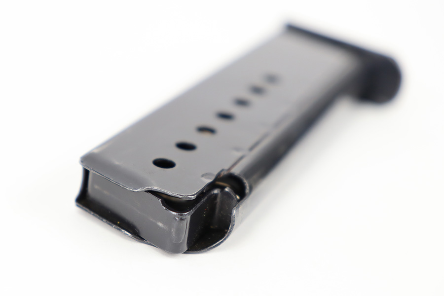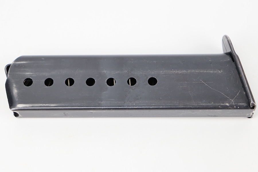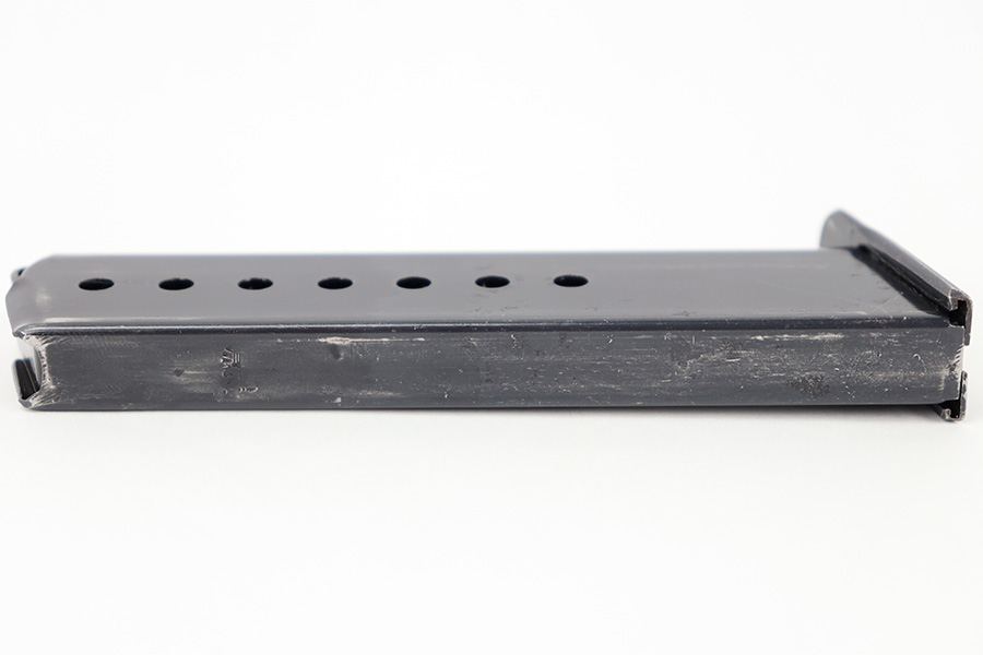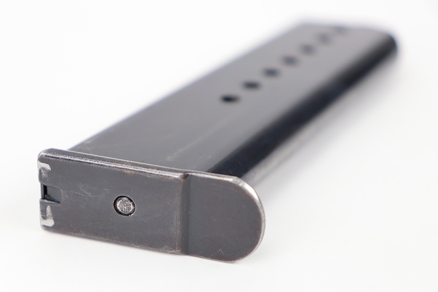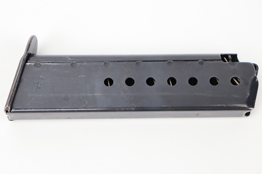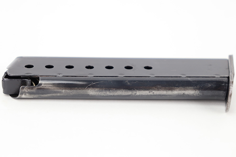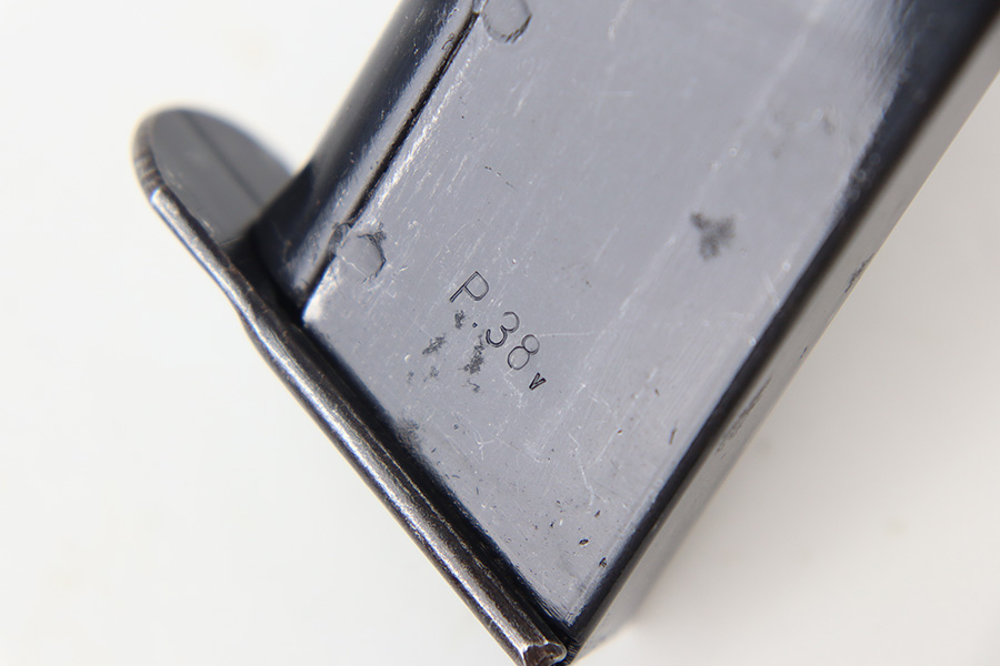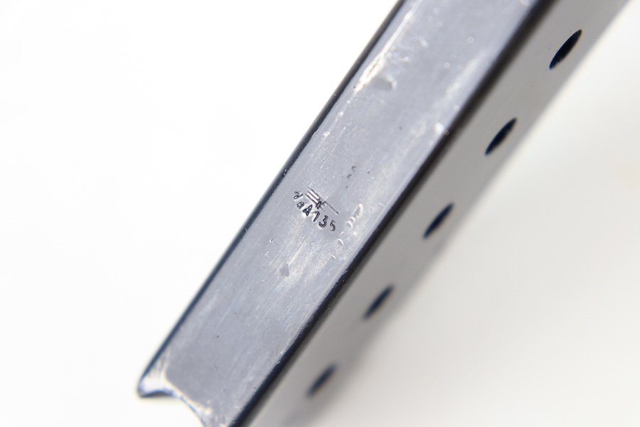 12/18/23 – This is an original, later wartime production Mauser P.38 magazine. The magazine is stamped with a waffen WaA135 proof on the spine, and a P.38v stamp on the left side of the tube. Most of the original finish is intact with some light surface speckling and areas of patina throughout. Strong, functional spring.
