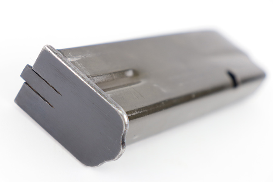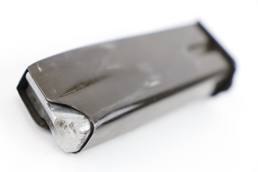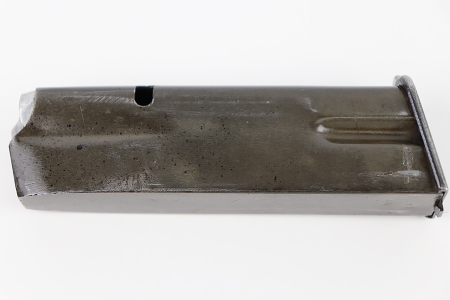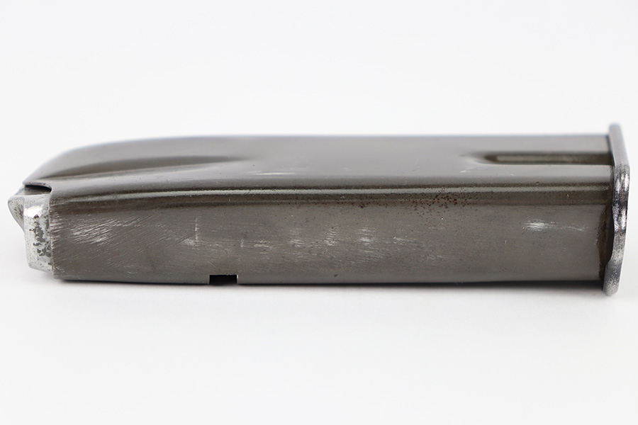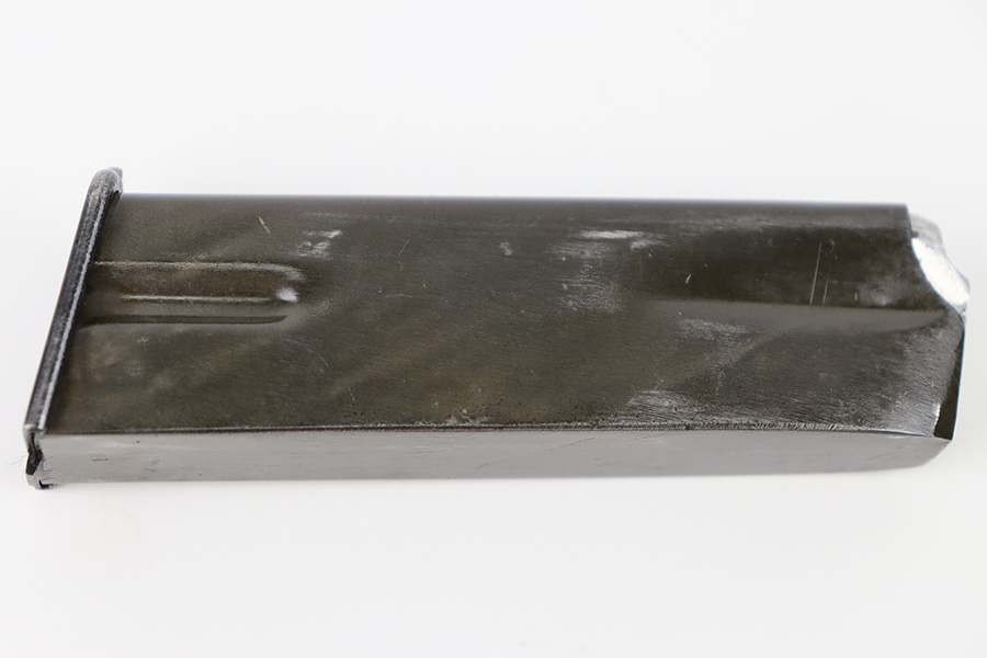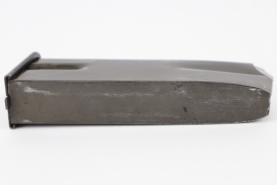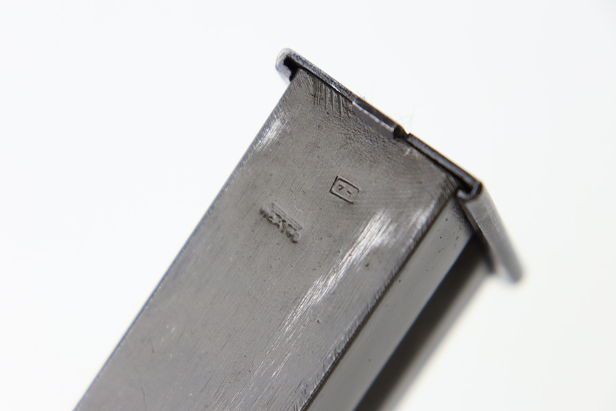 10/10/23 – This is an original WW2 production FN Browning High Power magazine. The magazine has a phosphate tube and blued base. The spine of the magazine is stamped with a waffen military proof stamp WaA140. There’s some mild surface patina and finish loss on the tube, but overall the magazine is excellent with a fully functional spring.