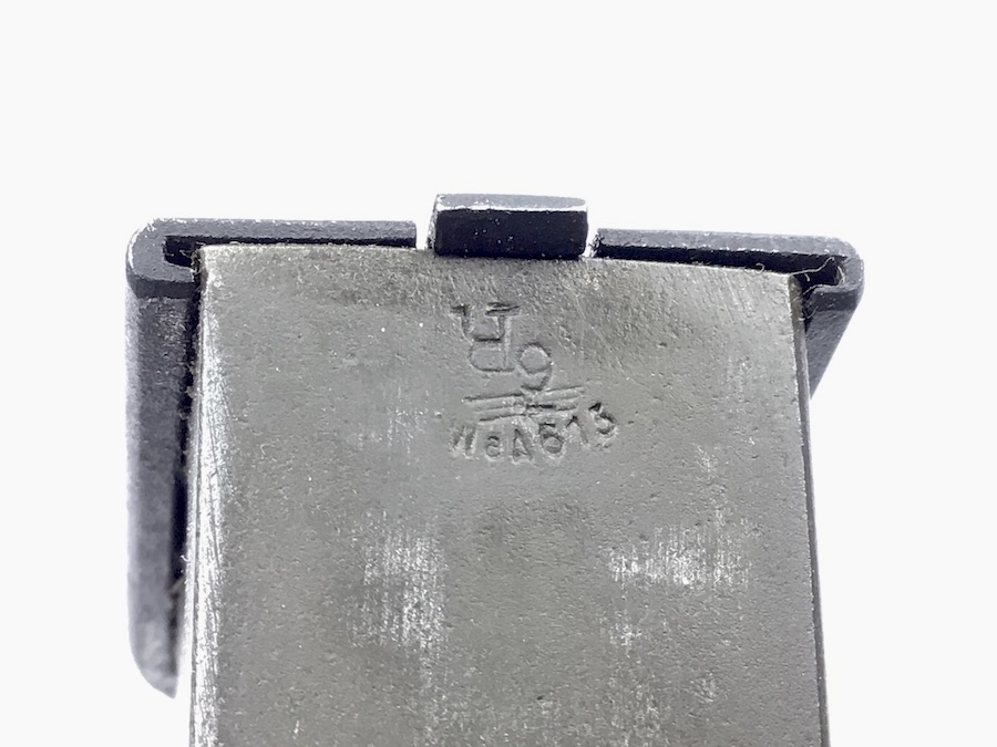 12/17/20 – This is an original, and early WW2 era waffen proofed Browning High Power Magazine. The spine of the magazine has a distinct and rare waffen eagle WaA613 proof stamp. The magazine has no rust or pitting. The spring is strong and fully functional. Guaranteed original and authentic from WW2.