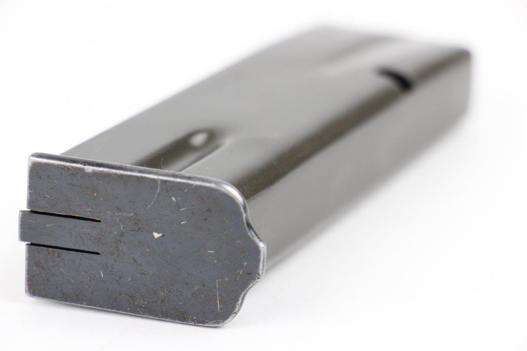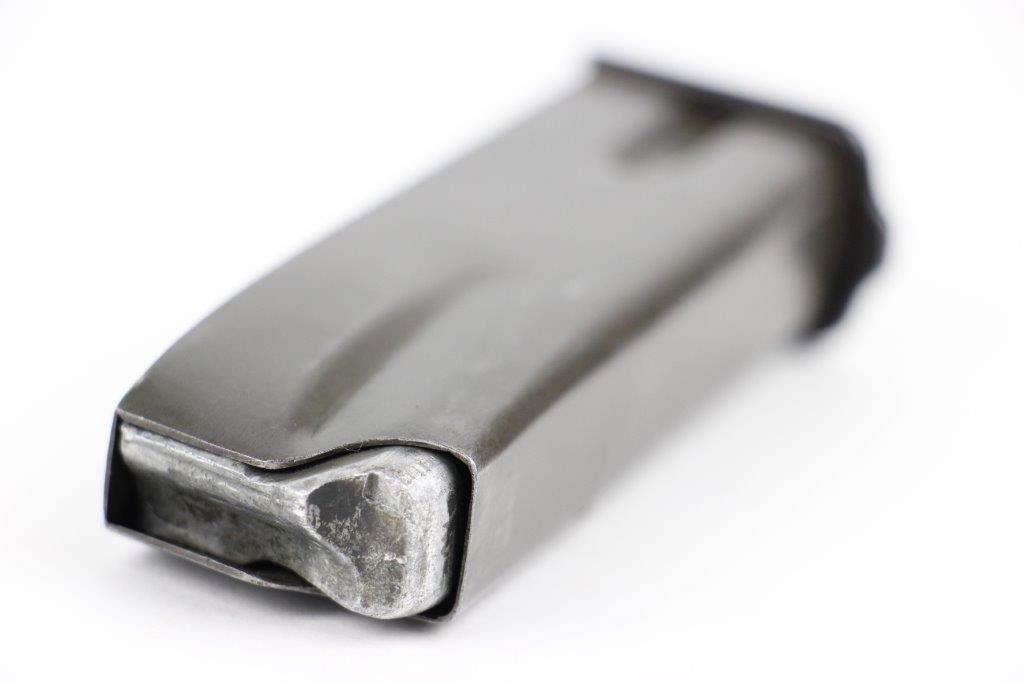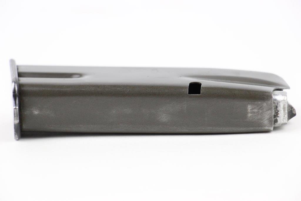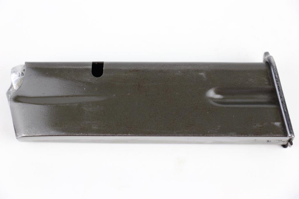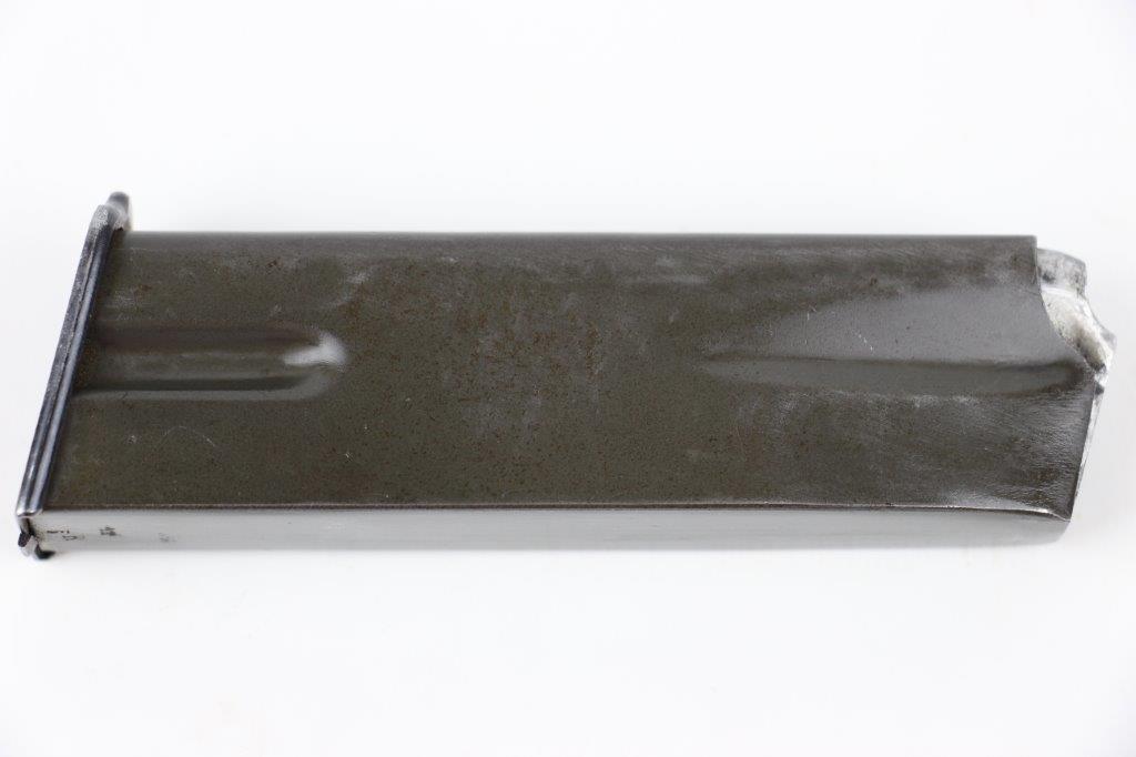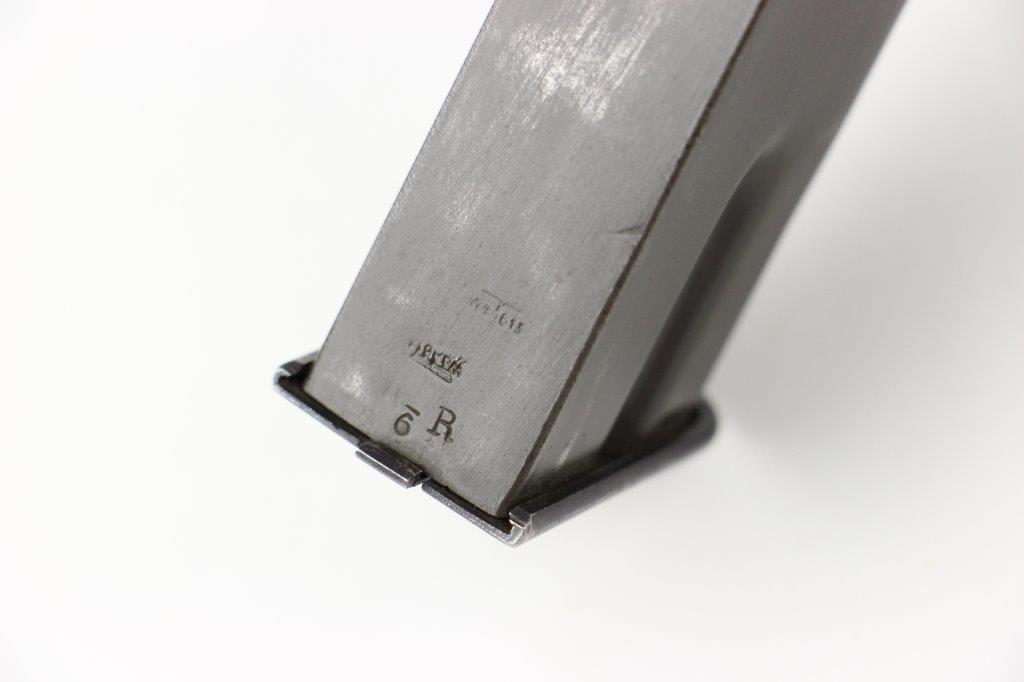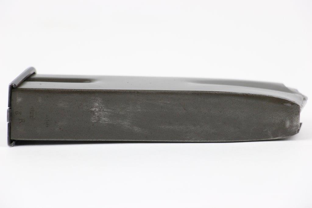 5/24/24 – This is an original early Nazi occupation FN High Power magazine from WW2. The magazine has a phosphate tube and blued base. Near-excellent condition with only mild surface wear and minimal finish loss. The spring is strong and fully functional. The spine is stamped with two small waffen military proof stamps, the clearer (more crisp) stamp shows a WaA613 code, which is the earliest and most desirable variation of Nazi proofed High Power magazines.