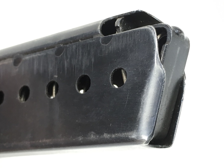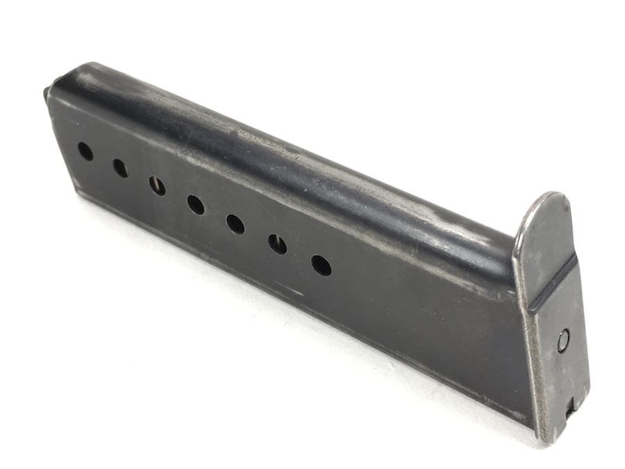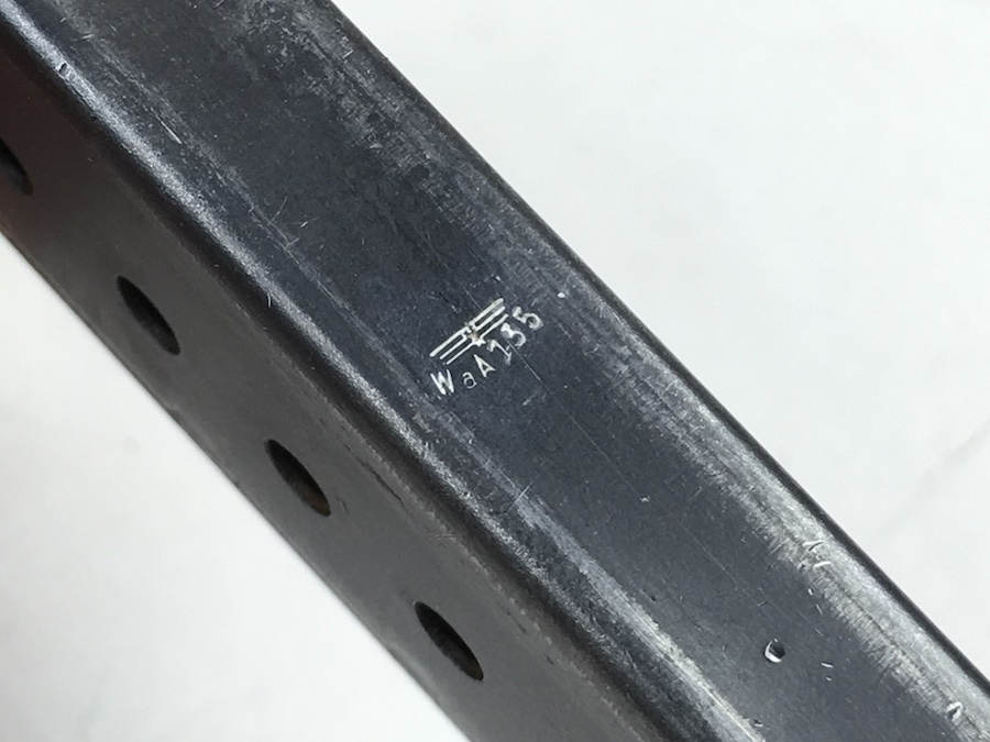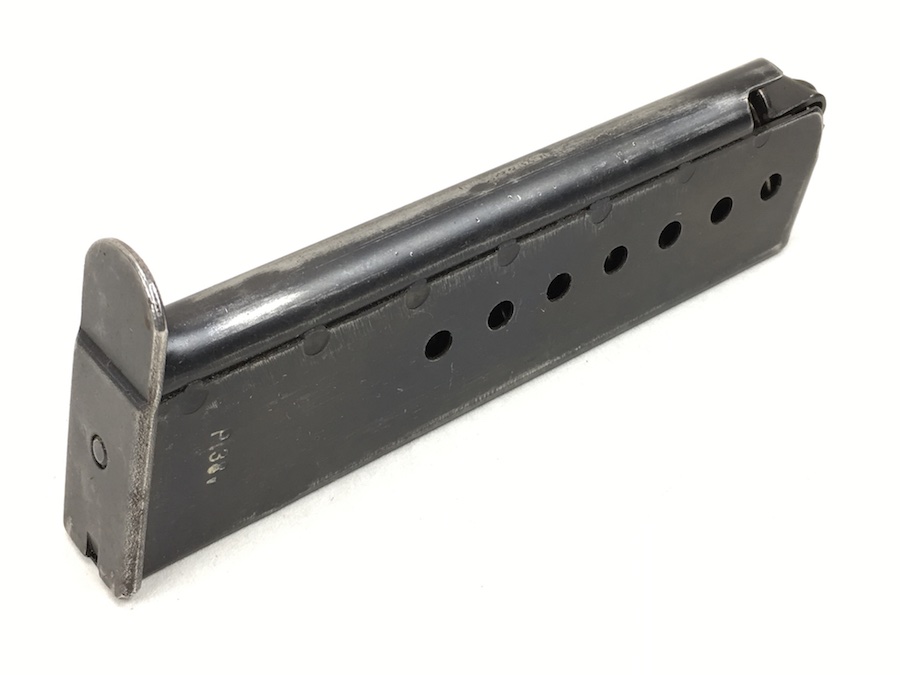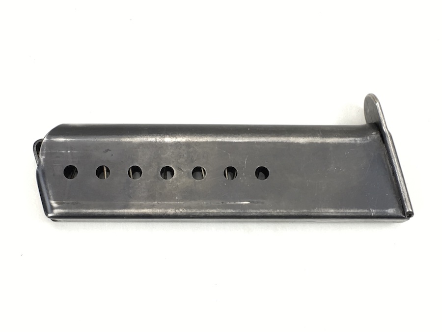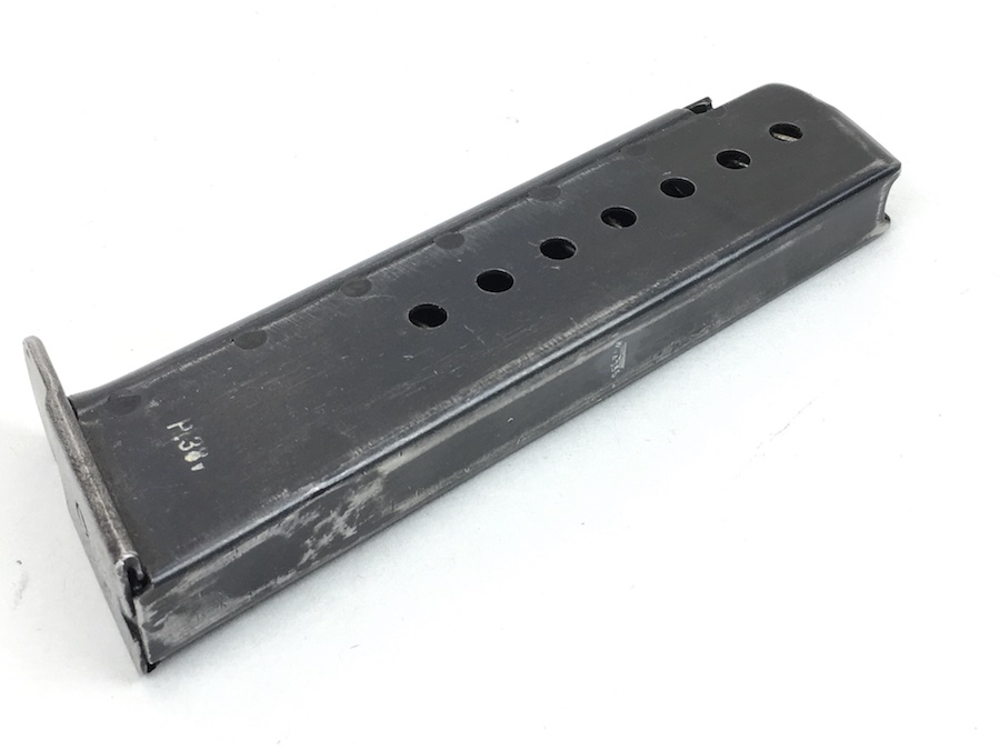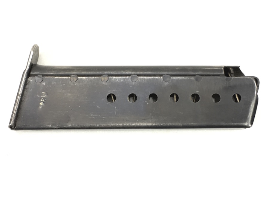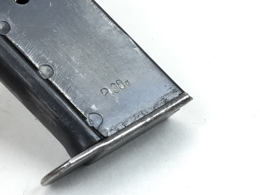 7/7/19 – This is an original WW2 era Mauser P.38 magazine. The spine of the magazine is waffen proofed with a E/WaA135 proof marking. One side of the frame is marked P.38v. No other markings. The blued exterior is very good with no rust or pitting. Excellent spring as well. Minor bluing wear. These magazines were produced from January 1944 until November 1944. Guaranteed original from WWII.