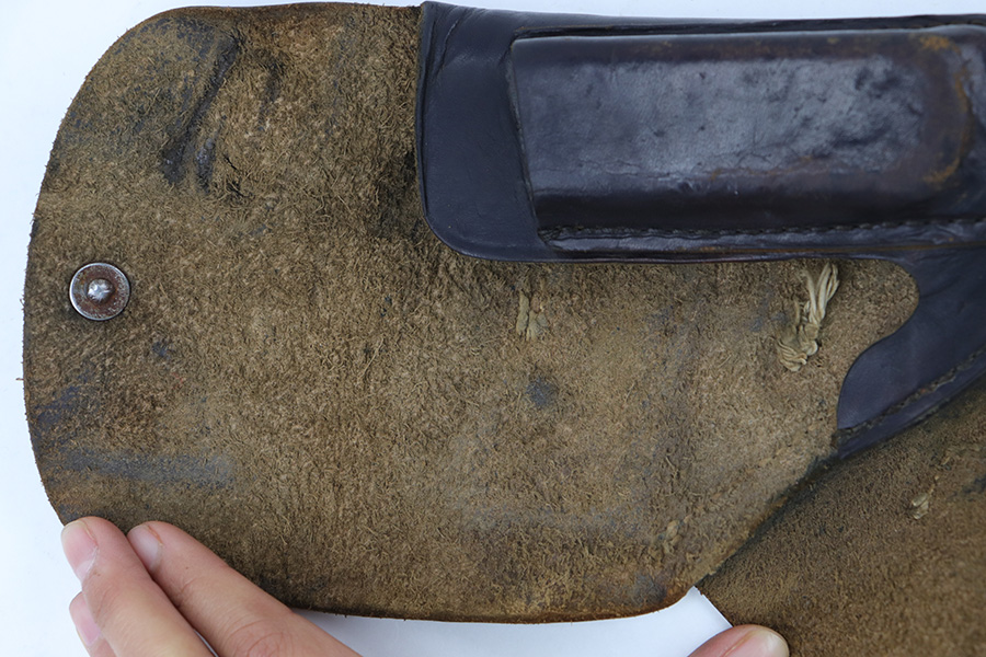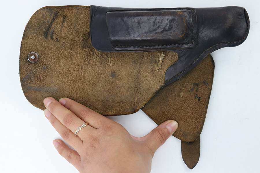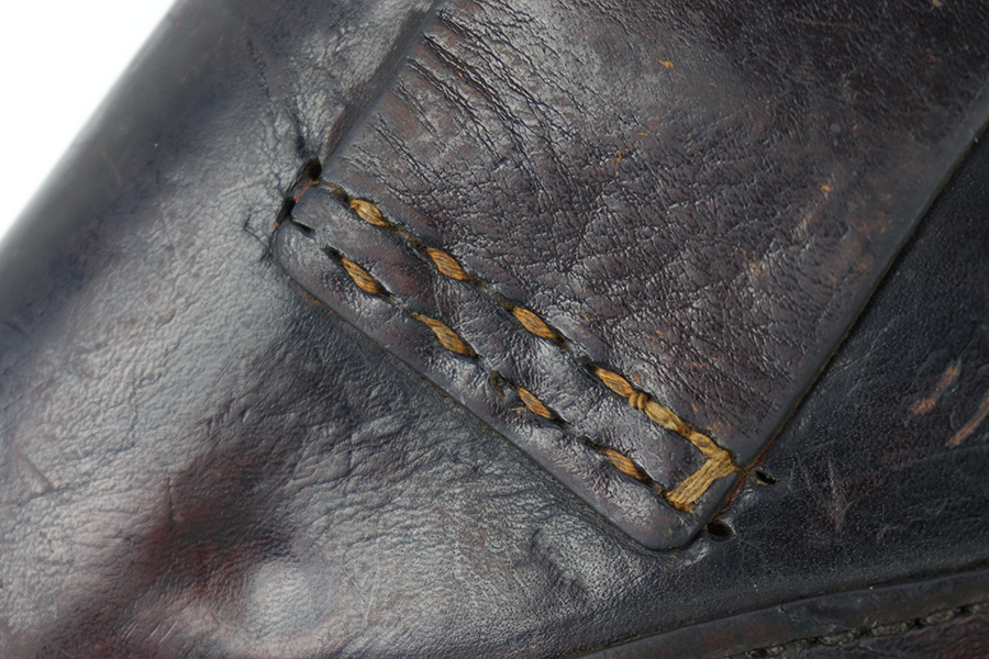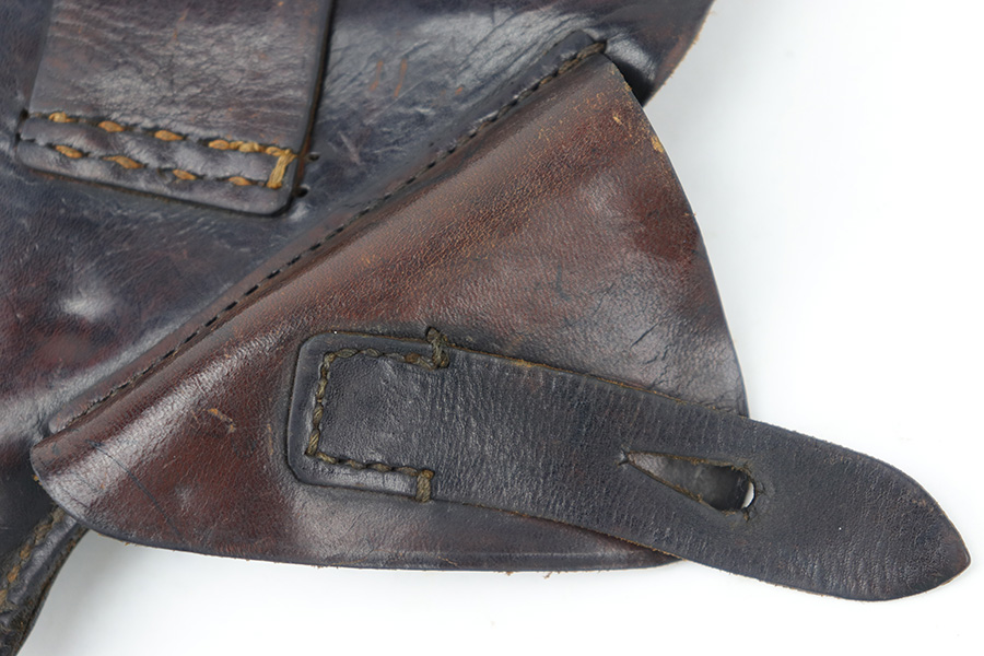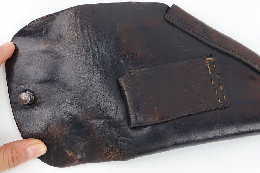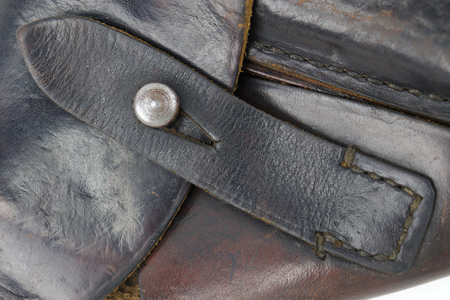 5/12/23 – This is an original, rare variation 7.65mm Axis pistol holster from WW2. The holster is stamped under the closure strap with a waffen eagle over WaA14 proof stamp. This military issued holster is a great size for a Sauer 38h, Mauser HSc, or Walther PP pistol. The holster leather has honest use wear and aging. The texture is soft with normal pliability. The stitching is in good condition but has a few notable flaws. First, the back belt loop has replaced stitching that is a different color than the rest of the stitching. This stitching doesn’t glow under a black light however, so is likely a period repair. The second notable flaw is some loose stitches on the side flap, but this doesn’t affect functionality and the side flap is still secure.