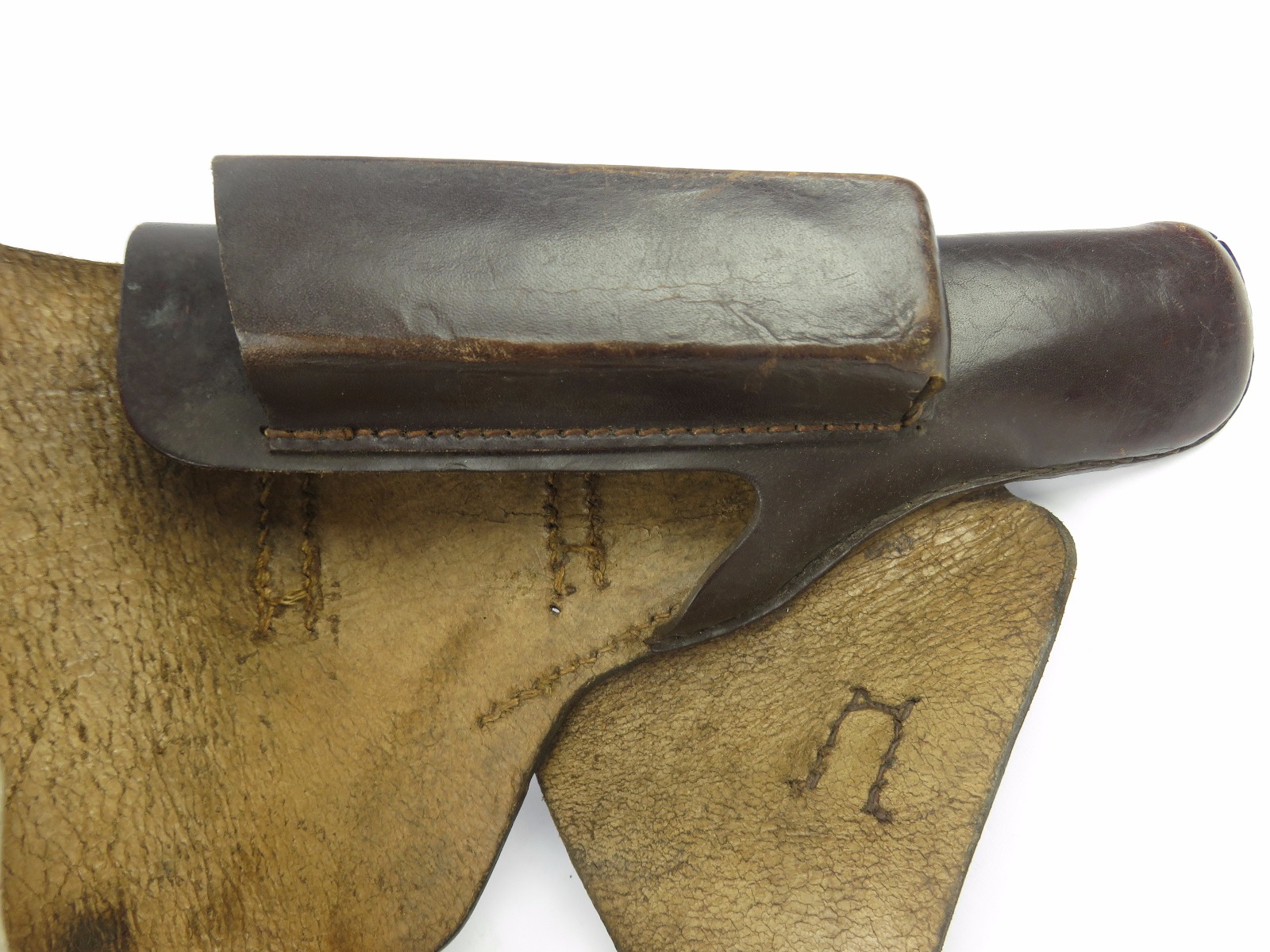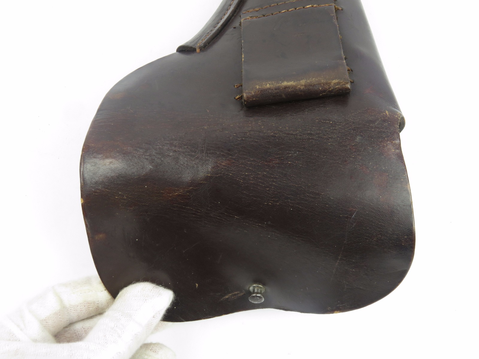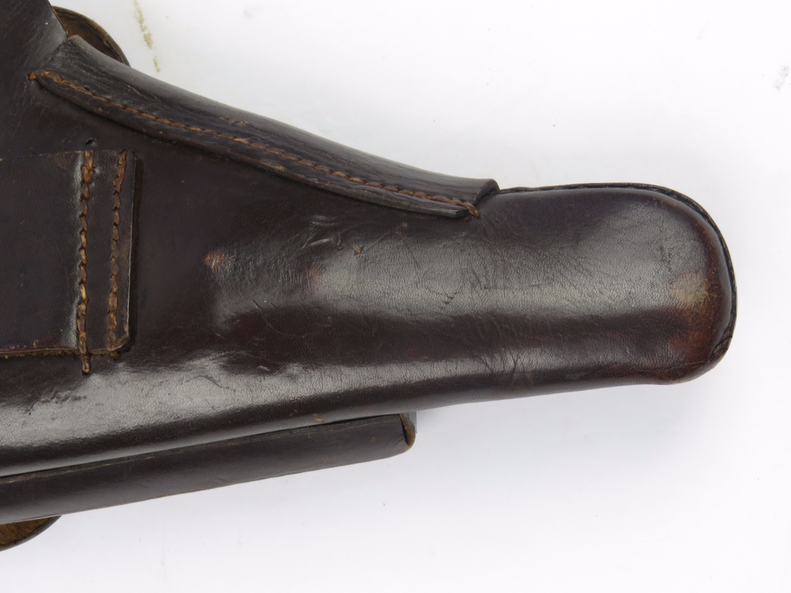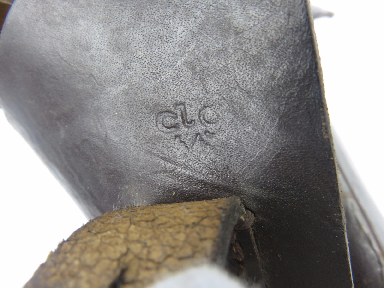 10/31/17 – This is an original WW2 production late war Hi-Power holster. The holster is maker stamped and dated under the closure strap “clg 44”. The interior leather has a waffen eagle imprinted into the leather. The chocolate brown leather is in great condition with some normal wear. There is surface wrinkling on the top, back, and front leather, and the closure strap has some light surface wear. The stitching is all original and authentic.