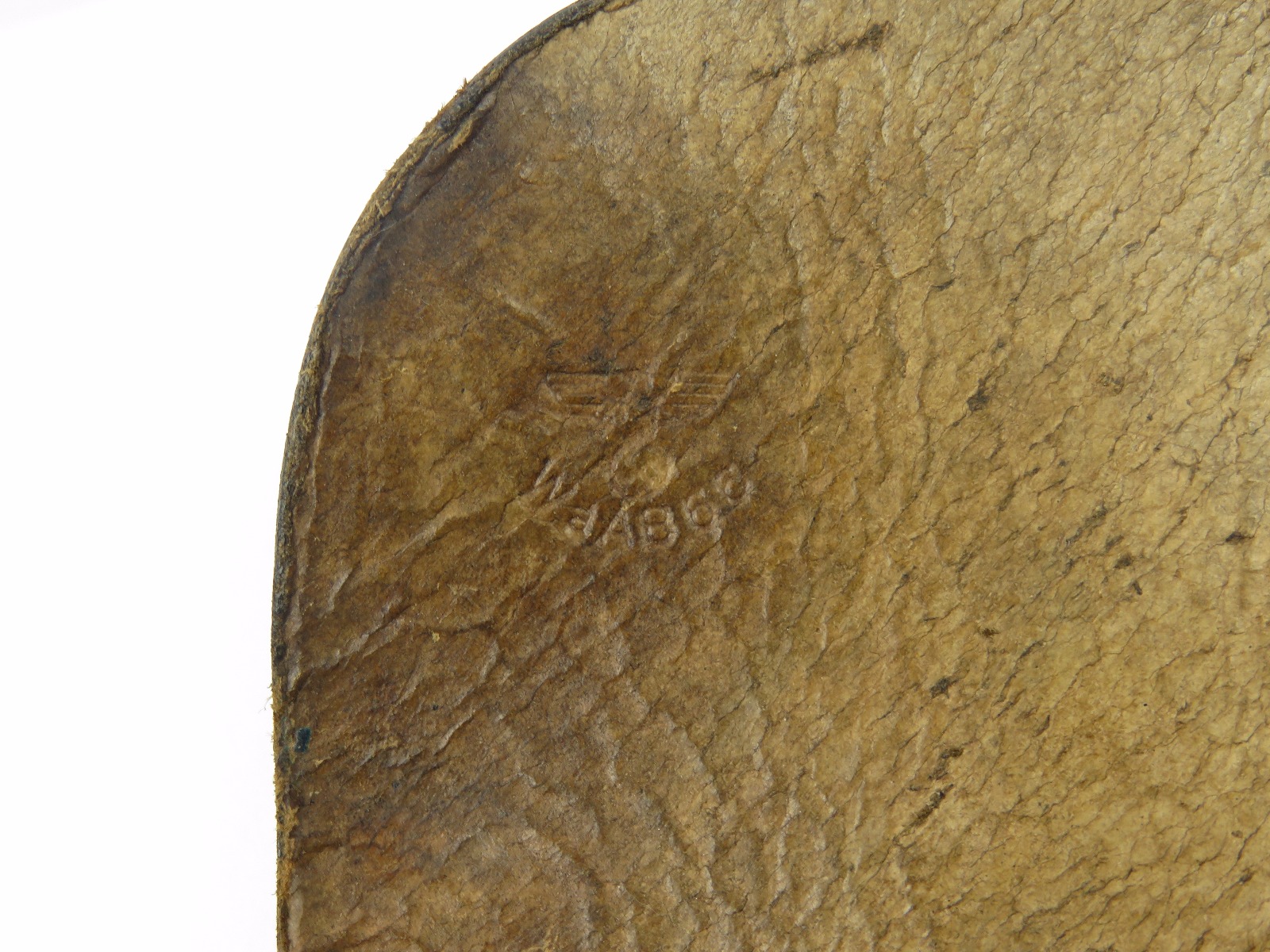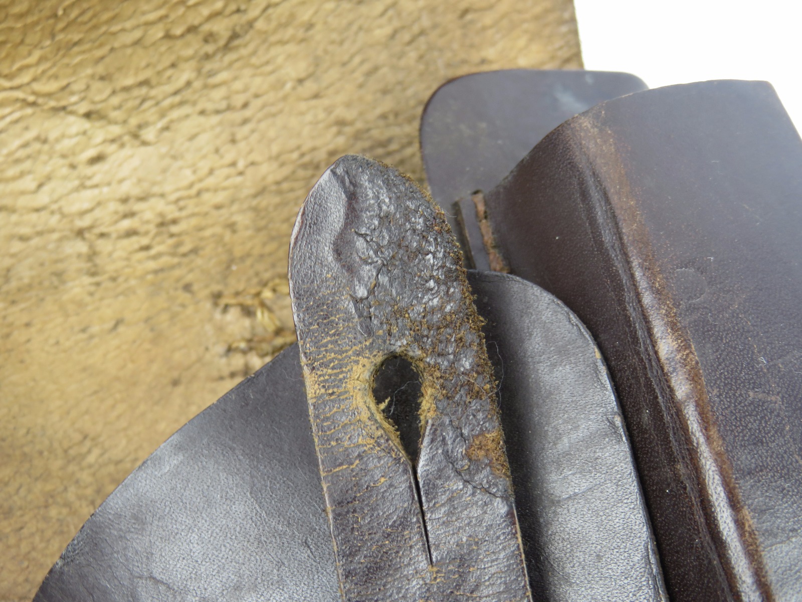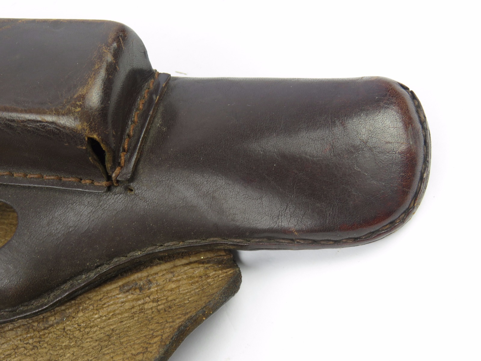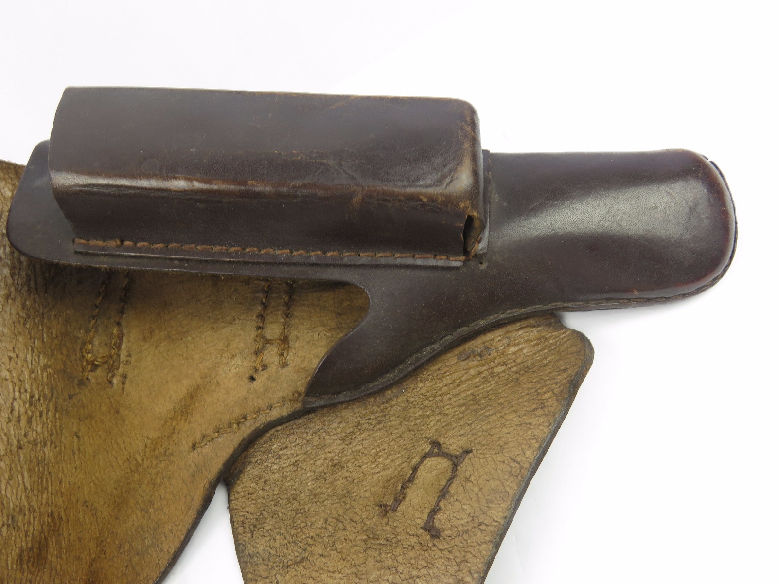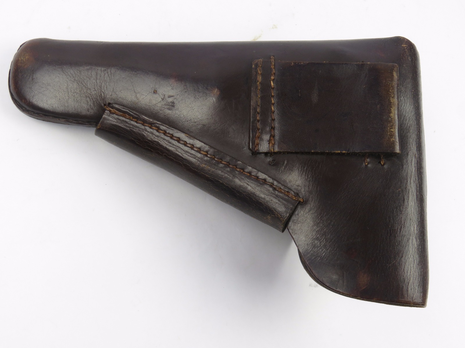 10/31/17 – This is an original WW2 production late war Hi-Power holster. The holster is maker stamped and dated under the closure strap “clg 44”. The interior leather has a waffen eagle imprinted into the leather. The chocolate brown leather is in great condition with some normal wear. There is surface wrinkling on the top, back, and front leather, and the closure strap has some light surface wear. The stitching is all original and authentic.