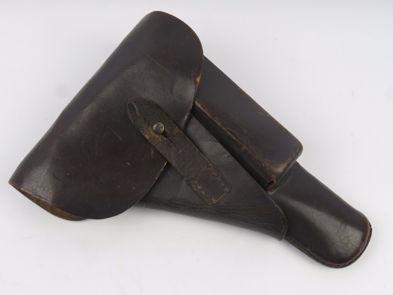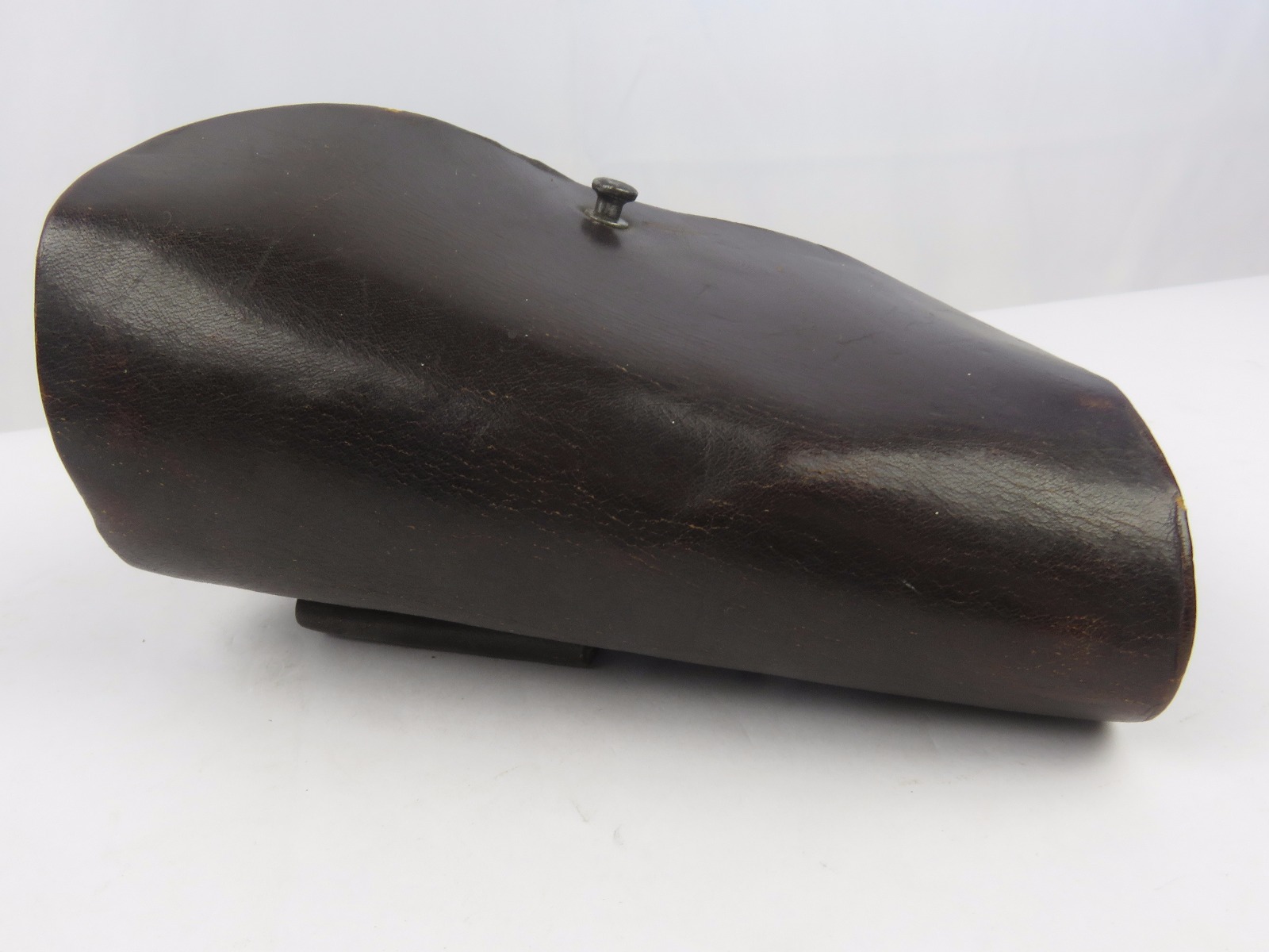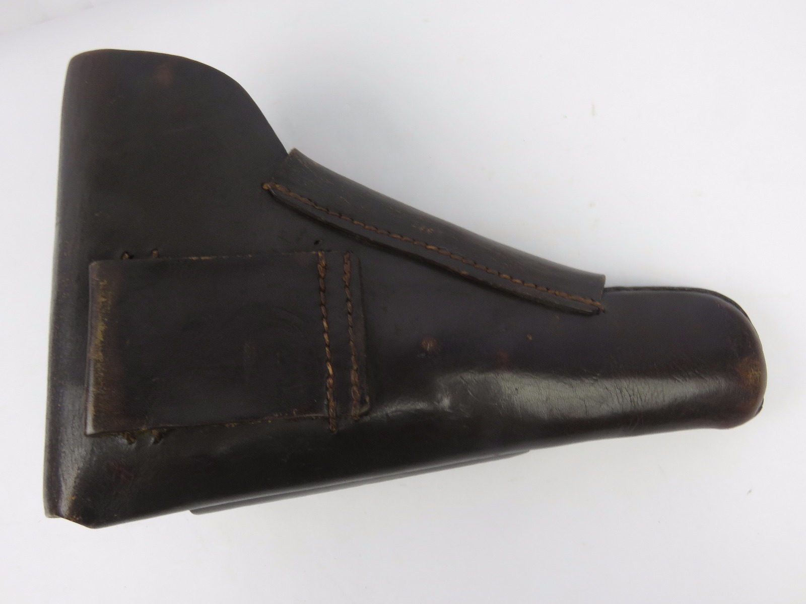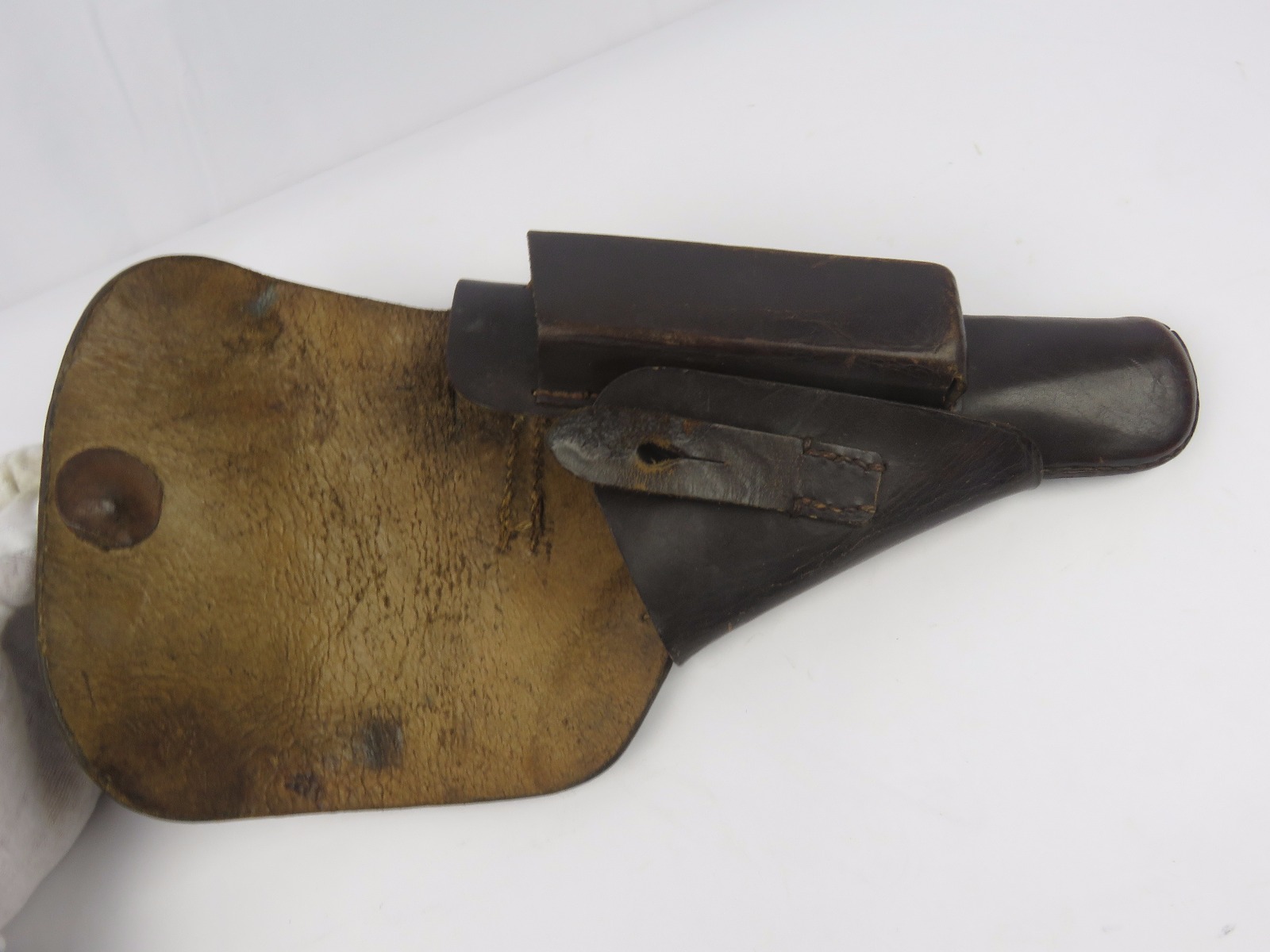 10/31/17 – This is an original WW2 production late war Hi-Power holster. The holster is maker stamped and dated under the closure strap “clg 44”. The interior leather has a waffen eagle imprinted into the leather. The chocolate brown leather is in great condition with some normal wear. There is surface wrinkling on the top, back, and front leather, and the closure strap has some light surface wear. The stitching is all original and authentic.