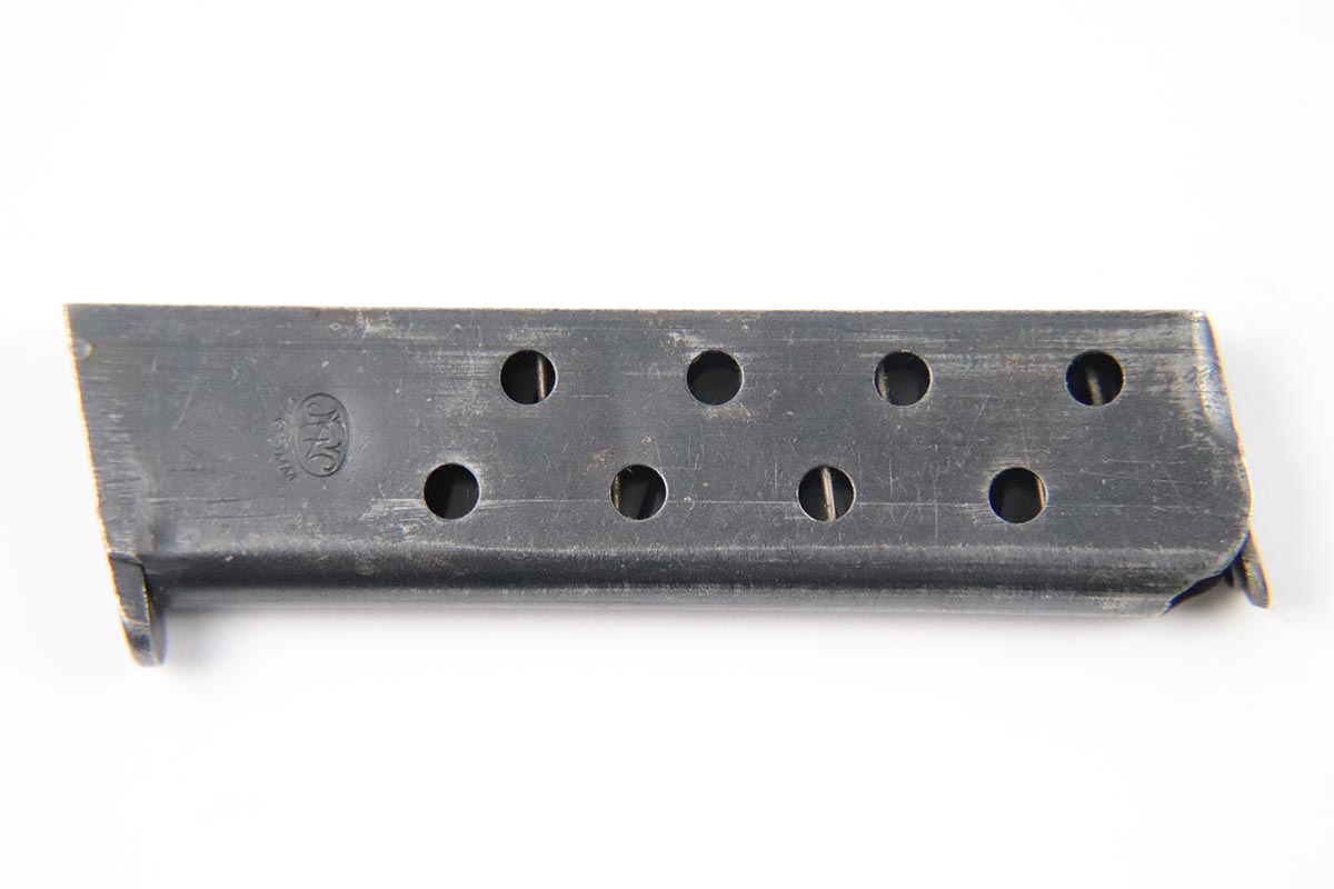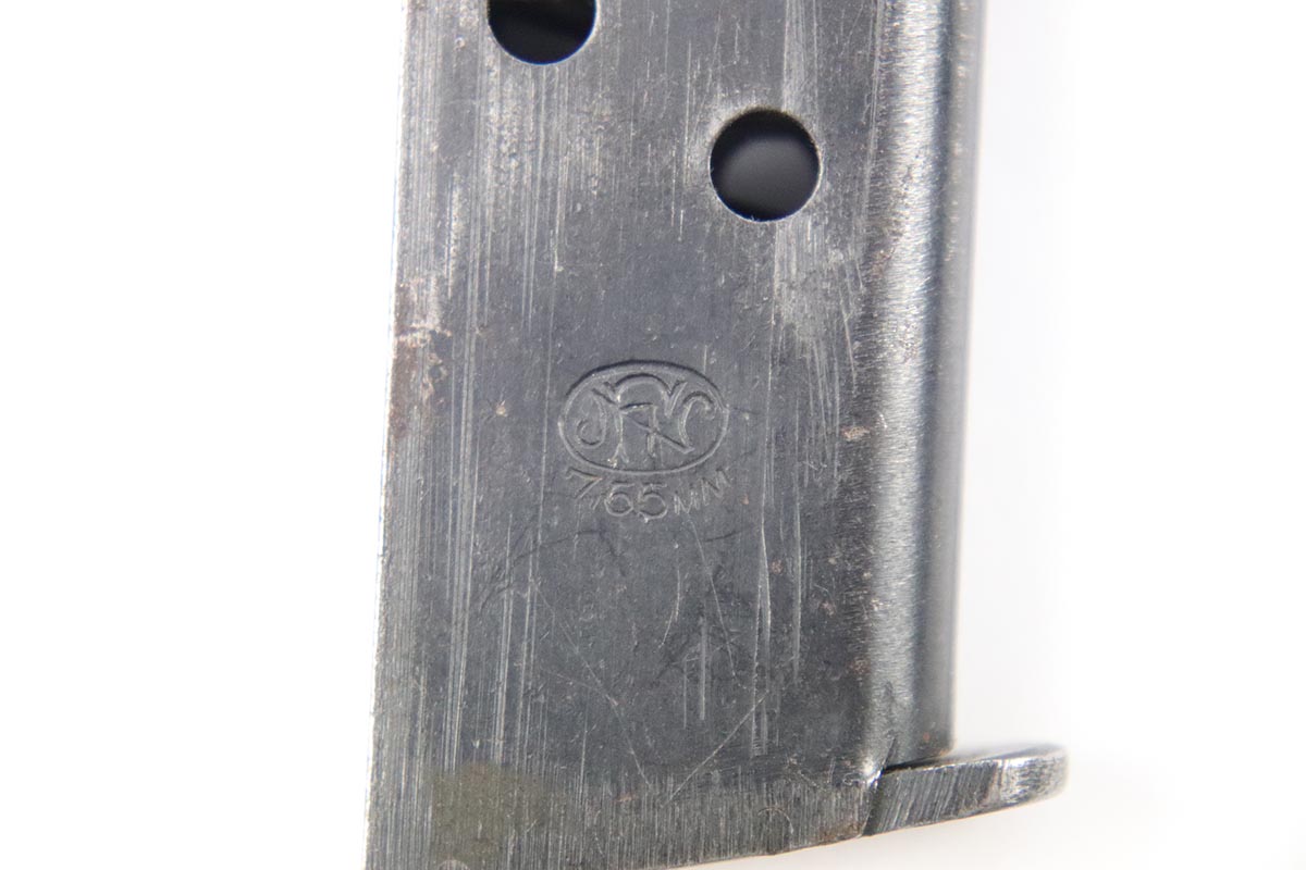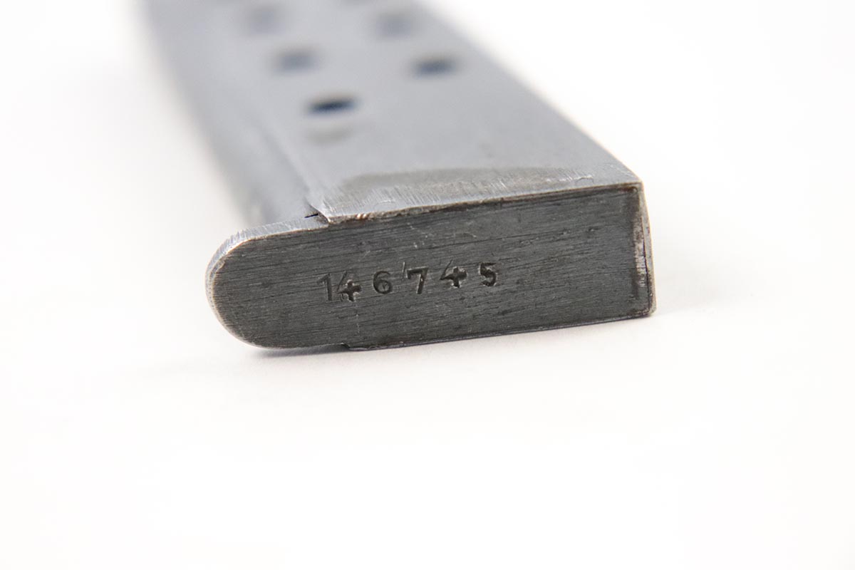 5/17/18 – This is an original WW2 era production 1922 magazine. The spine is stamped with a waffen eagle WaA140 proof. The right side of the frame is FN stamped. The base of the magazine is serial numbered, but this is not factory. Looks period correct though. The magazine has light cosmetic wear but no major rust or pitting. Guaranteed original and functional.