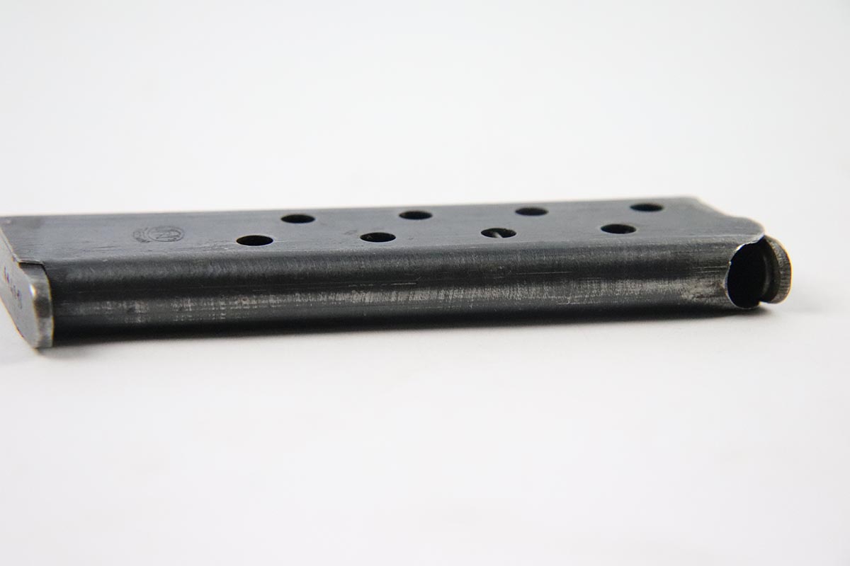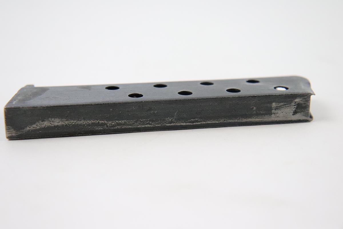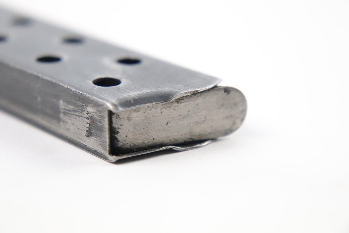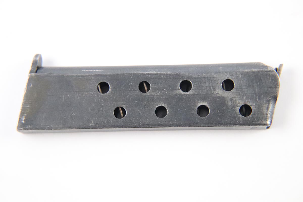 5/17/18 – This is an original WW2 era production 1922 magazine. The spine is stamped with a waffen eagle WaA140 proof. The right side of the frame is FN stamped. The base of the magazine is serial numbered, but this is not factory. Looks period correct though. The magazine has light cosmetic wear but no major rust or pitting. Guaranteed original and functional.