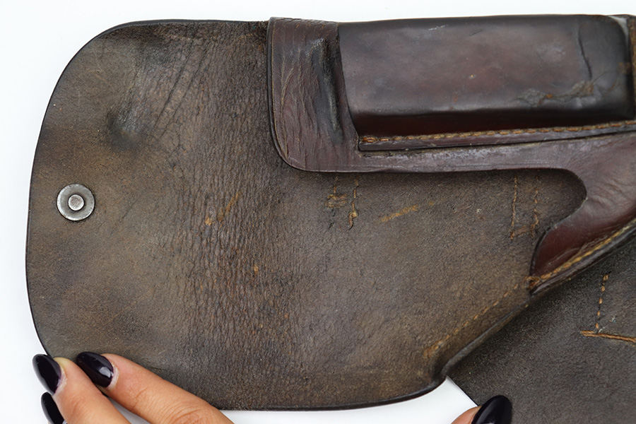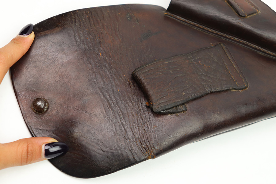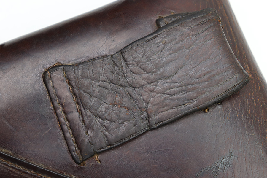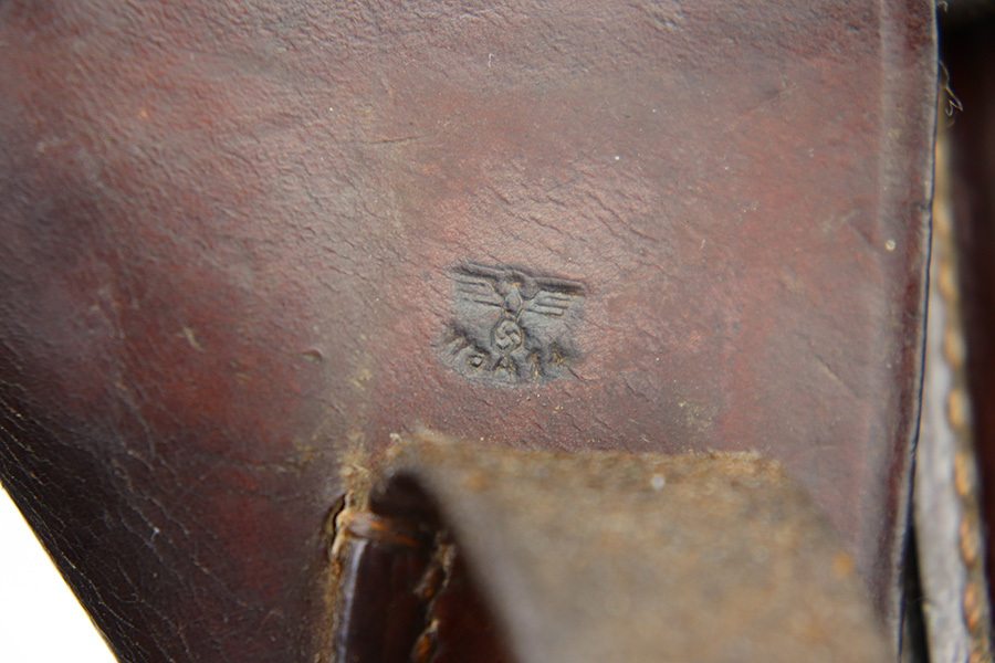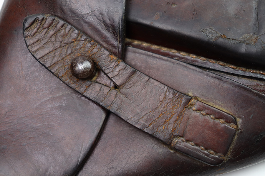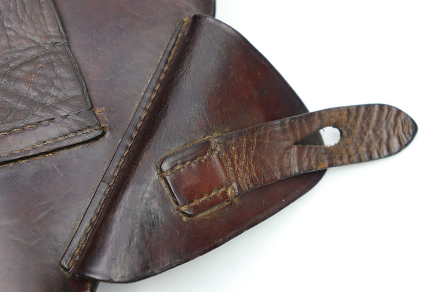 11/7/22 – This is an original WW2 production holster that fits most 7.65mm Axis pistols, such as the Mauser HSc, Sauer 38h, or Walther PP pistol. The holster is stamped with a waffen military proof under the closure strap. There are no other visible markings or stamps. The holster leather is in good overall condition with some mild scuffing and wrinkling throughout. The top leather has some mild surface cracking around the pivot area, but this is normal and not excessive. No notable stitching issues. Shows signs of previous use and aging.