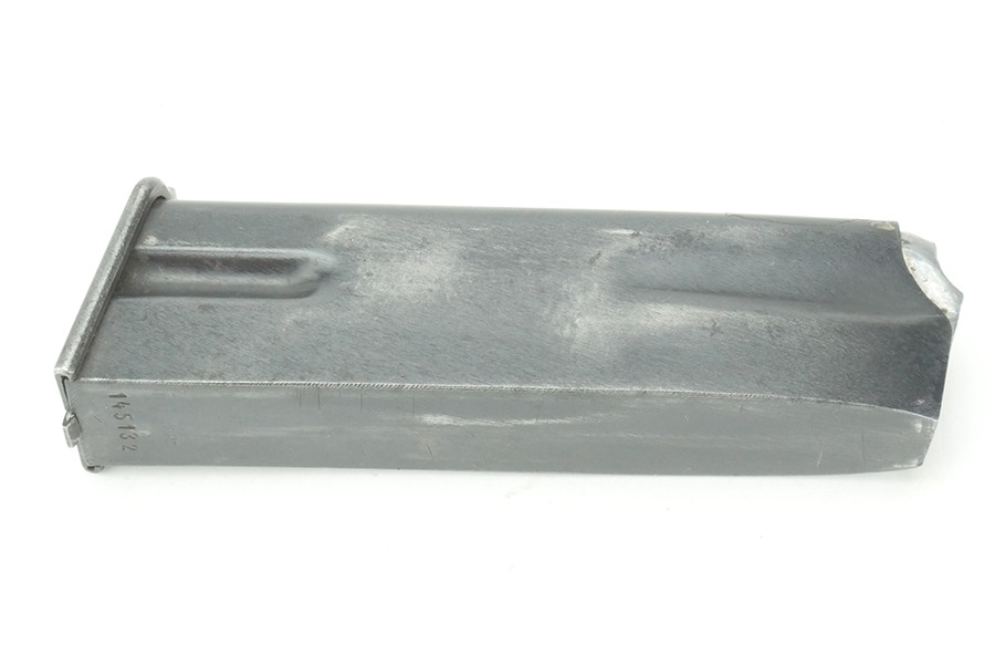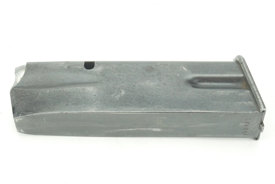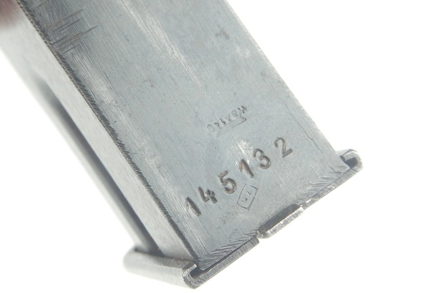 10/18/24 – This is an original WWII production FN Browning High Power magazine. The magazine is stamped on the spine with a German military “WaA140” proof stamp. The spine is also stamped with a post-war serial number of “145132”, this could be from a post-war police reissue. The body of this magazine retains most of its original finish. There are spots of finish thinning on the sides of the magazine associated with standard magazine use. On the front of the magazine there is finish loss towards the feed lips. The spring on this magazine is still strong and functional.
