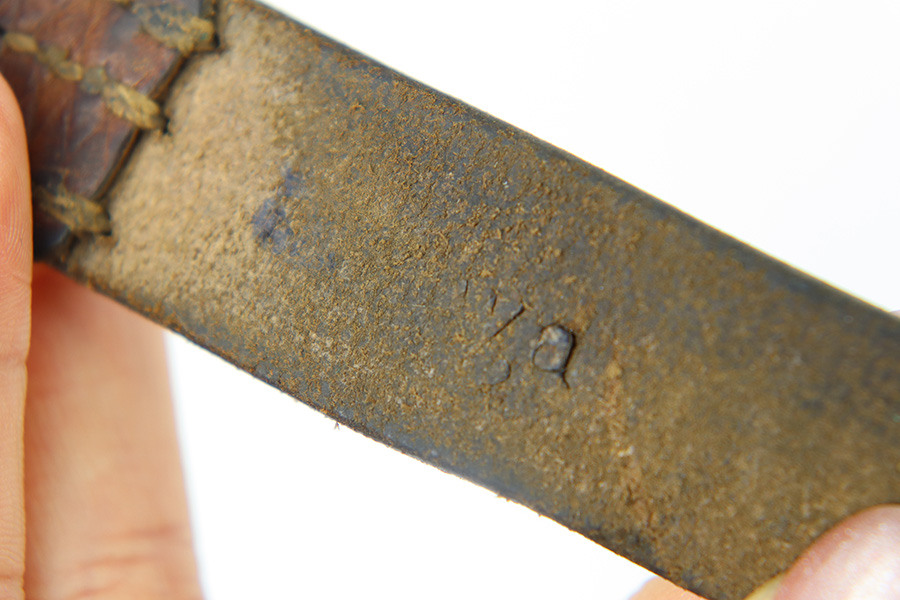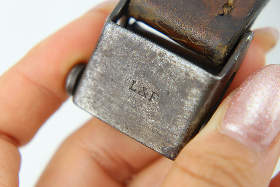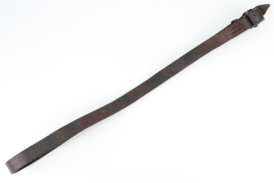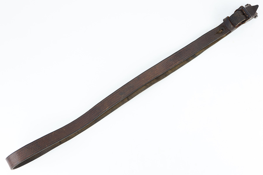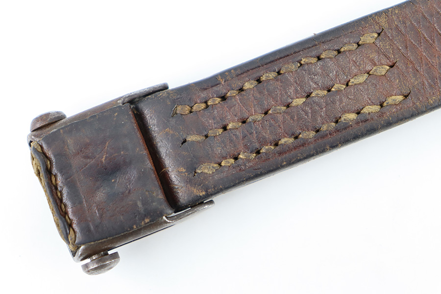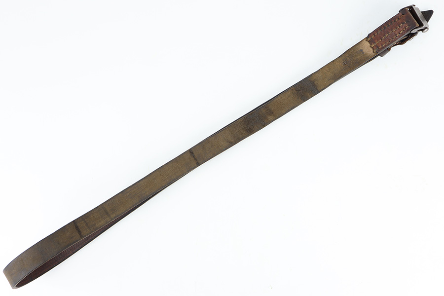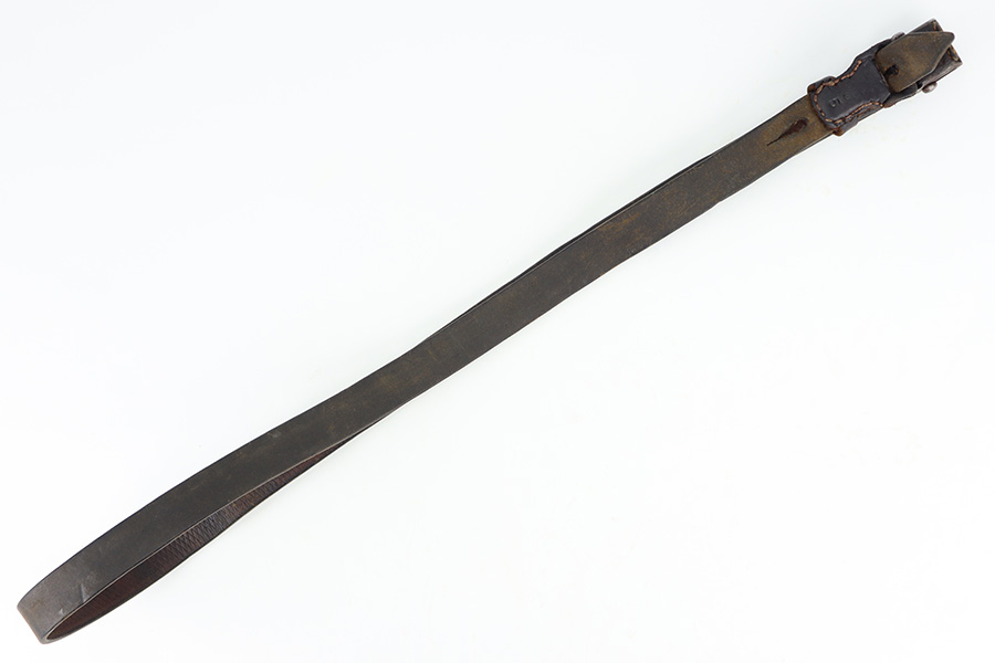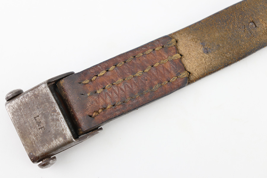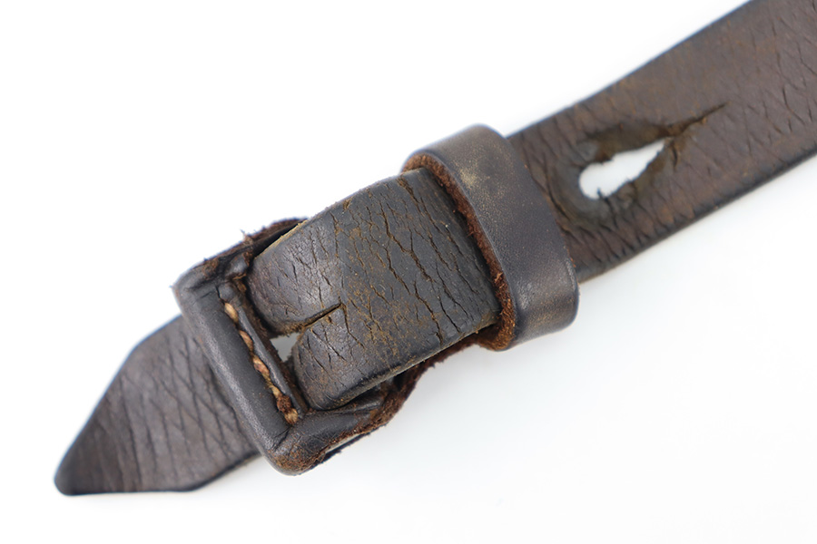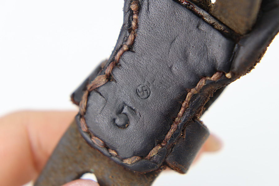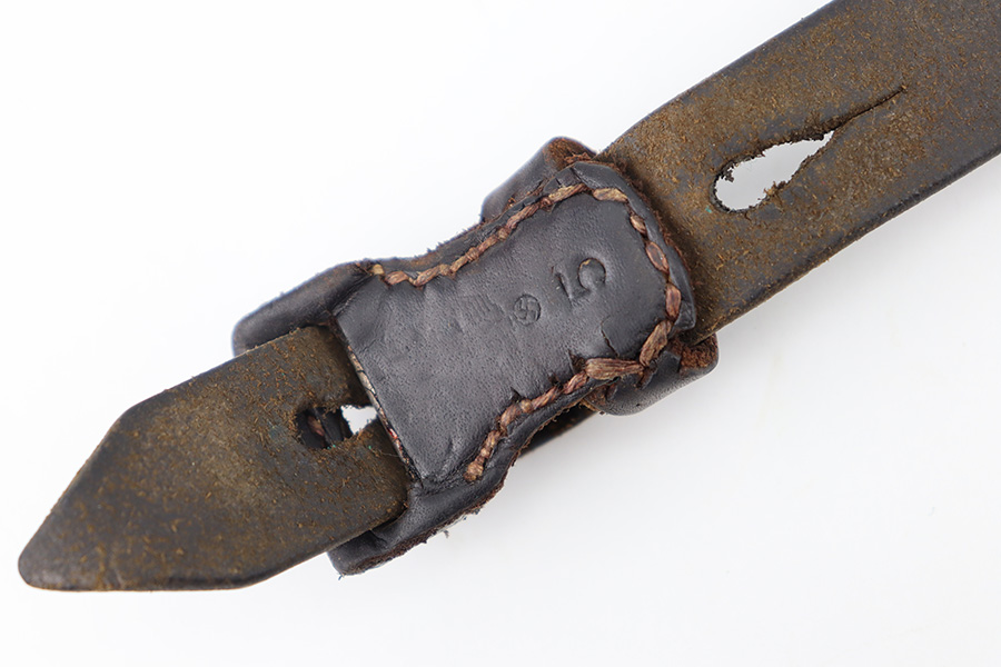 1/2/24 – This is an original WW2 era production German MP.40 submachine gun leather sling. This is indicated by the 2 holes on one one of the sling (k98 slings have 3 holes). The sling comes with an original leather keeper that’s waffen military proof stamped. The stamp is faint yet visible. The other end of the sling has a metal eyelet that’s maker stamped “L&F”. There’s another maker stamp of some sort on the interior leather near this end, but we can’t decipher the marking. The leather is soft and pliable with normal use wear but no major issues.