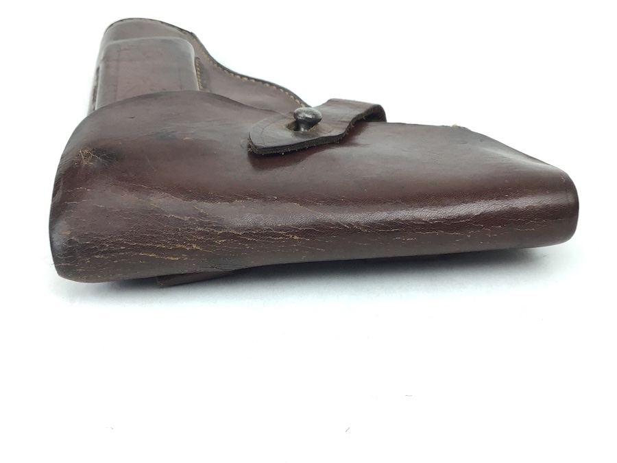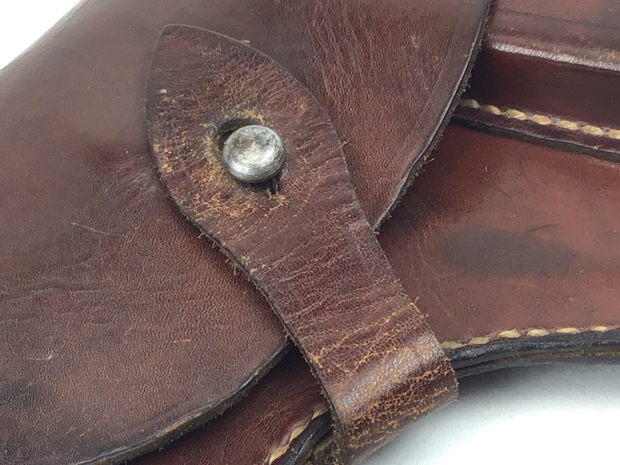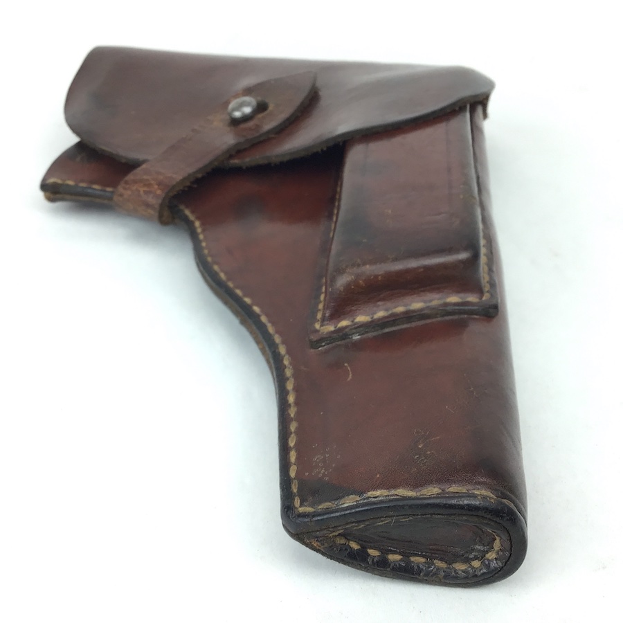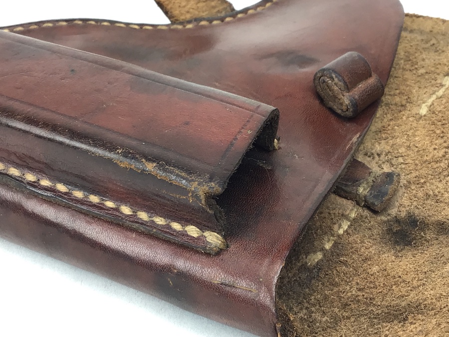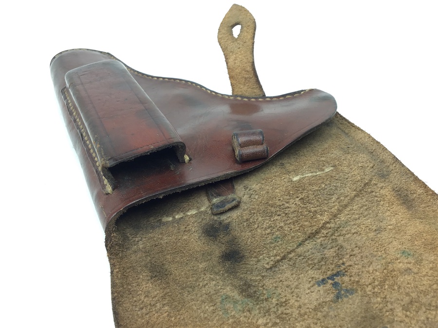 5/21/20 – This is an original WWII era, waffen stamped Radom holster. The holster has clean leather that is firm throughout. The leather is completely intact along with the stitching. The backside of the closure flap is ink stamped with a waffen eagle military proof stamp. The interior leather is clean with a secure lift strap. Small area of wear at the top corner of the magazine pouch.