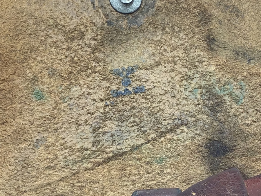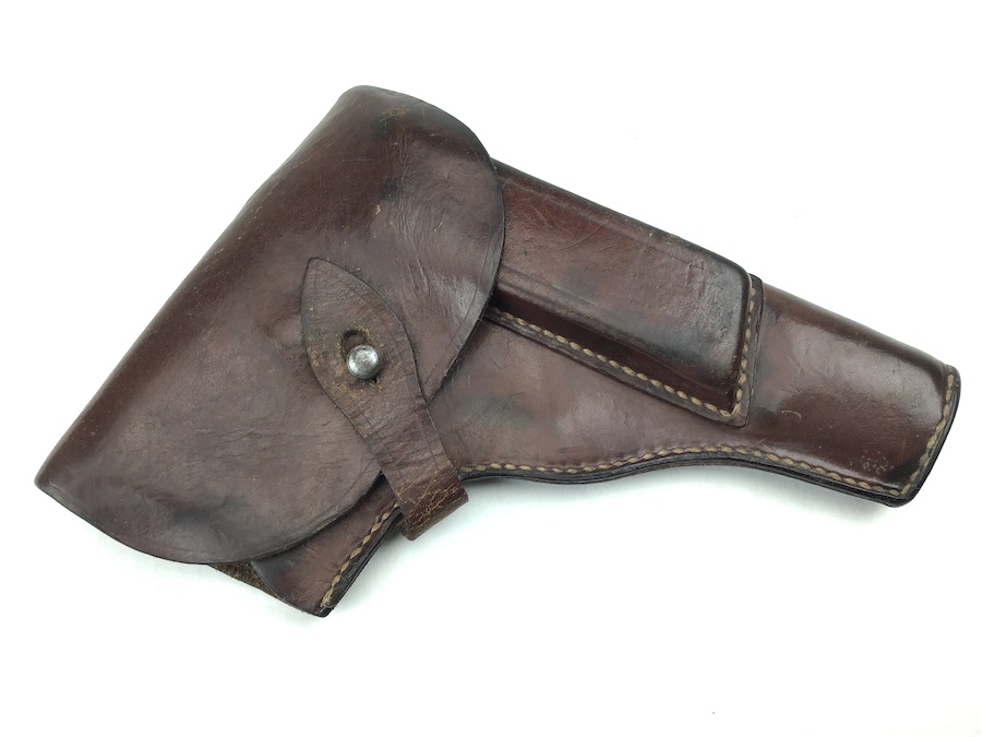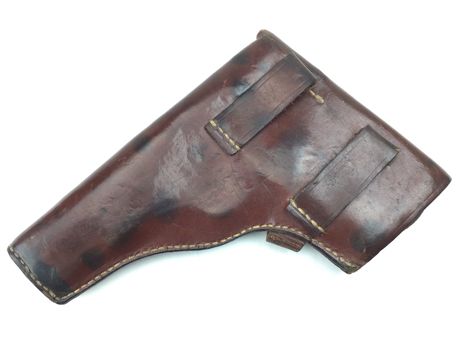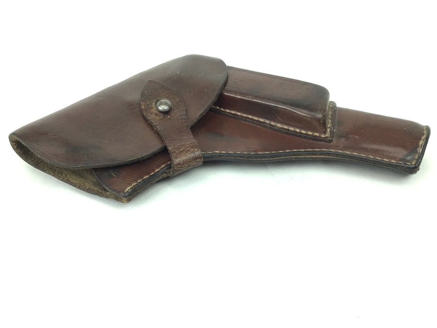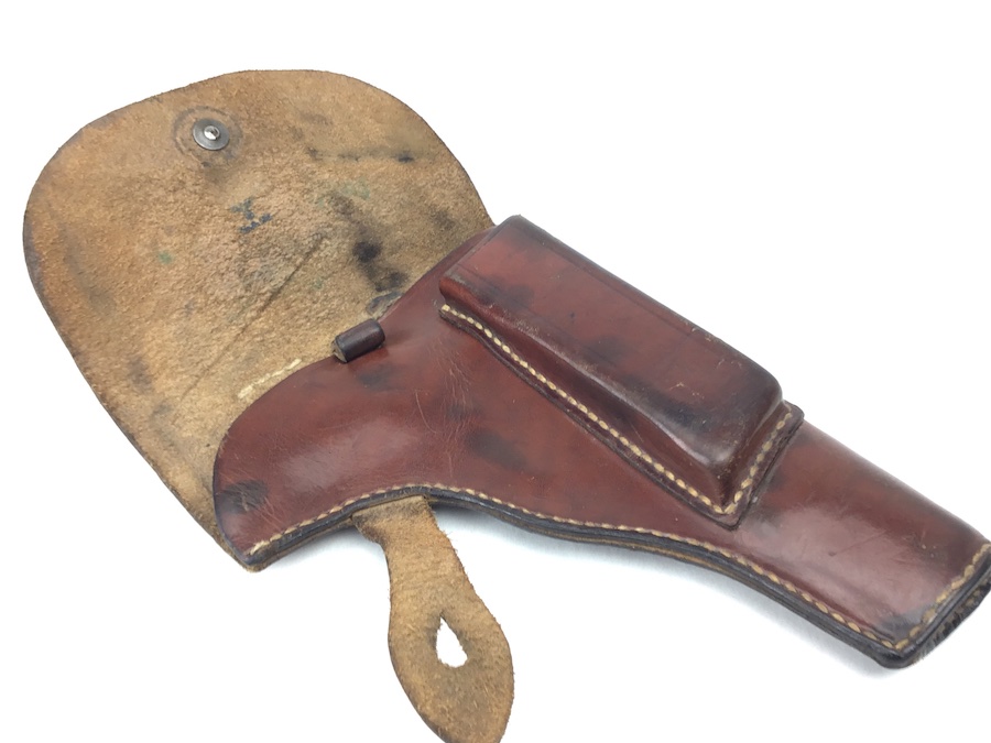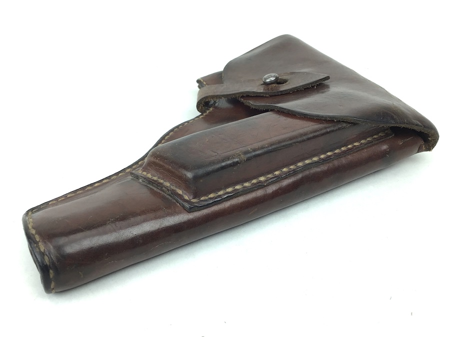 5/21/20 – This is an original WWII era, waffen stamped Radom holster. The holster has clean leather that is firm throughout. The leather is completely intact along with the stitching. The backside of the closure flap is ink stamped with a waffen eagle military proof stamp. The interior leather is clean with a secure lift strap. Small area of wear at the top corner of the magazine pouch.