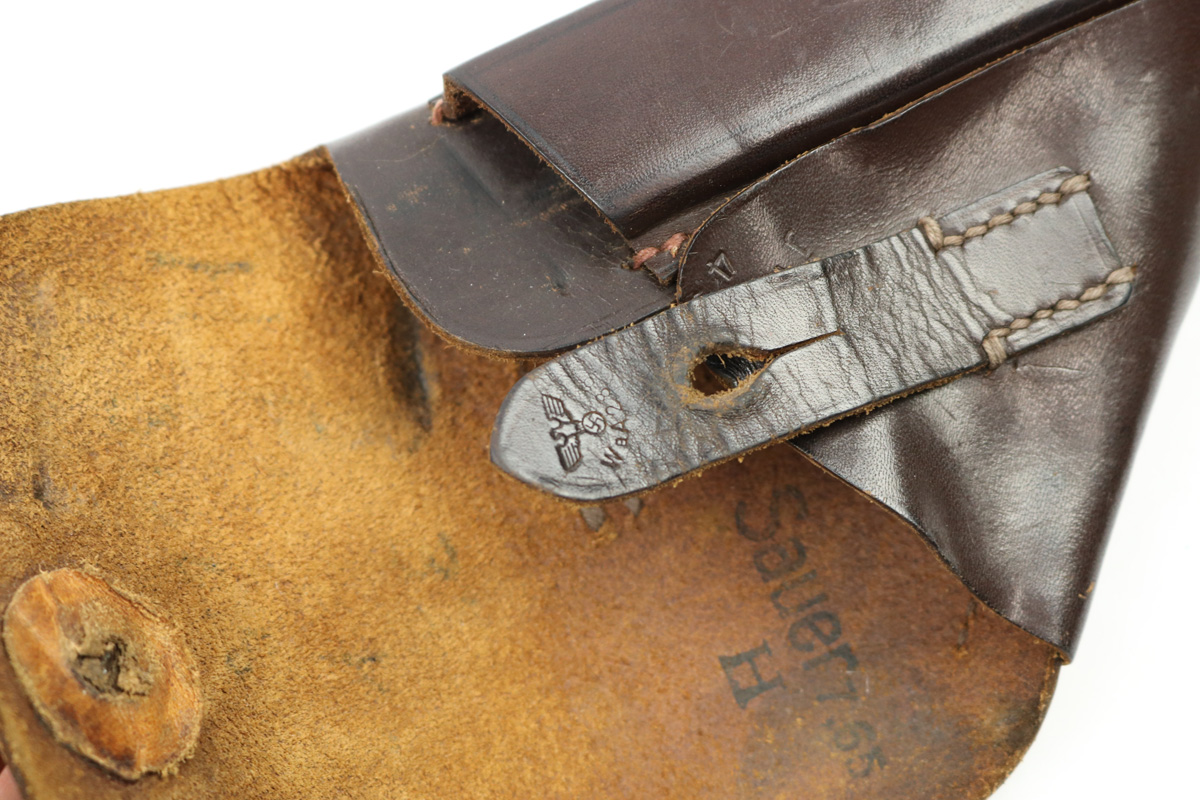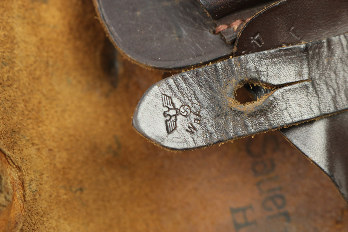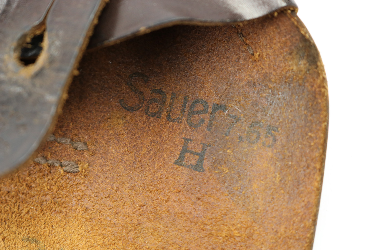 7/31/18 – This is a fairly scarce Sauer 38h holster made by “jhg”. The holster is maker stamped and 1944 dated under the closure strap. The closure strap has a waffen eagle WaA286 military proof stamp. The interior leather is ink stamped Sauer 7.65. Rarely do you find interior ink stamps like this, plus the waffen proof on the closure strap. Very nice chocolate brown leather and excellent, all original stitching. No major flaws or notable issues. Guaranteed original.