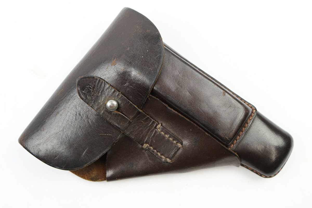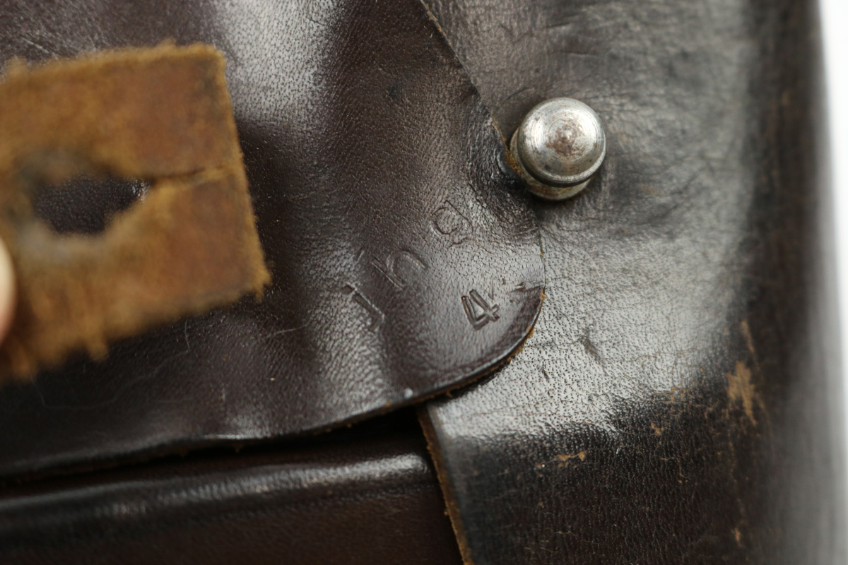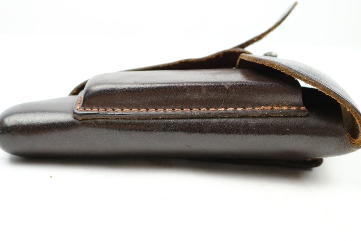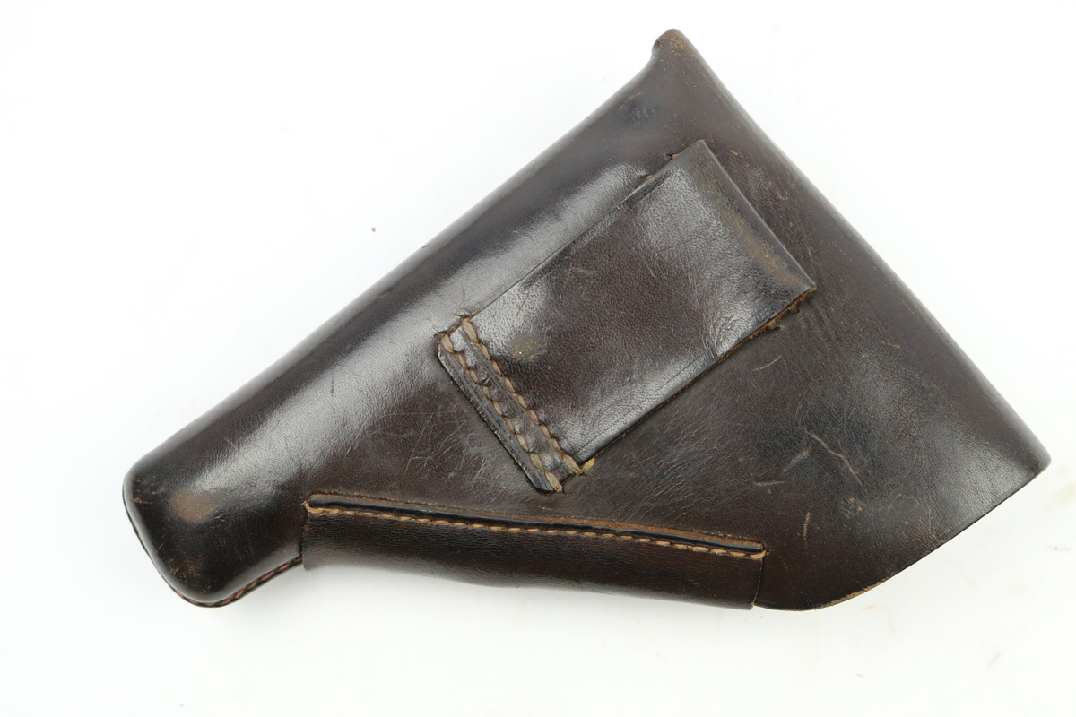 7/31/18 – This is a fairly scarce Sauer 38h holster made by “jhg”. The holster is maker stamped and 1944 dated under the closure strap. The closure strap has a waffen eagle WaA286 military proof stamp. The interior leather is ink stamped Sauer 7.65. Rarely do you find interior ink stamps like this, plus the waffen proof on the closure strap. Very nice chocolate brown leather and excellent, all original stitching. No major flaws or notable issues. Guaranteed original.