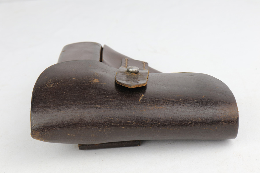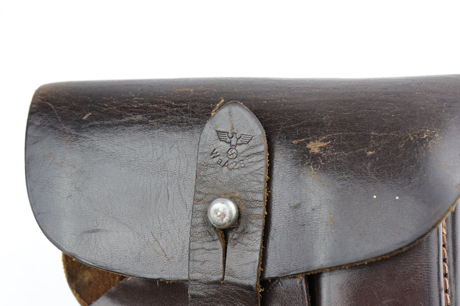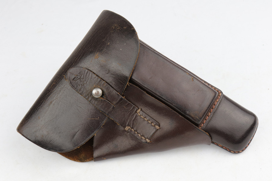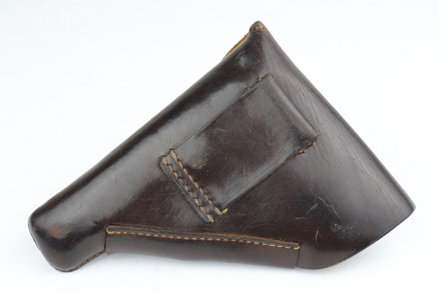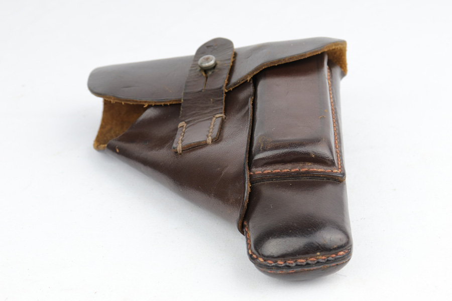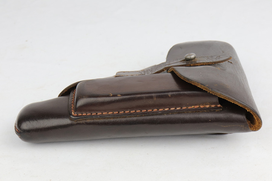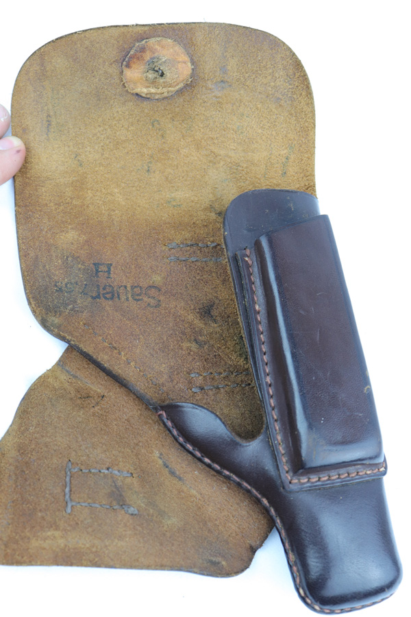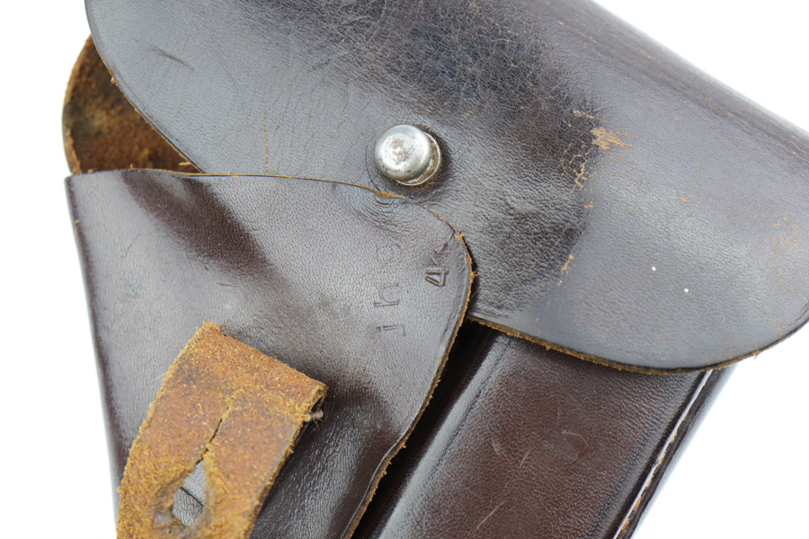 4/2/19 – This is an excellent, rare & original waffen proofed holster for a 7.65mm Sauer pistol. Most likely for the 38h. The interior leather has “Sauer 7.65 H” ink stamp. These are often upside down – as is the case on this holster. The closure strap has a waffen eagle proof stamp for military use. The holster has nice dark brown leather and all original stitching. There’s some light wear but this is normal and non excessive. A very hard to find holster!