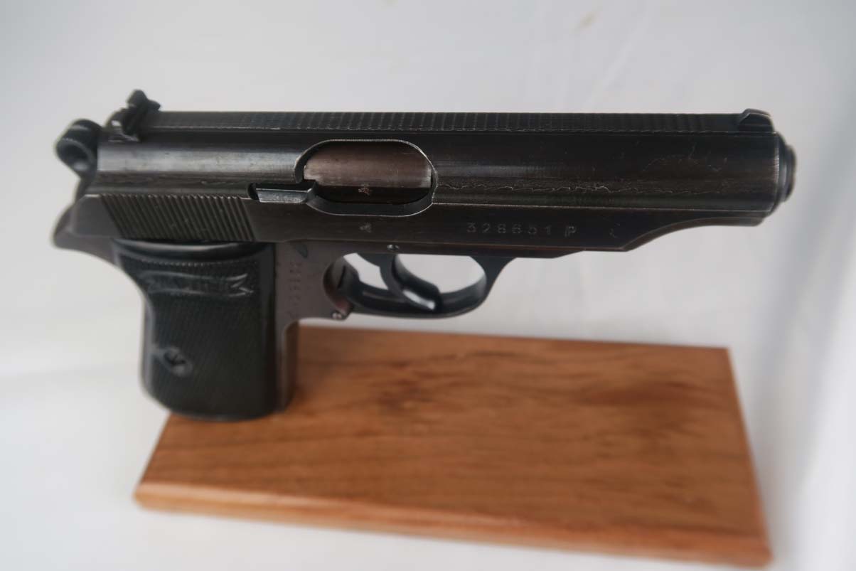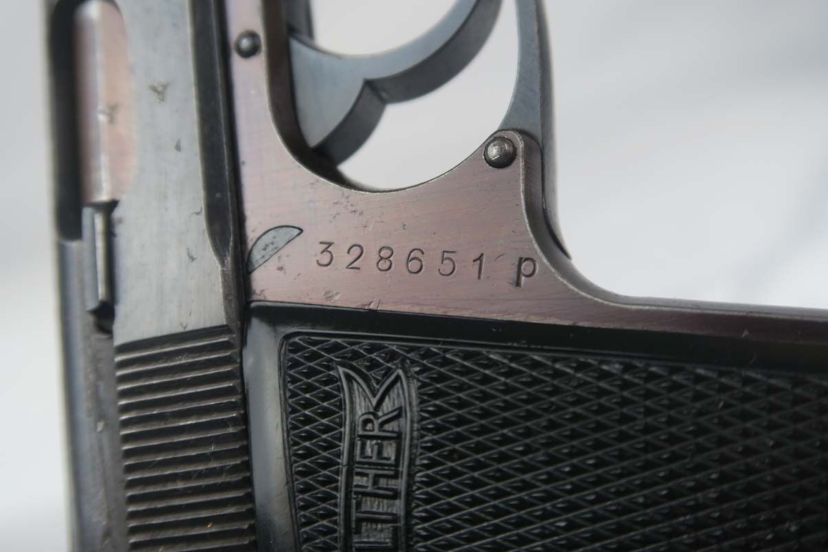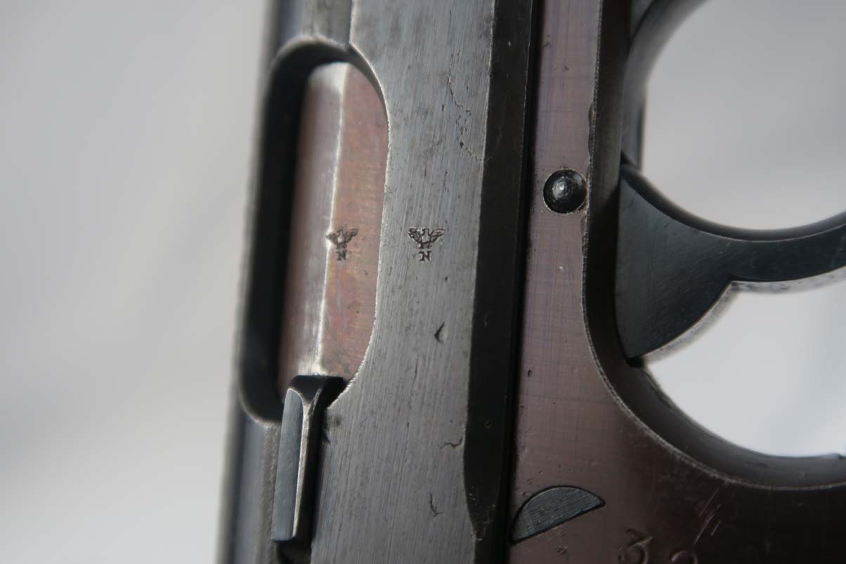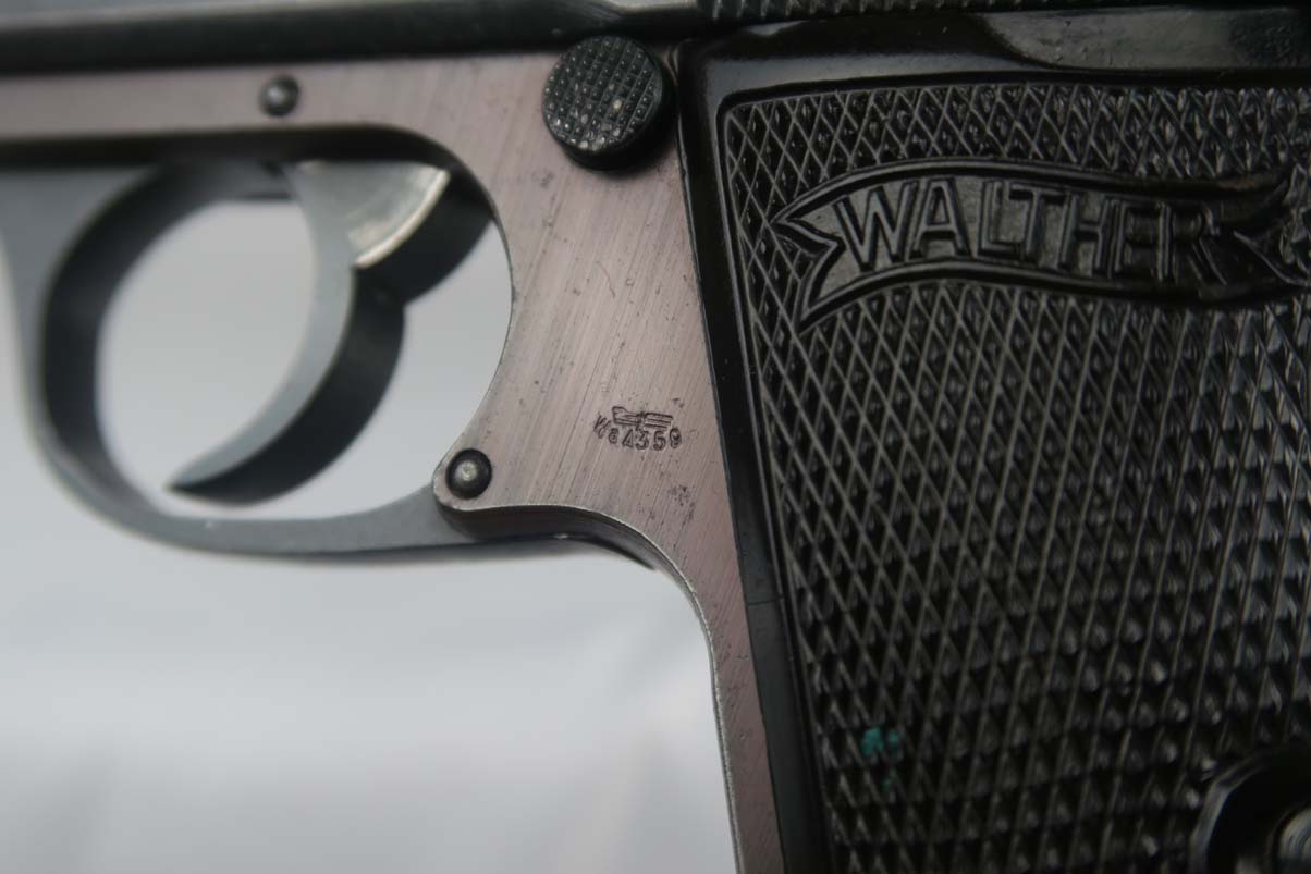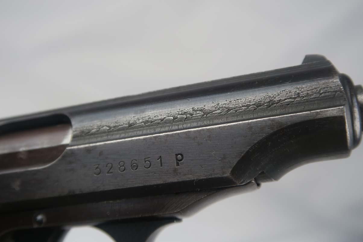 3/18/17 – This is an original wartime production Walther PP from WW2. The pistol has German military waffen proof stamps on both the slide and frame. The frame is interesting due to the plumb colored finish that is seldom seen on wartime German pistols. This was an experimental finish as the Germans started to play around with the bluing formula to save on precious materials. The plumb frame is excellent, except for some normal wear/thinning of the finish on the front and back straps. The slide has normal wear as well, but there is a strange machine mark along the right side of the slide, above the serial number. This is a fairly unique machine marking, and proves how the Germans became less strict on productions standards during the war. The bore has some minor residue and signs of use, but overall is in great shape with good rifling, and the residue is very minor that it could easily be cleaned out. Guaranteed original and authentic.