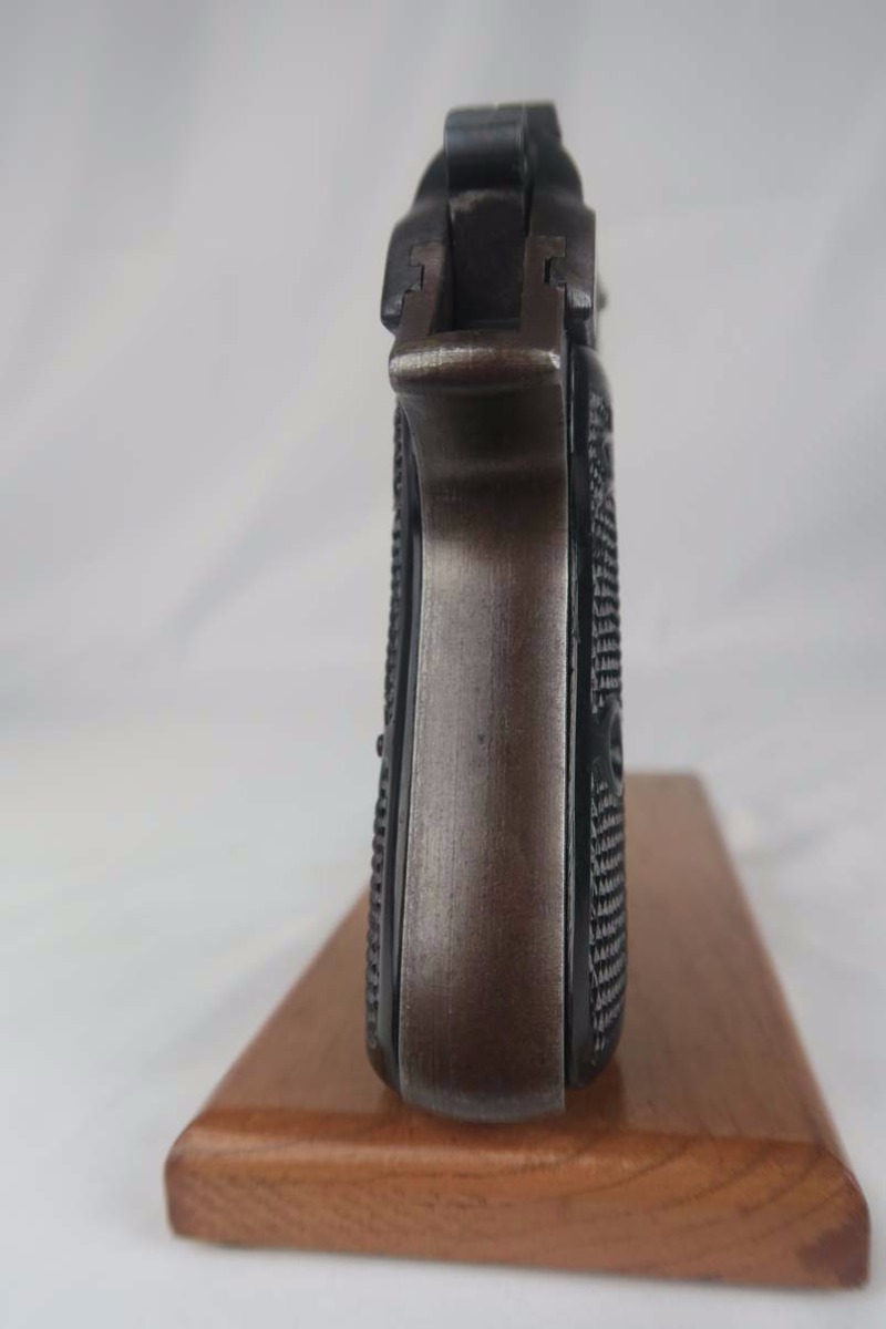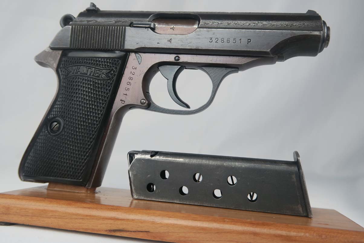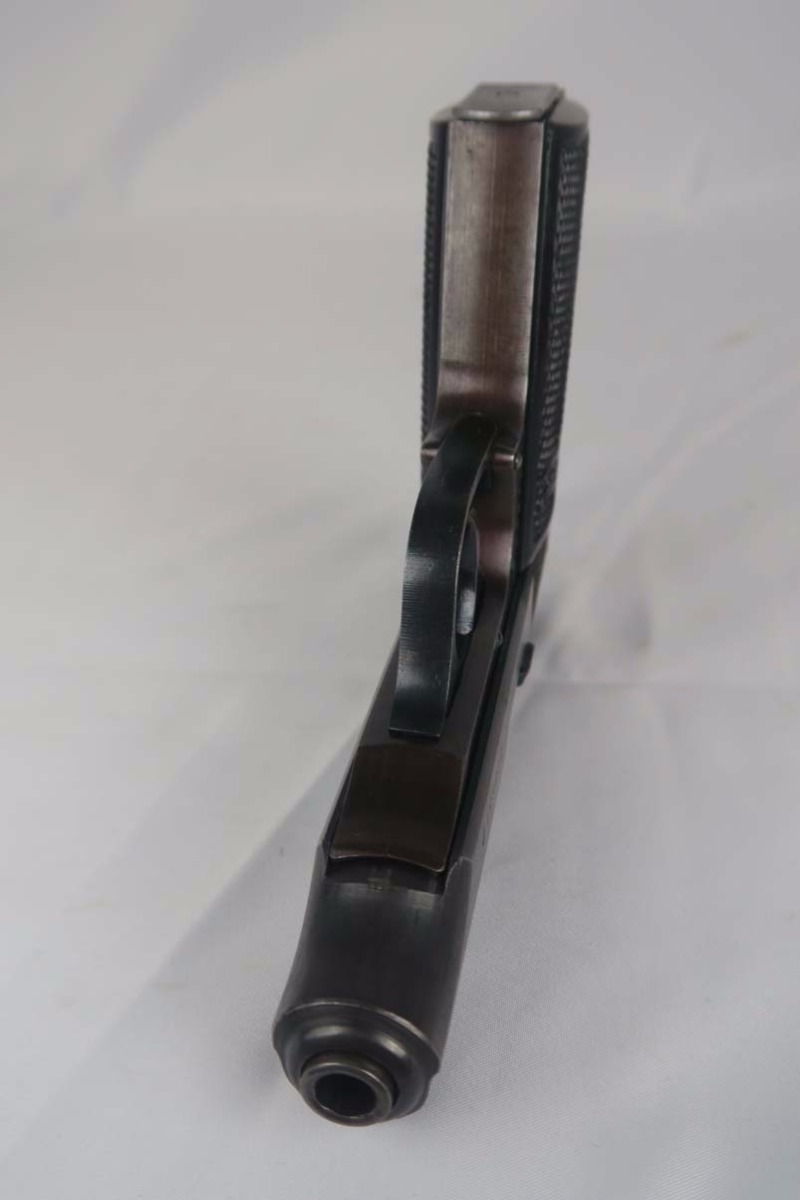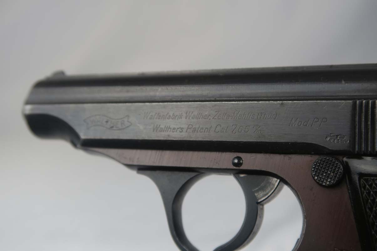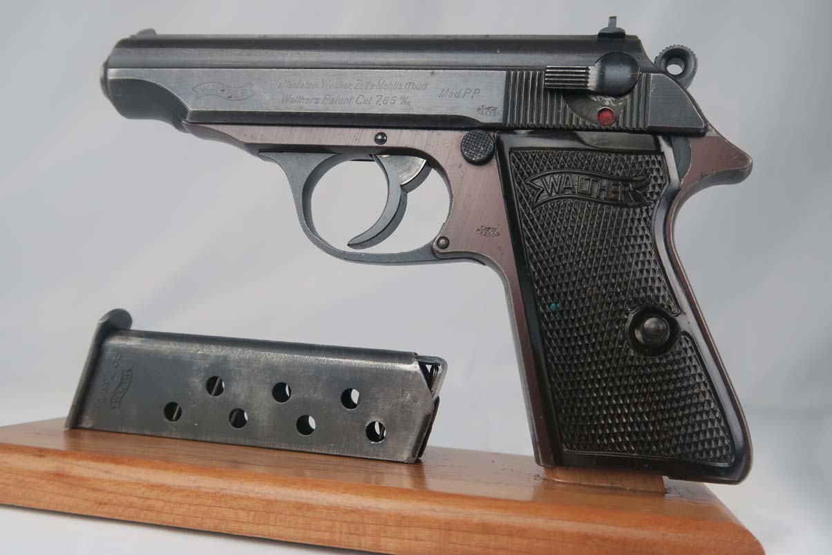 3/18/17 – This is an original wartime production Walther PP from WW2. The pistol has German military waffen proof stamps on both the slide and frame. The frame is interesting due to the plumb colored finish that is seldom seen on wartime German pistols. This was an experimental finish as the Germans started to play around with the bluing formula to save on precious materials. The plumb frame is excellent, except for some normal wear/thinning of the finish on the front and back straps. The slide has normal wear as well, but there is a strange machine mark along the right side of the slide, above the serial number. This is a fairly unique machine marking, and proves how the Germans became less strict on productions standards during the war. The bore has some minor residue and signs of use, but overall is in great shape with good rifling, and the residue is very minor that it could easily be cleaned out. Guaranteed original and authentic.