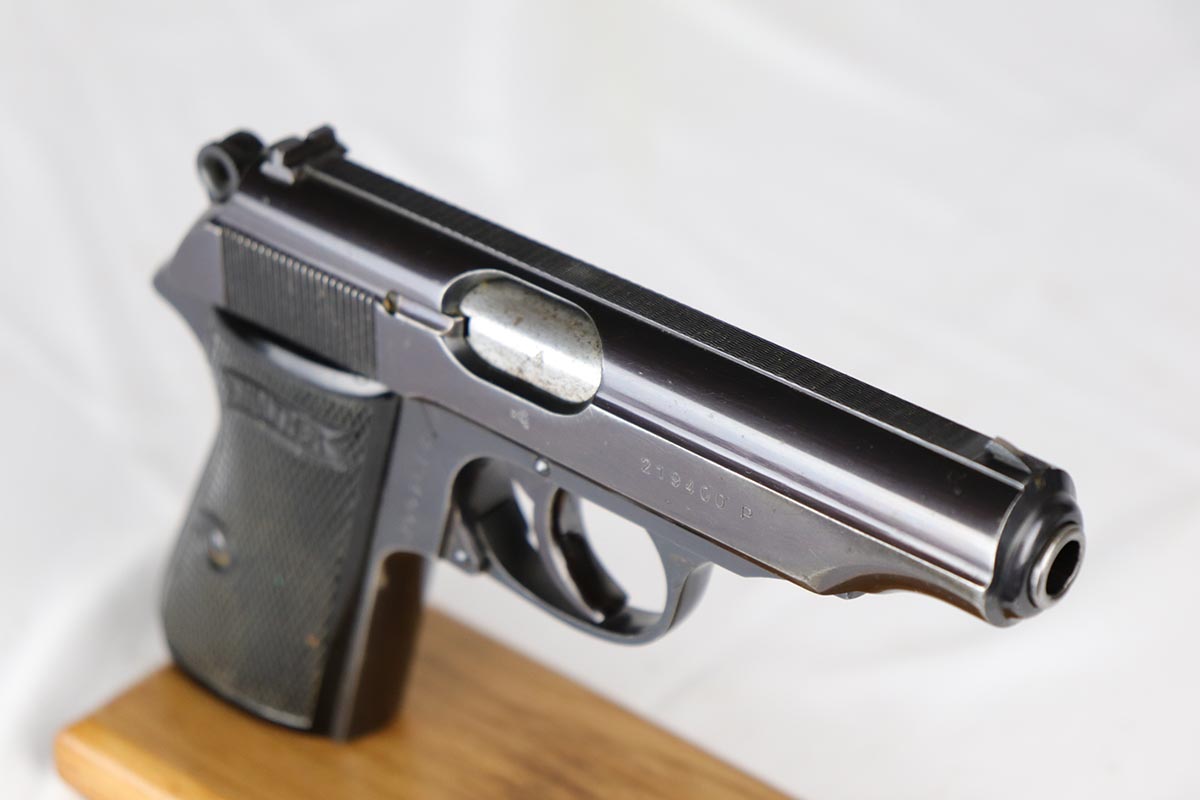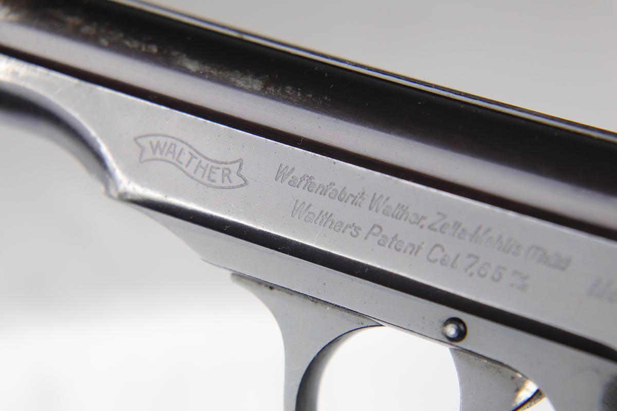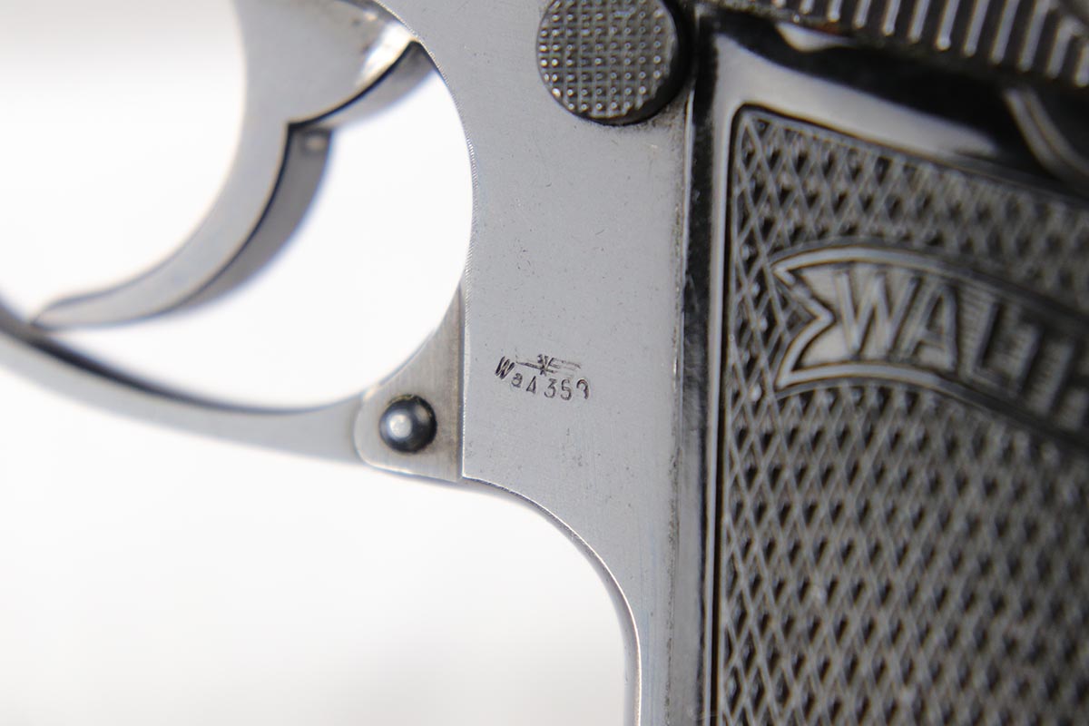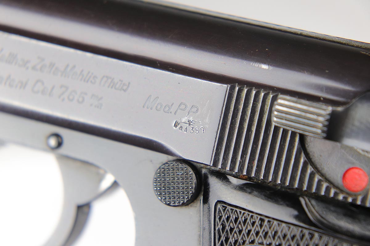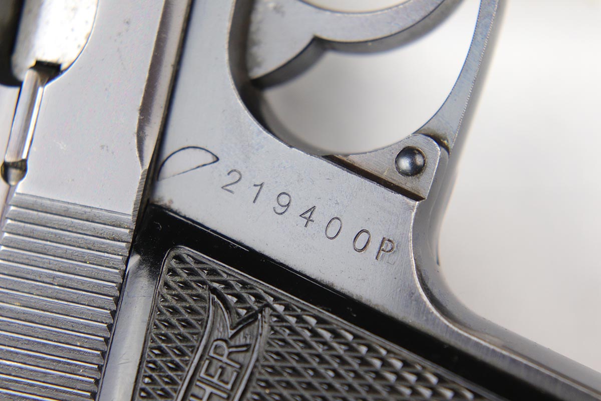 4/23/18 – This is an original Walther PP with a waffen military proof stamp on the frame and receiver. The pistol was made for the military during 1941. The pistol is all correct and matching with about 92% of the bluing in tact. There’s wear on the slide especially near the muzzle. There a light hint of purple hue on the finish of the slide. The slide has the majority of the wear, with thinning on both sides as well as the edge wear. The front and back straps have a little spotty wear as well and show signs of use. There’s light patina throughout the straps. The bore is in minty condition. Guaranteed original and authentic.