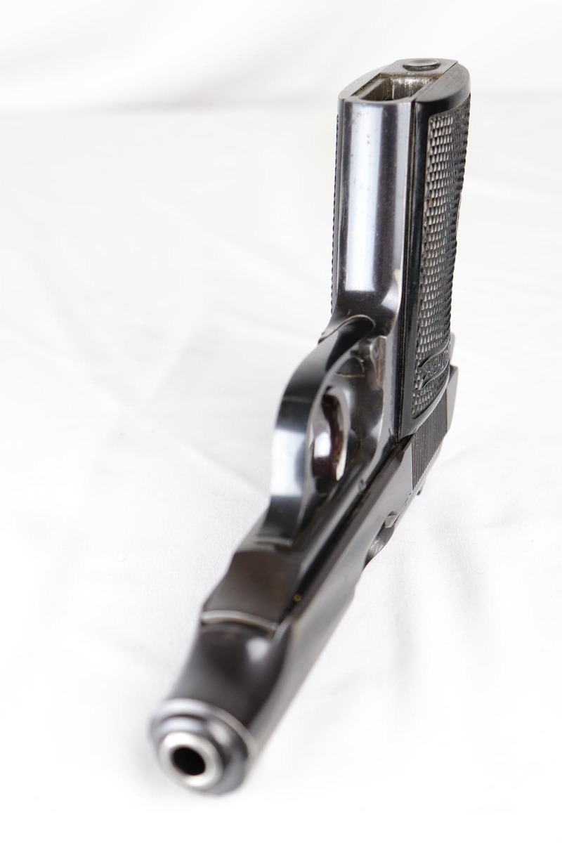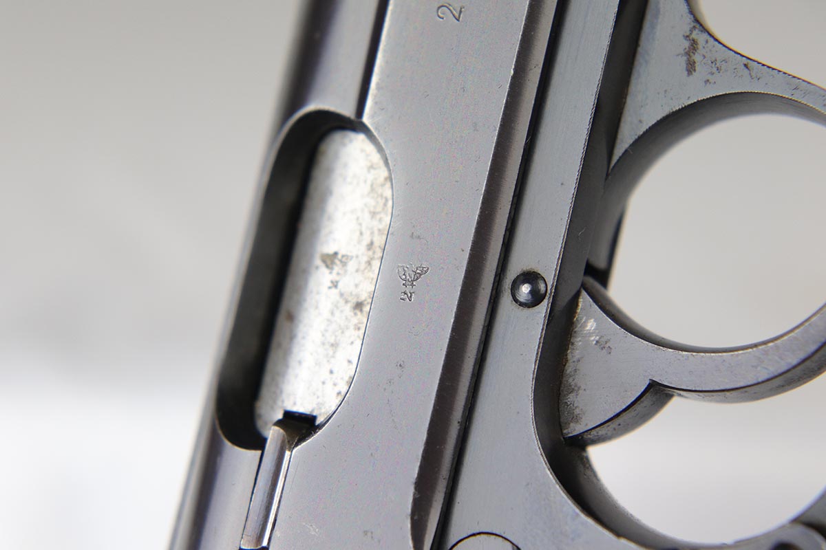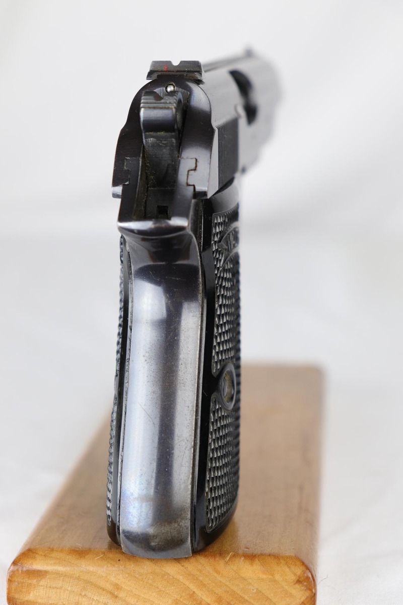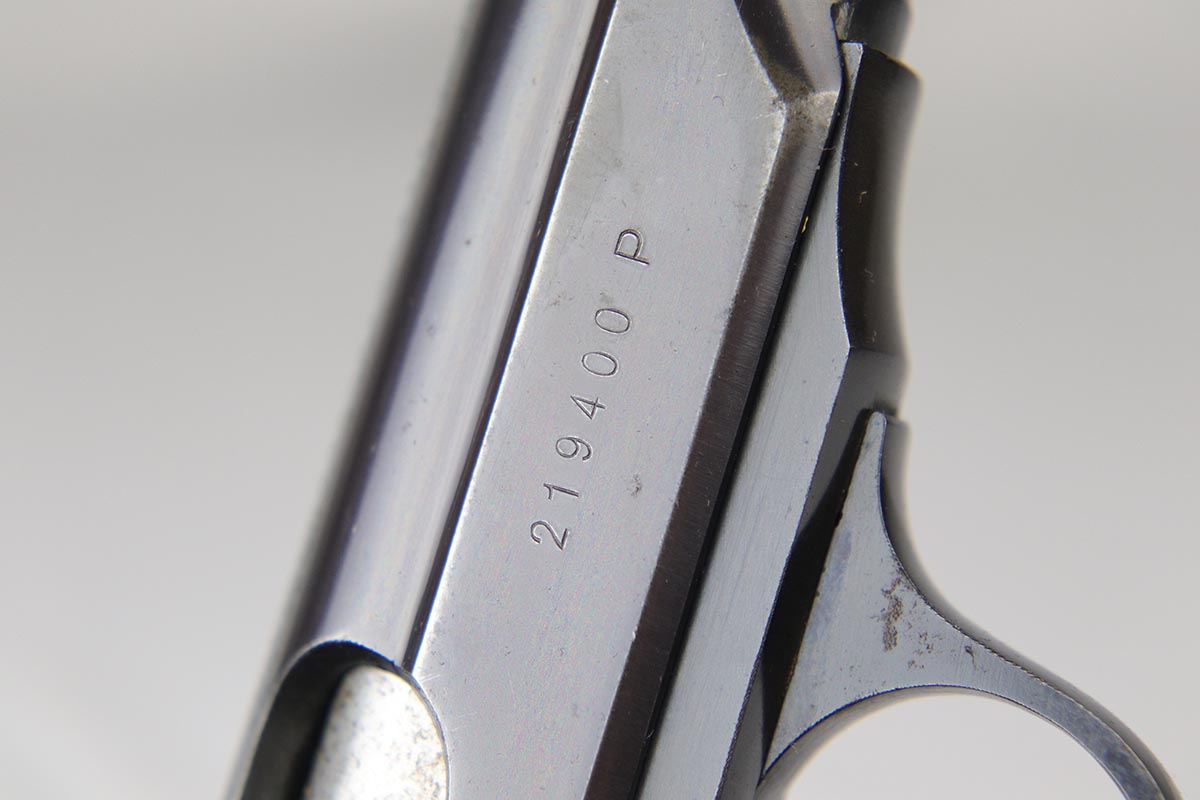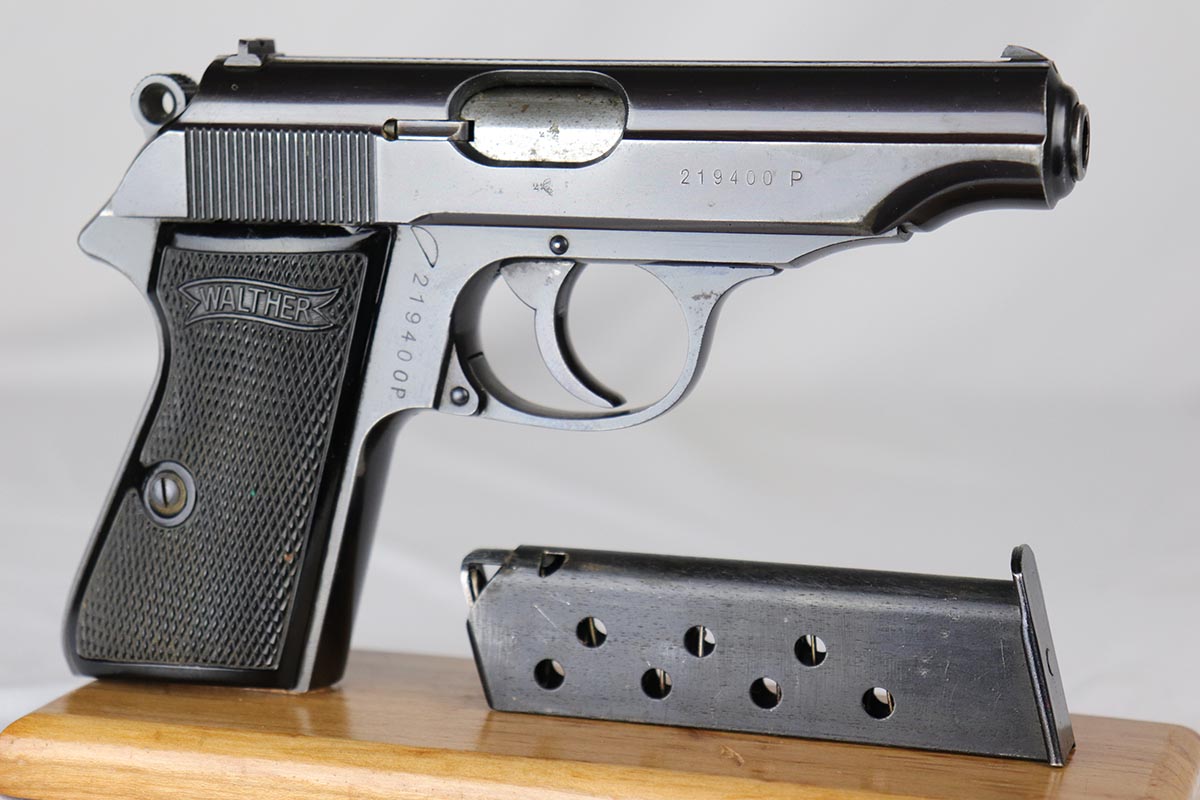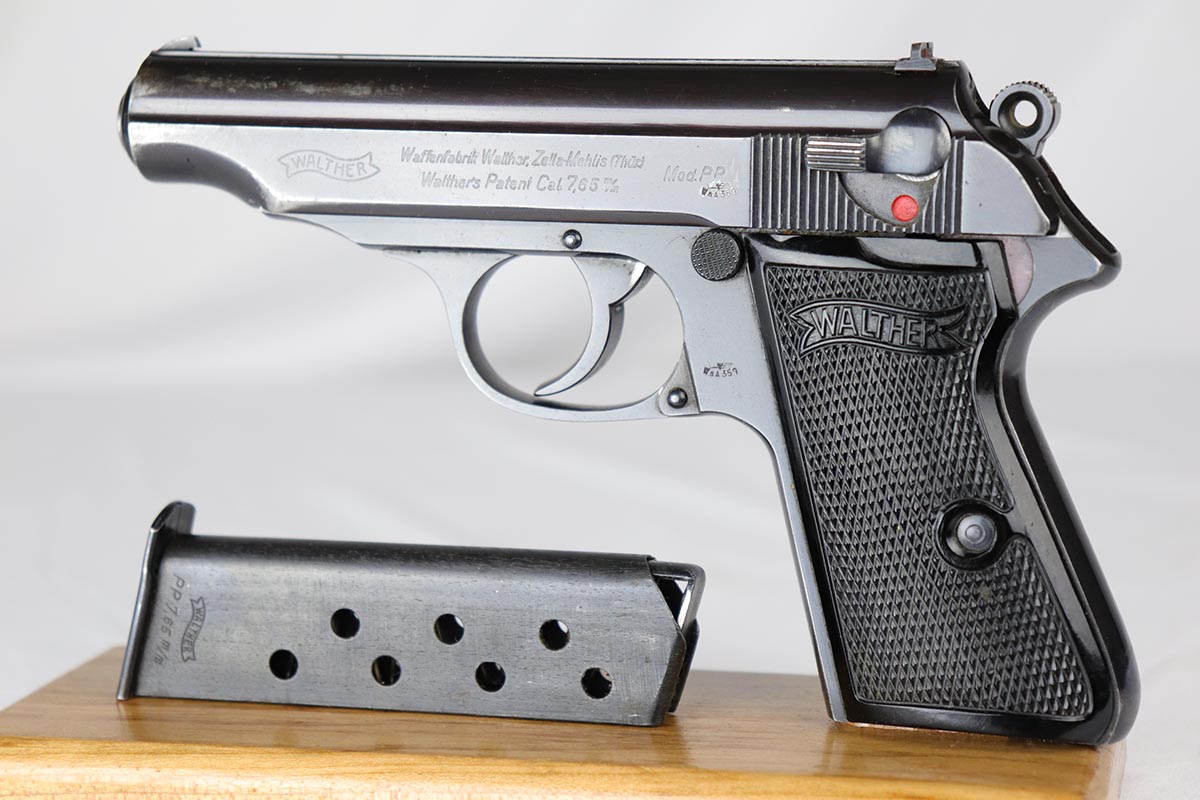 4/23/18 – This is an original Walther PP with a waffen military proof stamp on the frame and receiver. The pistol was made for the military during 1941. The pistol is all correct and matching with about 92% of the bluing in tact. There’s wear on the slide especially near the muzzle. There a light hint of purple hue on the finish of the slide. The slide has the majority of the wear, with thinning on both sides as well as the edge wear. The front and back straps have a little spotty wear as well and show signs of use. There’s light patina throughout the straps. The bore is in minty condition. Guaranteed original and authentic.