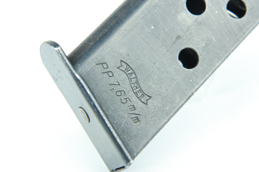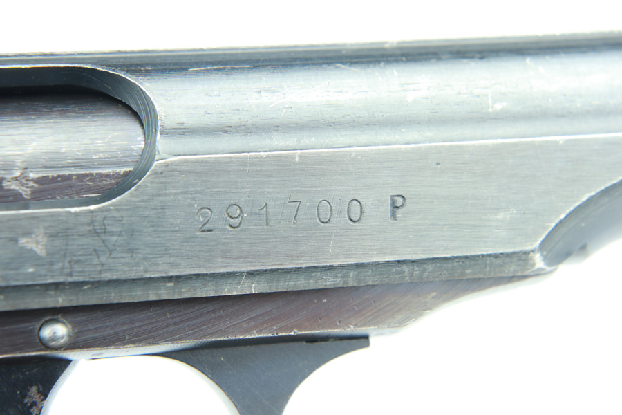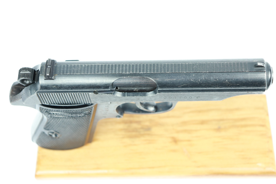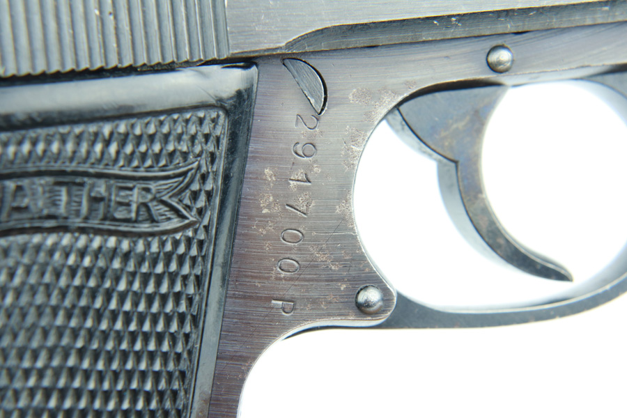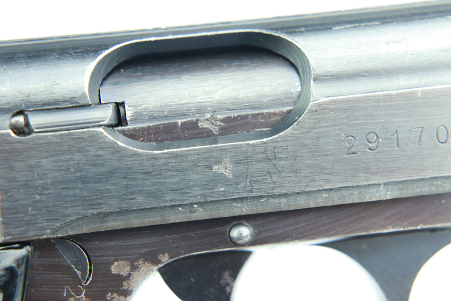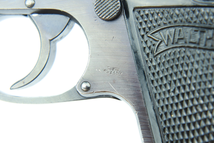 11/12/18 – This is an original WW2 wartime production Walther PP that was proofed for and sent to the nazi army. The pistol has a military waffen WaA359 proof stamp on both the frame and slide. The wartime dust blued finish leaves some machine marks on the frame and slide, but this is how it left the factory. Overall finish is in about 95-96%. There’s some light discoloration on the front strap but overall the straps are very nice. The bore is excellent – a 9 out of 10 overall. Comes with original grips and wartime magazine. Guaranteed original and fully functional.