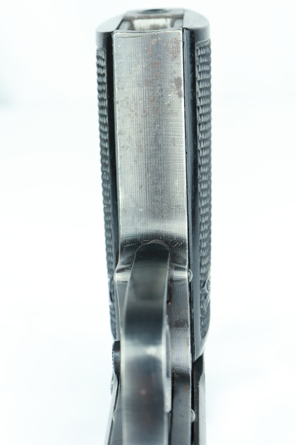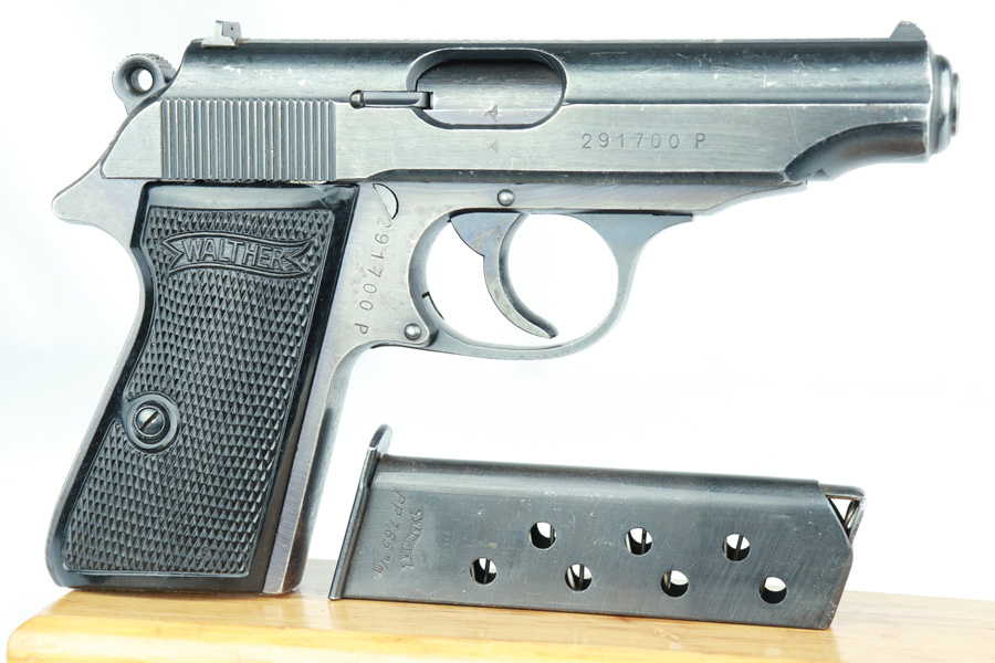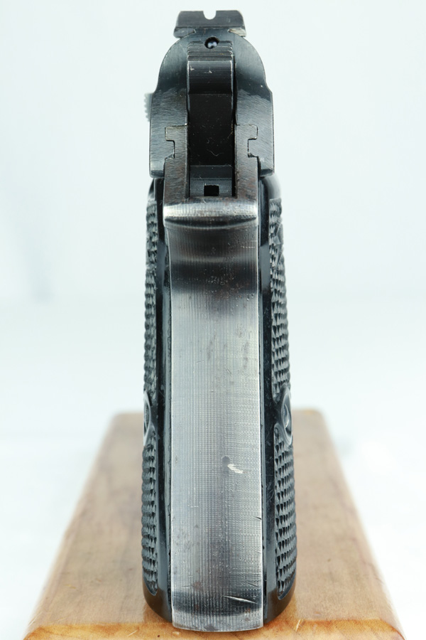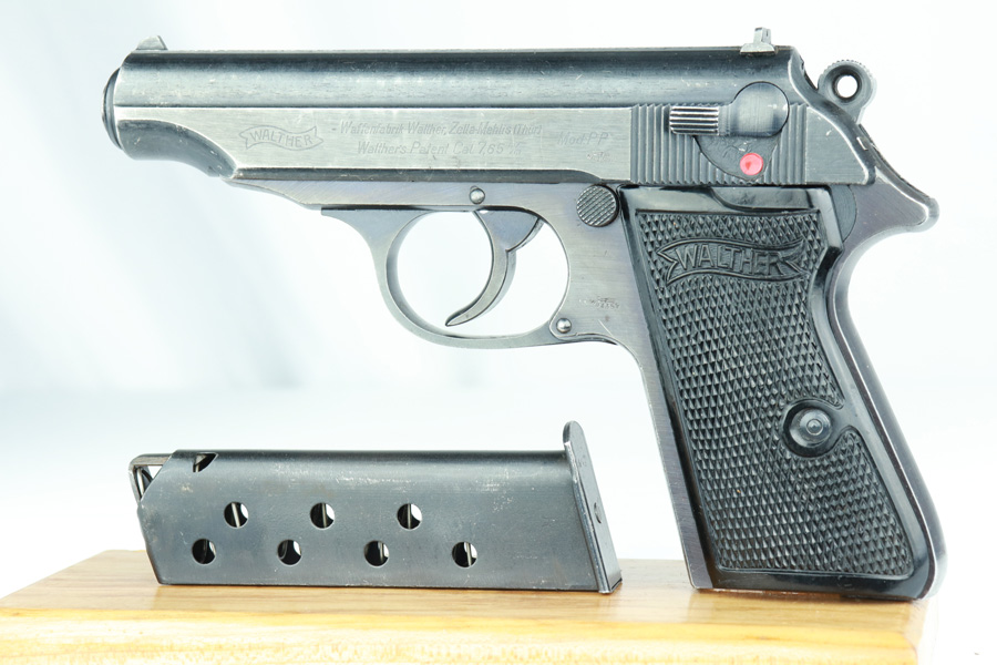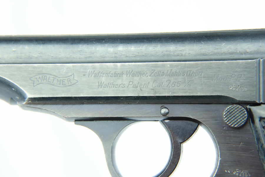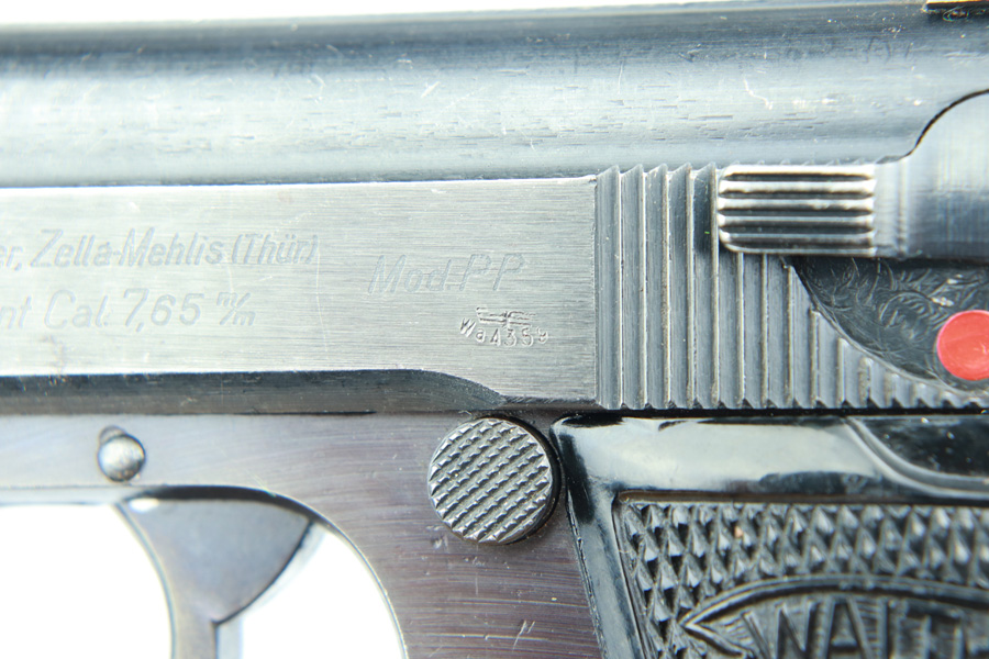 11/12/18 – This is an original WW2 wartime production Walther PP that was proofed for and sent to the nazi army. The pistol has a military waffen WaA359 proof stamp on both the frame and slide. The wartime dust blued finish leaves some machine marks on the frame and slide, but this is how it left the factory. Overall finish is in about 95-96%. There’s some light discoloration on the front strap but overall the straps are very nice. The bore is excellent – a 9 out of 10 overall. Comes with original grips and wartime magazine. Guaranteed original and fully functional.