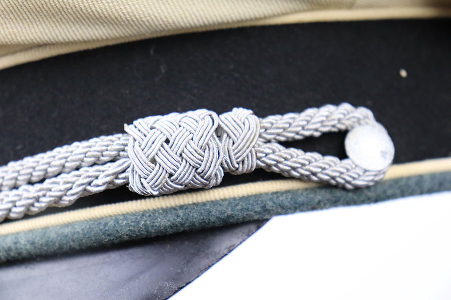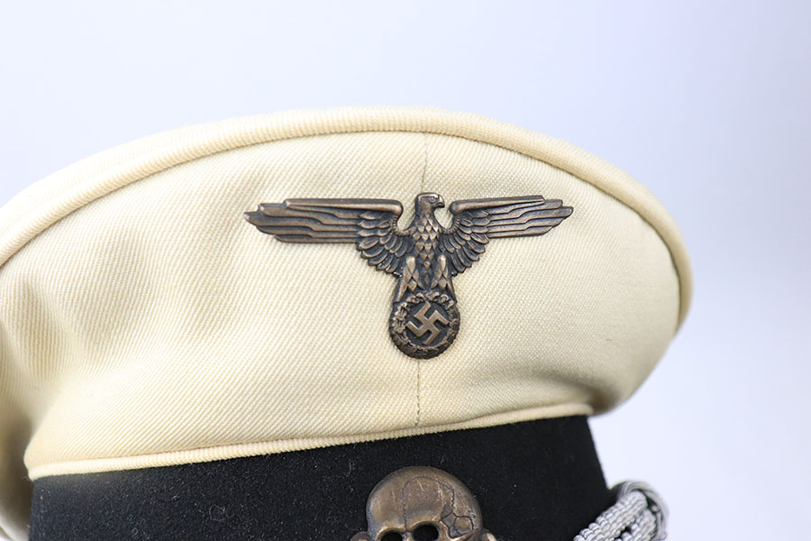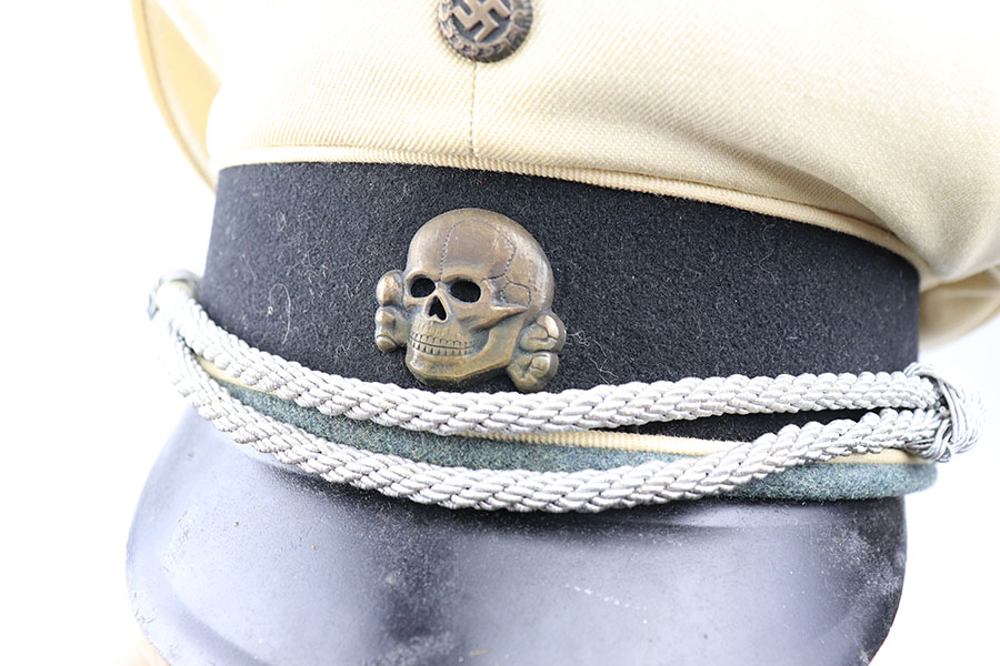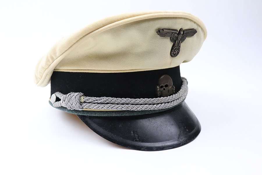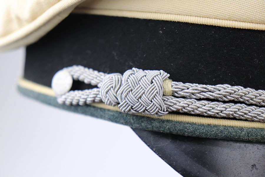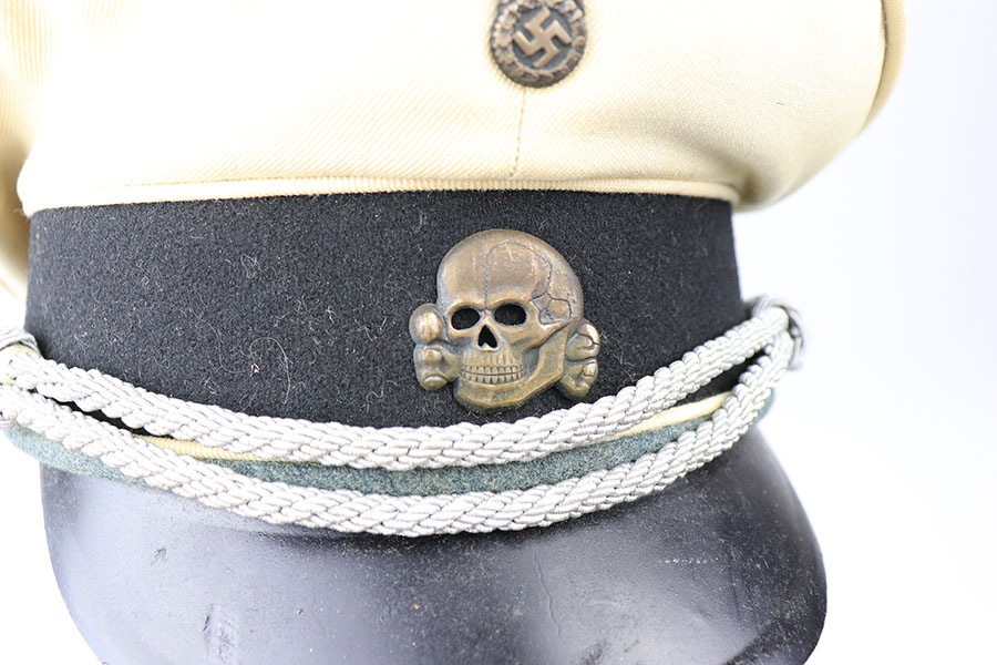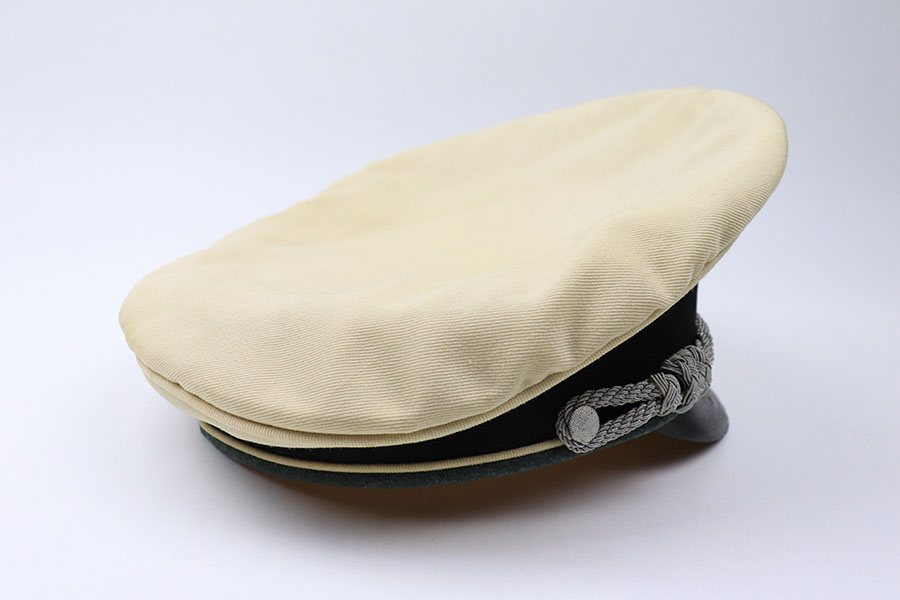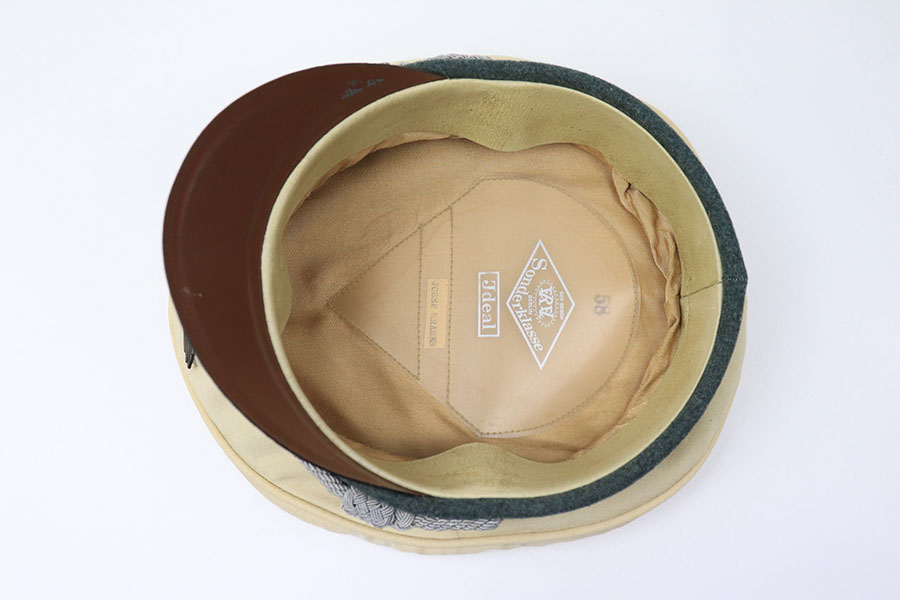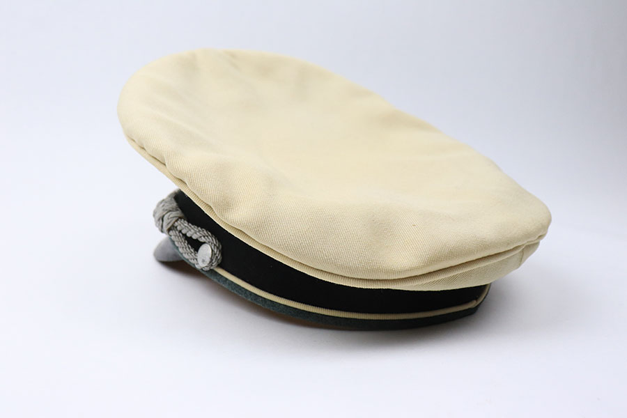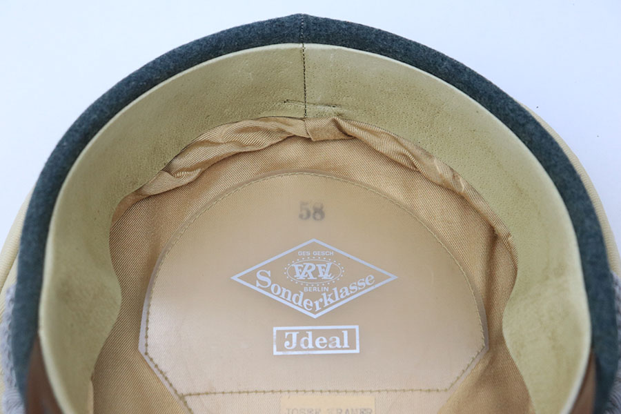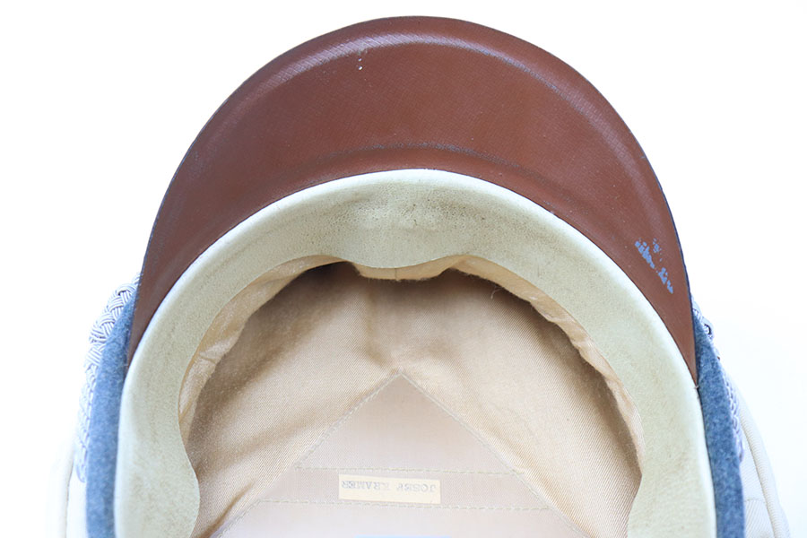6/23/21 – This is a reproduction waffen SS Summer visor cap. Priced accordingly. A good opportunity to buy a high quality, rare SS cap at over half the cost of a verified original. The cap is an excellent example in beautiful condition. No issues or stains in the wool, and a clean interior. Some mild surface discoloration on the leather headband. Size 58, and named to “Josef Kramer” on the interior.