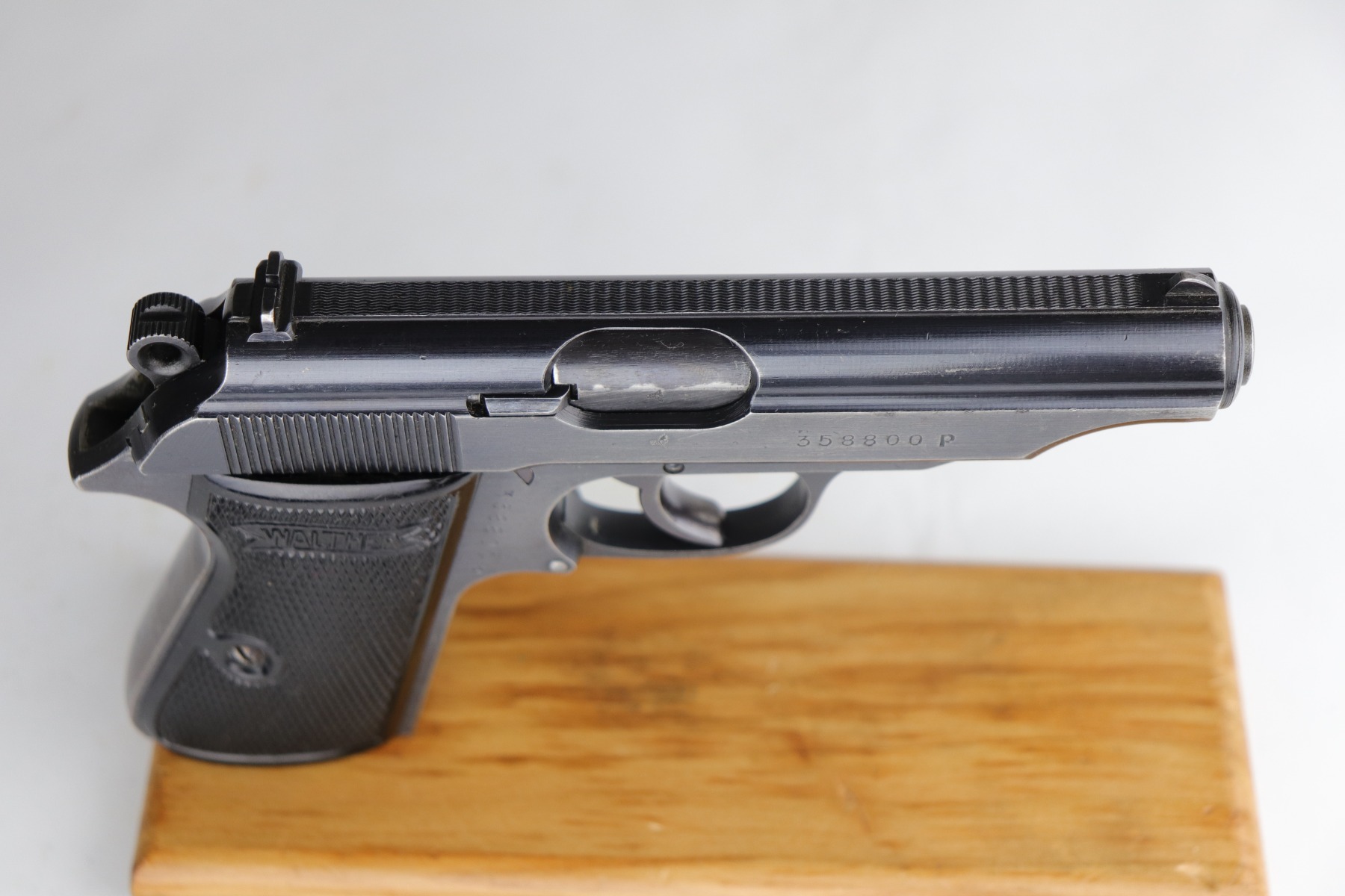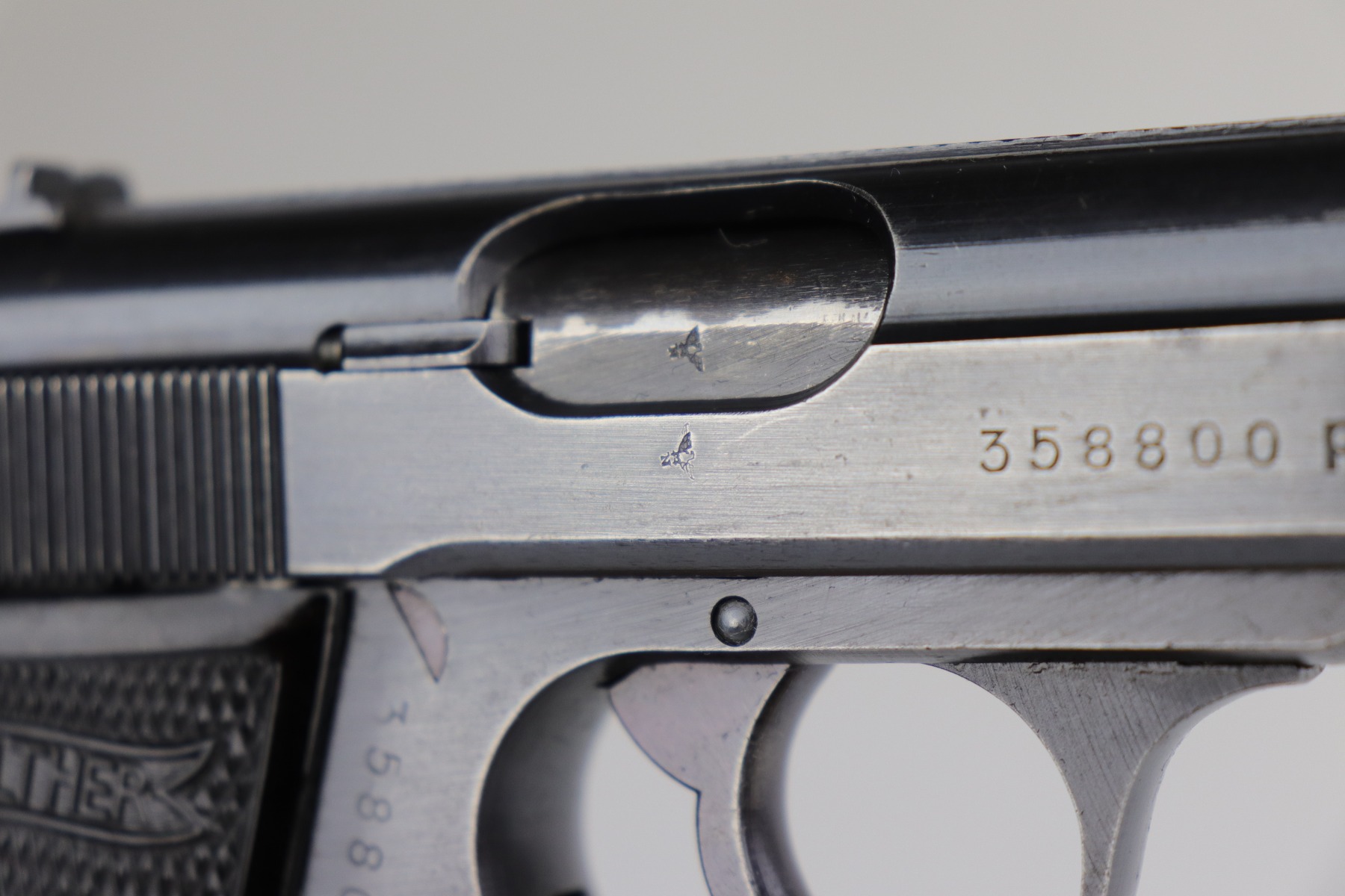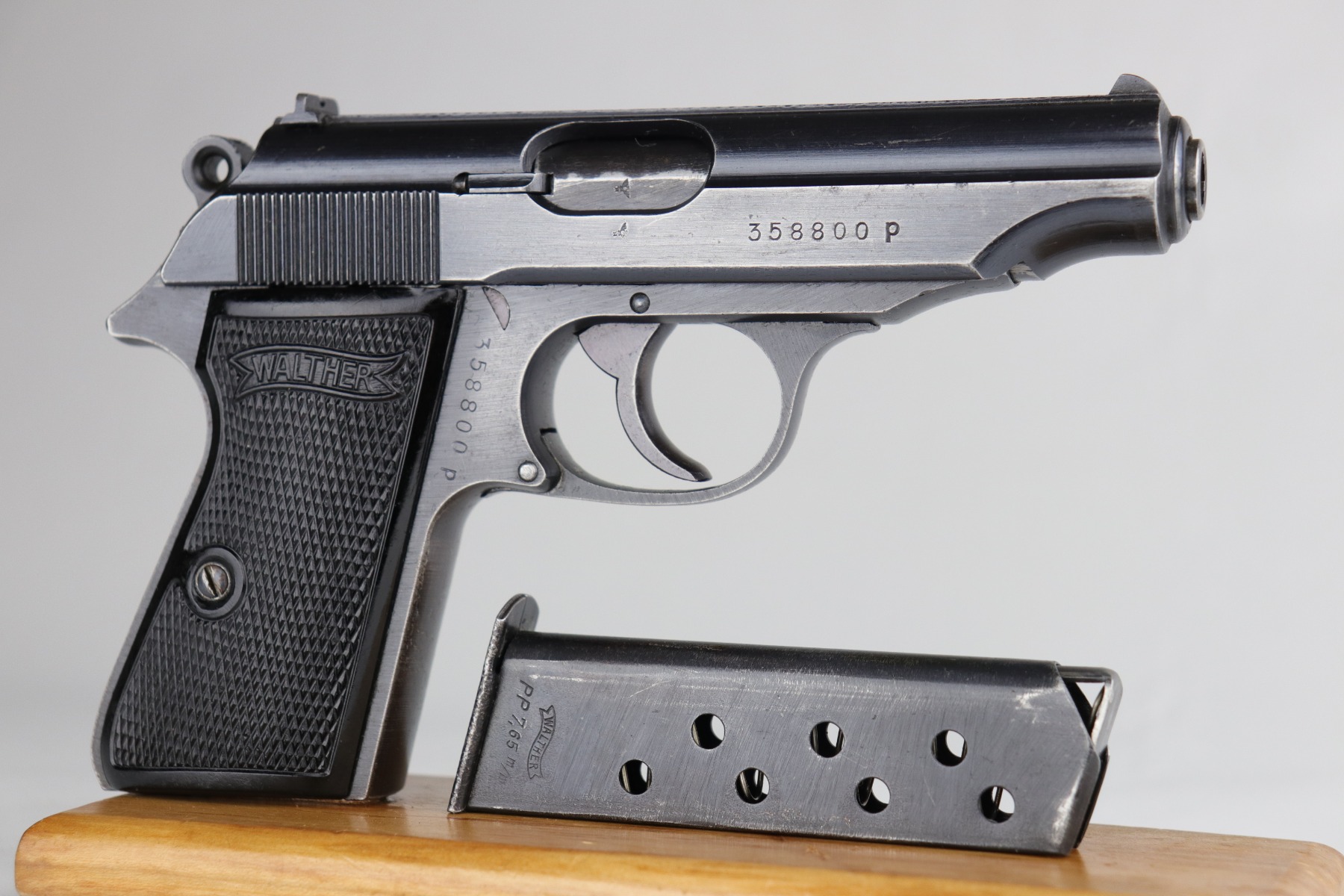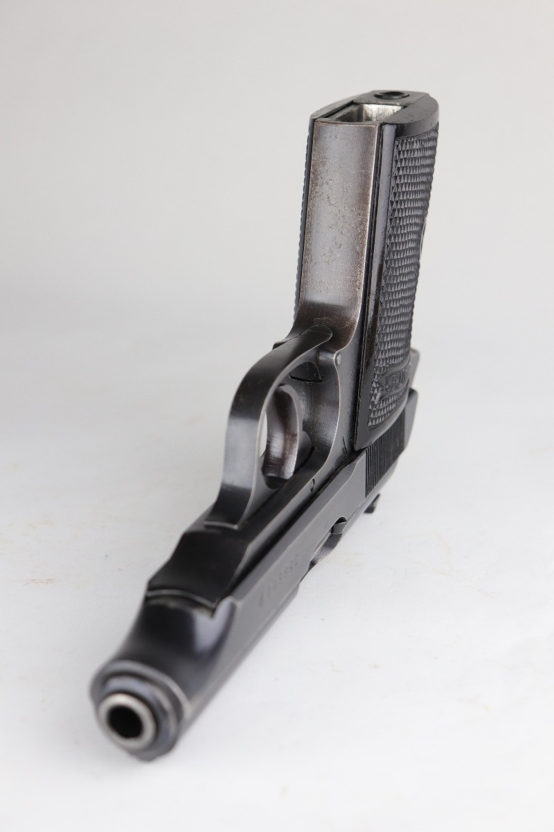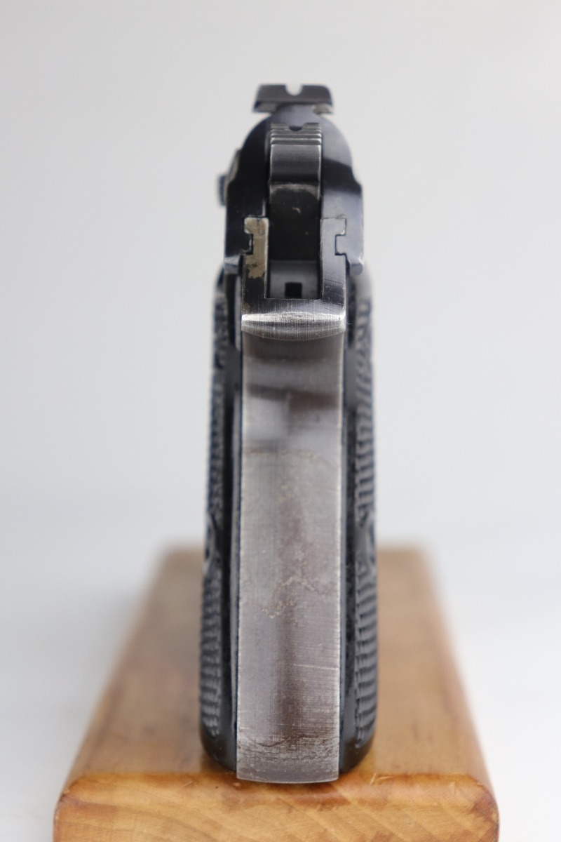 7/15/20 – This is an original Waffen-proofed Walther PP pistol, issued to the Nazi military in 1944. The frame and slide are appropriately “Waffen 359” proofed. The gun is also “Eagle N” proofed. It is all matching. Overall, the gun is in great condition, retaining roughly 85% of its original finish. There is minor high edge/muzzle wear but most of the wear is on the straps. There are areas of splotchy discoloration on both of the straps and very minor brown patina. There is very minor freckling here and there, especially on the left side of the slide near the tang. The bore is excellent – shiny with strong rifling with minor frosting in the grooves. It comes with a proper wartime magazine.