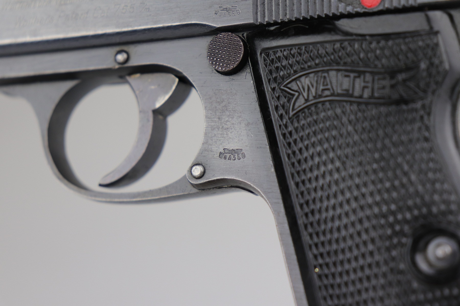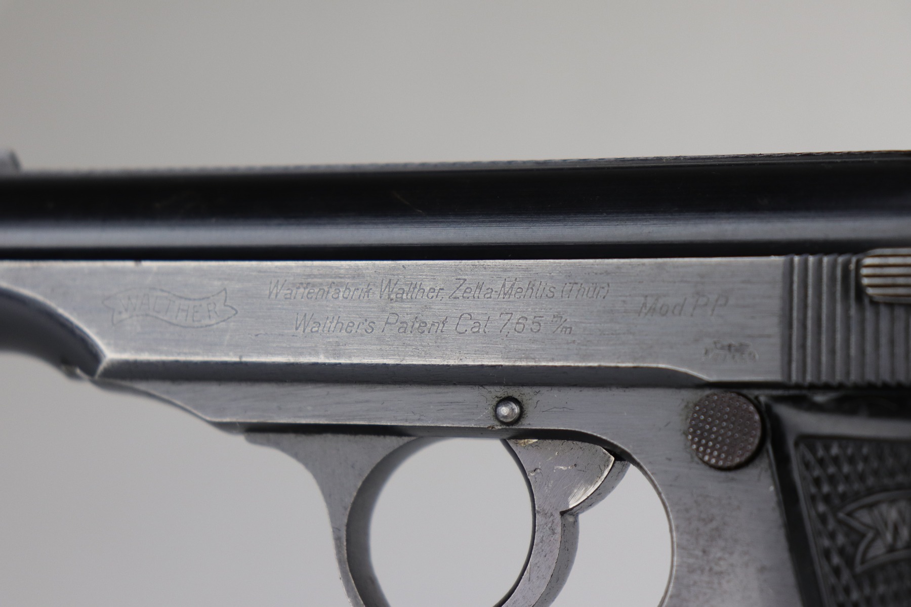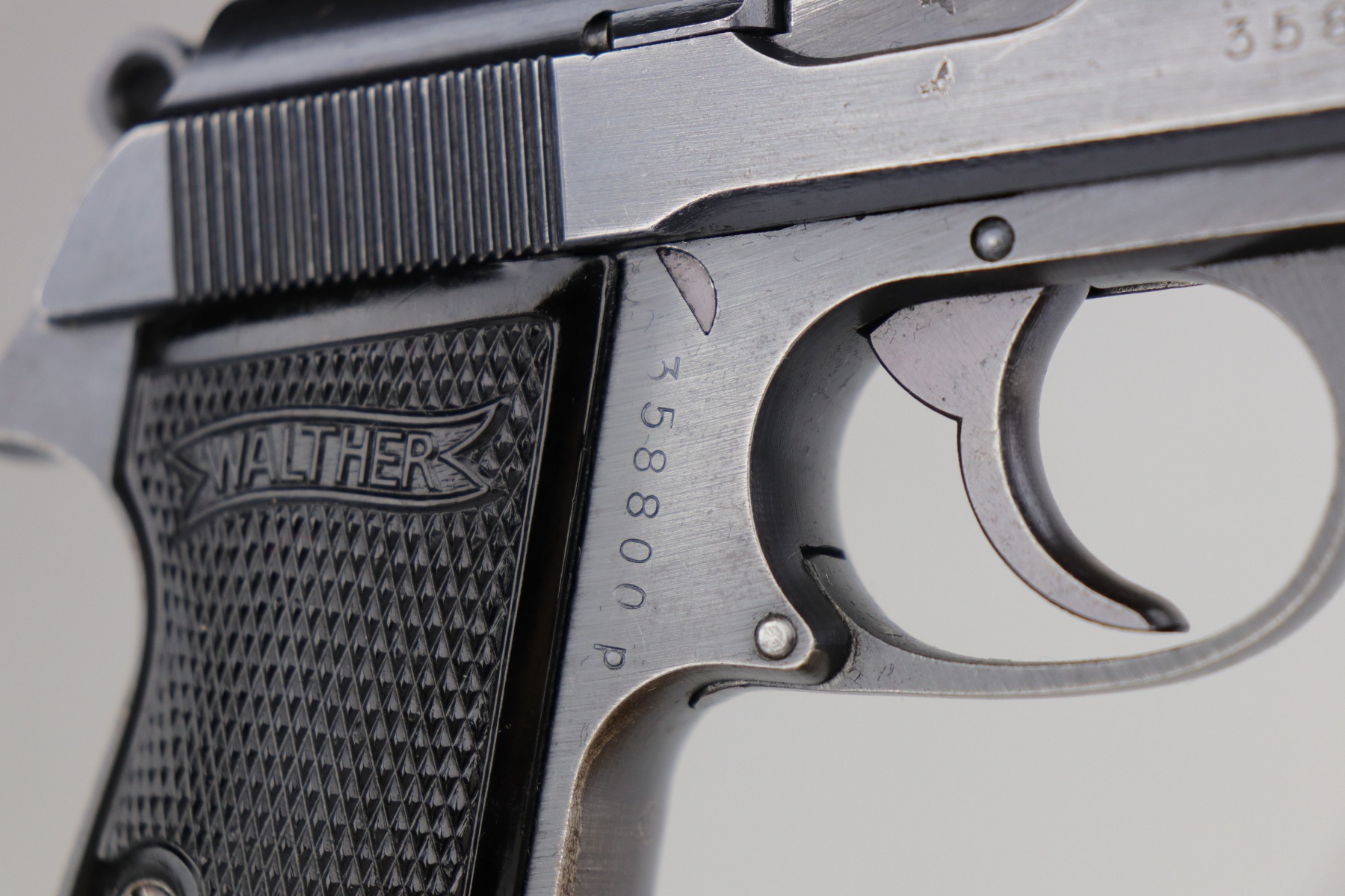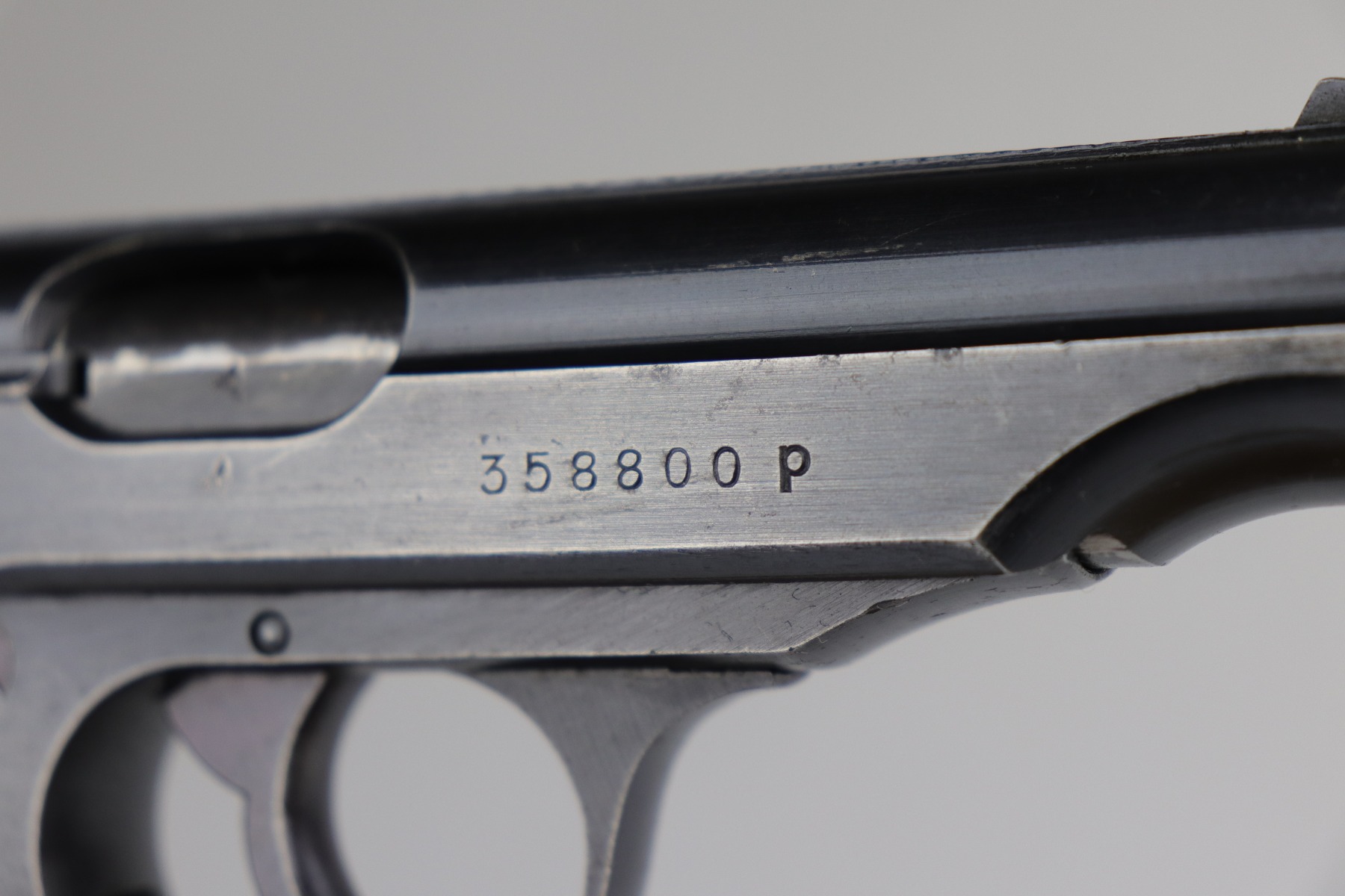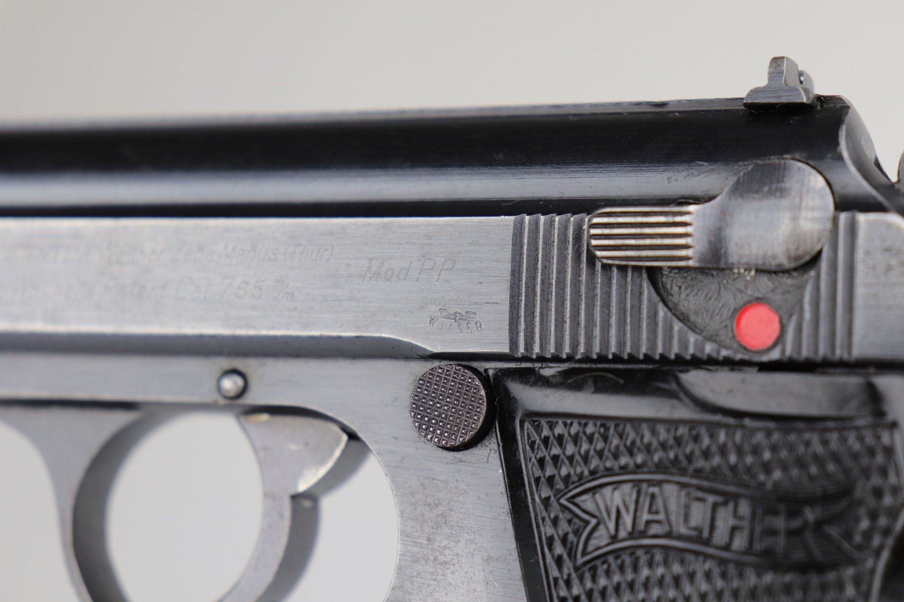 7/15/20 – This is an original Waffen-proofed Walther PP pistol, issued to the Nazi military in 1944. The frame and slide are appropriately “Waffen 359” proofed. The gun is also “Eagle N” proofed. It is all matching. Overall, the gun is in great condition, retaining roughly 85% of its original finish. There is minor high edge/muzzle wear but most of the wear is on the straps. There are areas of splotchy discoloration on both of the straps and very minor brown patina. There is very minor freckling here and there, especially on the left side of the slide near the tang. The bore is excellent – shiny with strong rifling with minor frosting in the grooves. It comes with a proper wartime magazine.