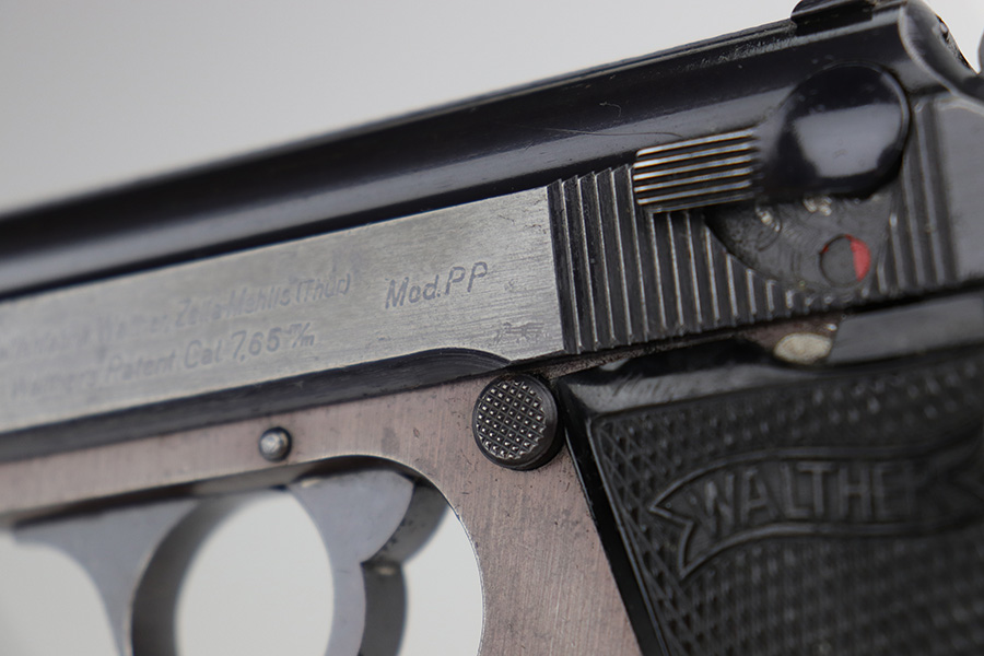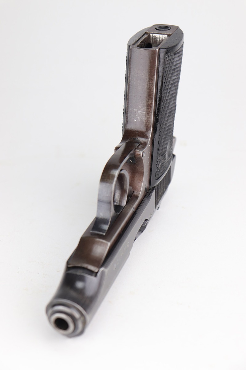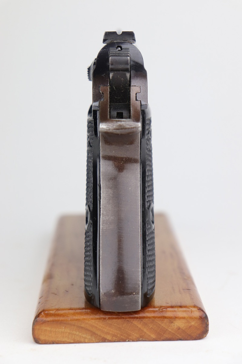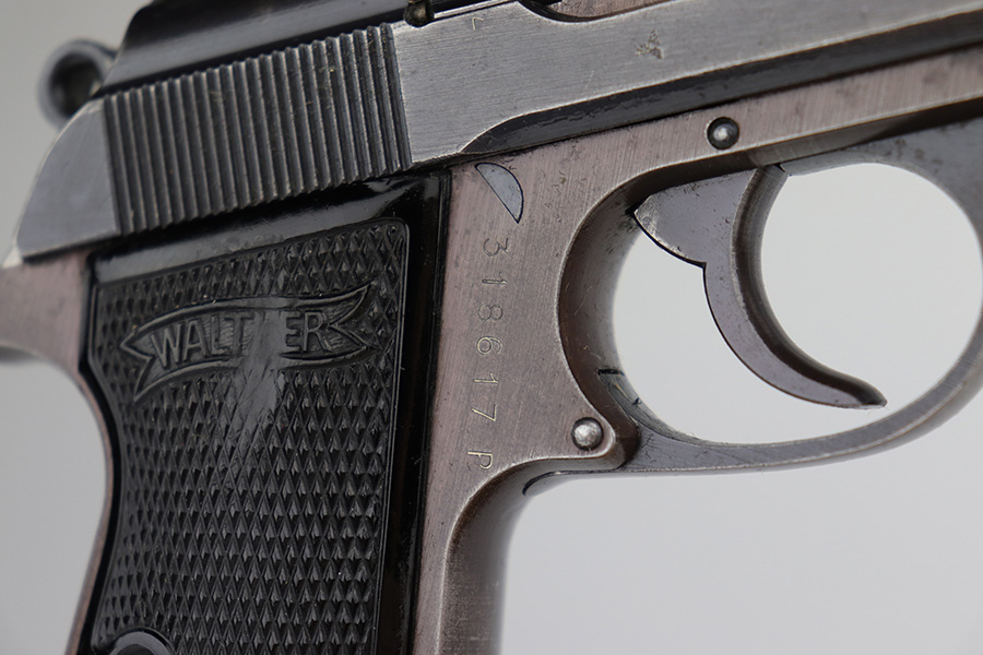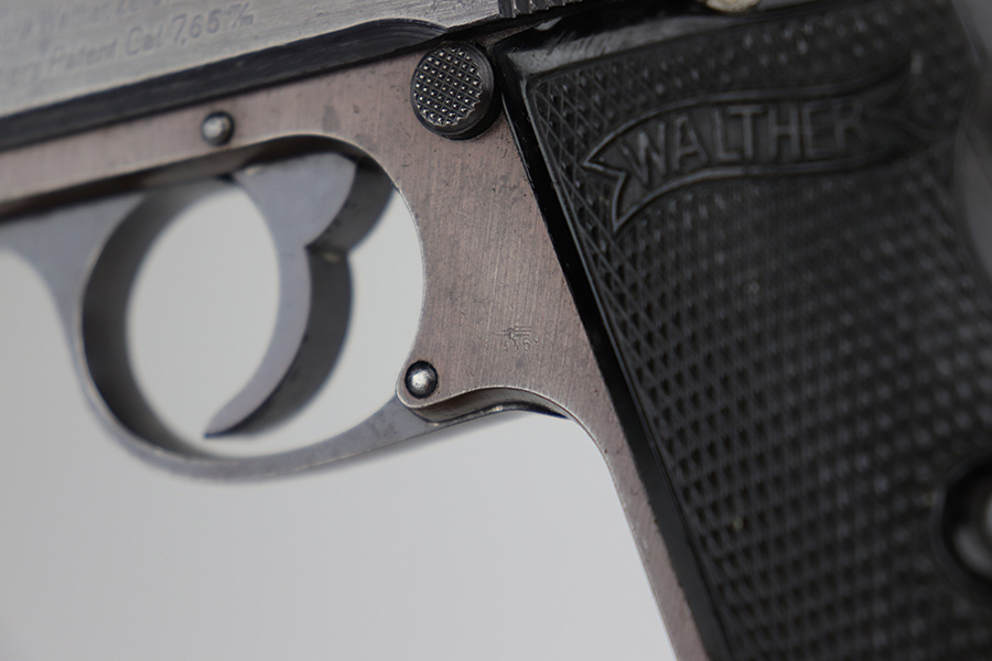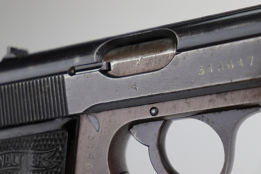 1/10/23 – This is a nice example of a Walther PP issued to the Nazi military in 1943. It is all matching and has the proper “Waffen 359” military acceptance proofs on the slide and frame. It has retained roughly 80% of its original wartime finish. The majority of the finish loss is along the left side of the slide. There is what looks like finish loss on both sides of the frame, but we believe the finish is just thin by nature. Some light wear and brown patina on the grip straps. Some minor wear along the right side of the slide, concentrated mostly around the high edges. Some spotty oxidation and minor pitting on the left side of the slide near the muzzle. Fitted with nice period-correct grips – small chip at the top of the left panel. Comes with a Walther banner-only magazine. Very nice bore with great rifling.