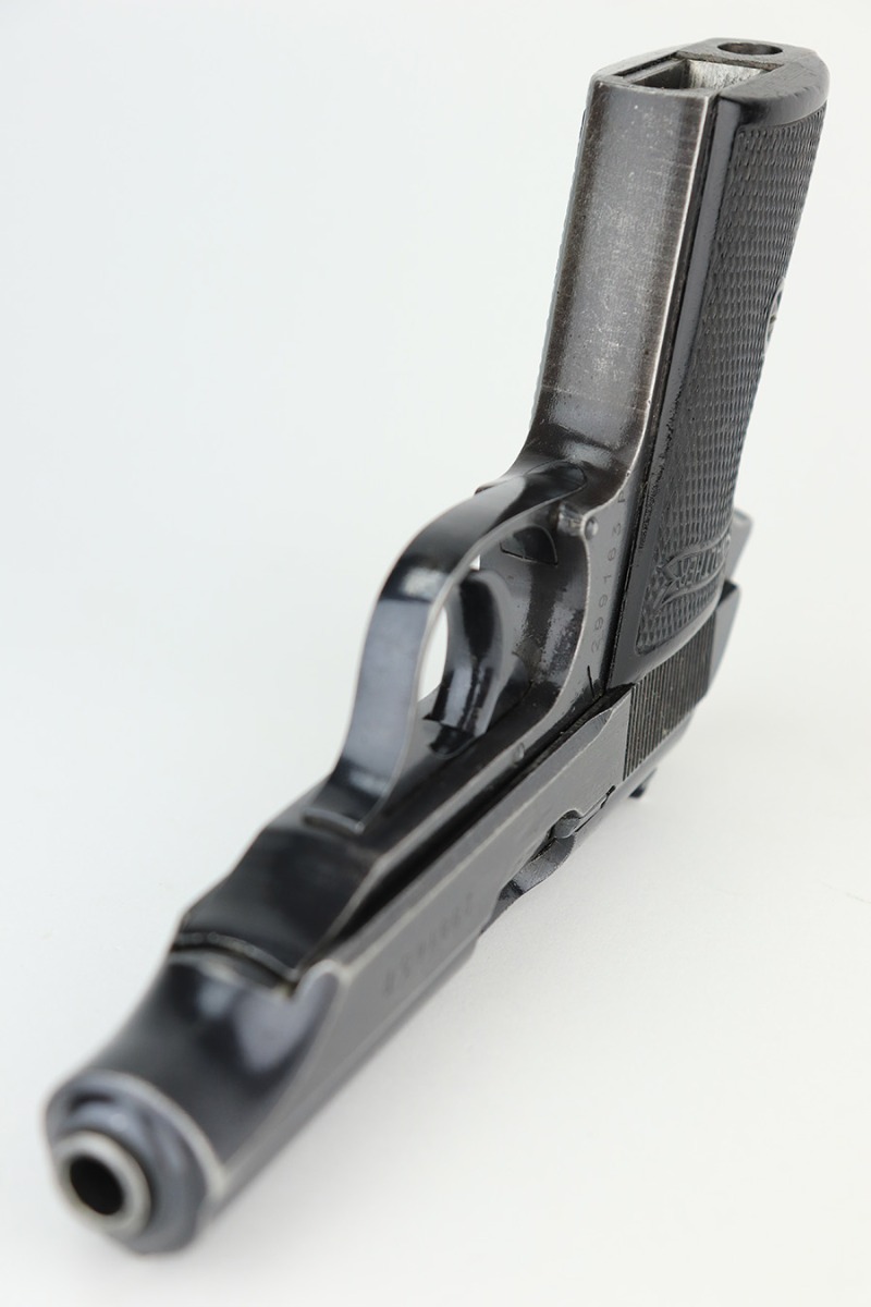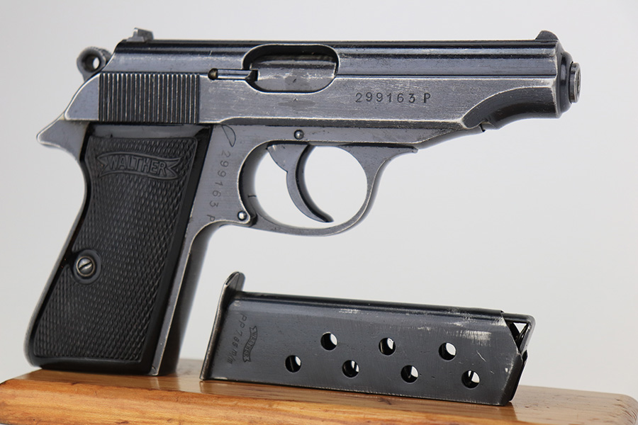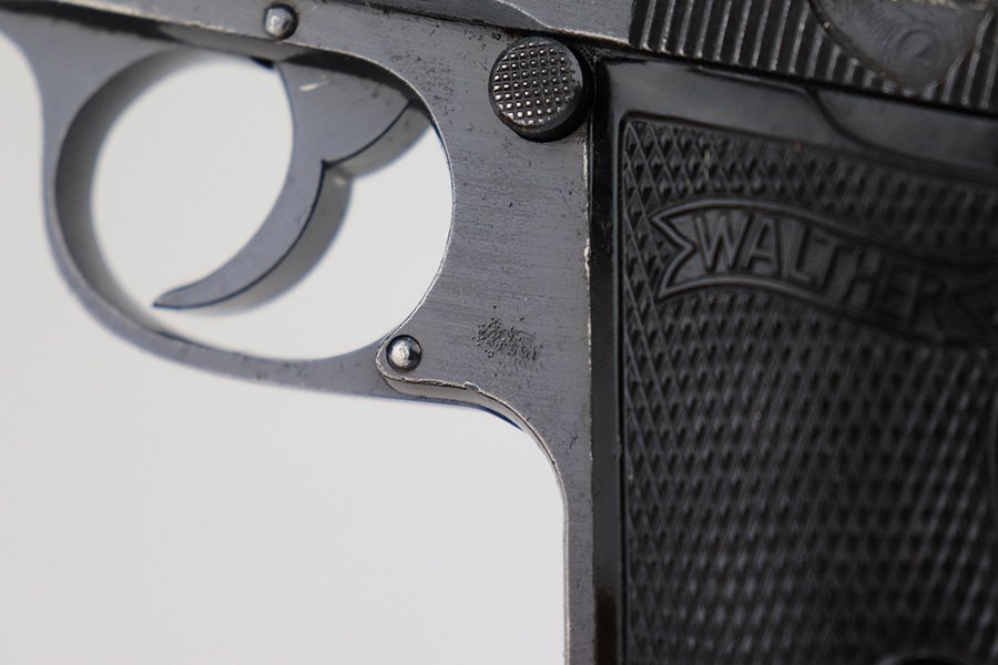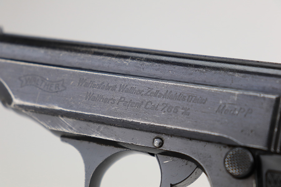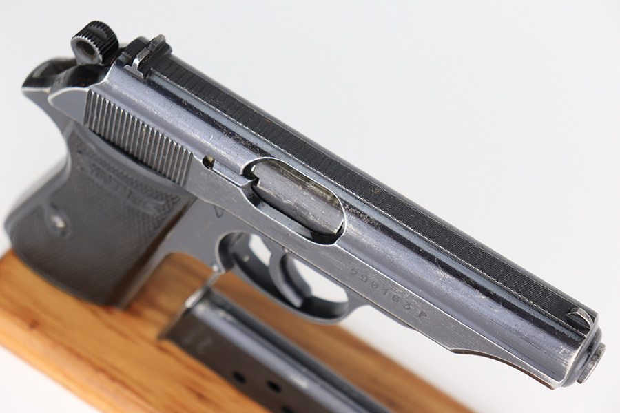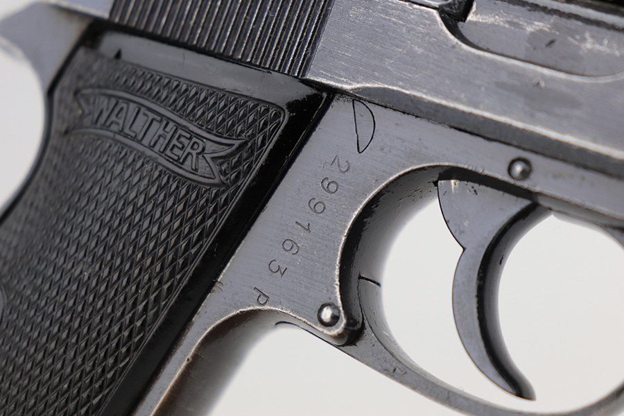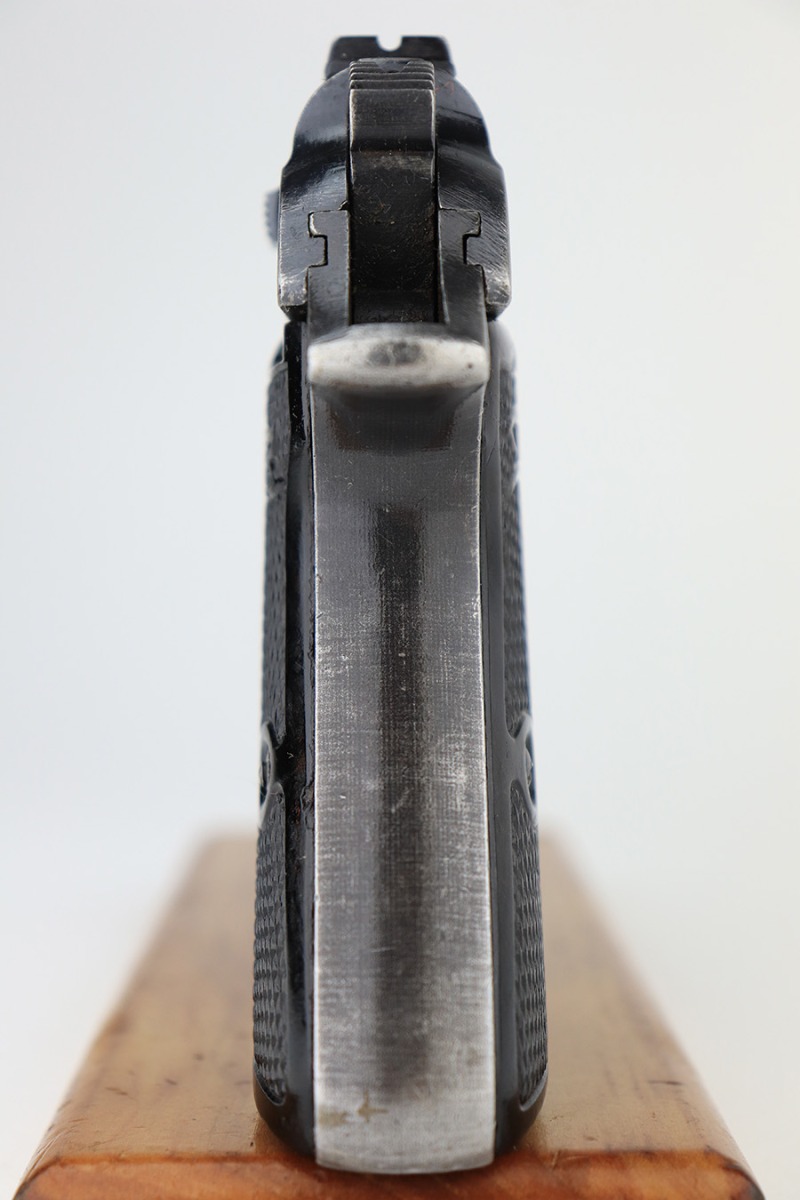 3/3/23 – This is a nice example of a Walther PP issued to the Nazi military in 1943. It is all matching and has the proper “Waffen 359” military acceptance proofs on the left side of the slide and frame. The “Eagle N” firing proofs on the barrel and right side of the slide have been scrubbed. The entire gun has been reblued, and it has retained roughly 85% of its finish. There is some thinning / dulling on the grip straps and light scratchy wear along both sides of the slide. Fitted with nice period-correct black bakelite grips – a tiny chip along the edge of the left panel. Comes with a period-correct wartime magazine. The bore has pin-pricking and light scratching throughout.