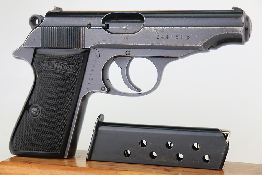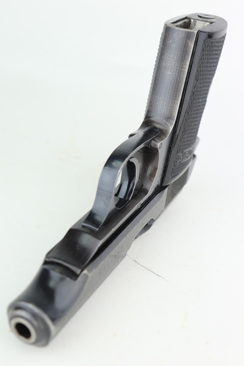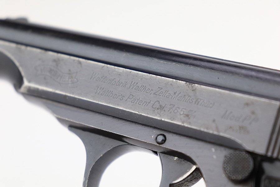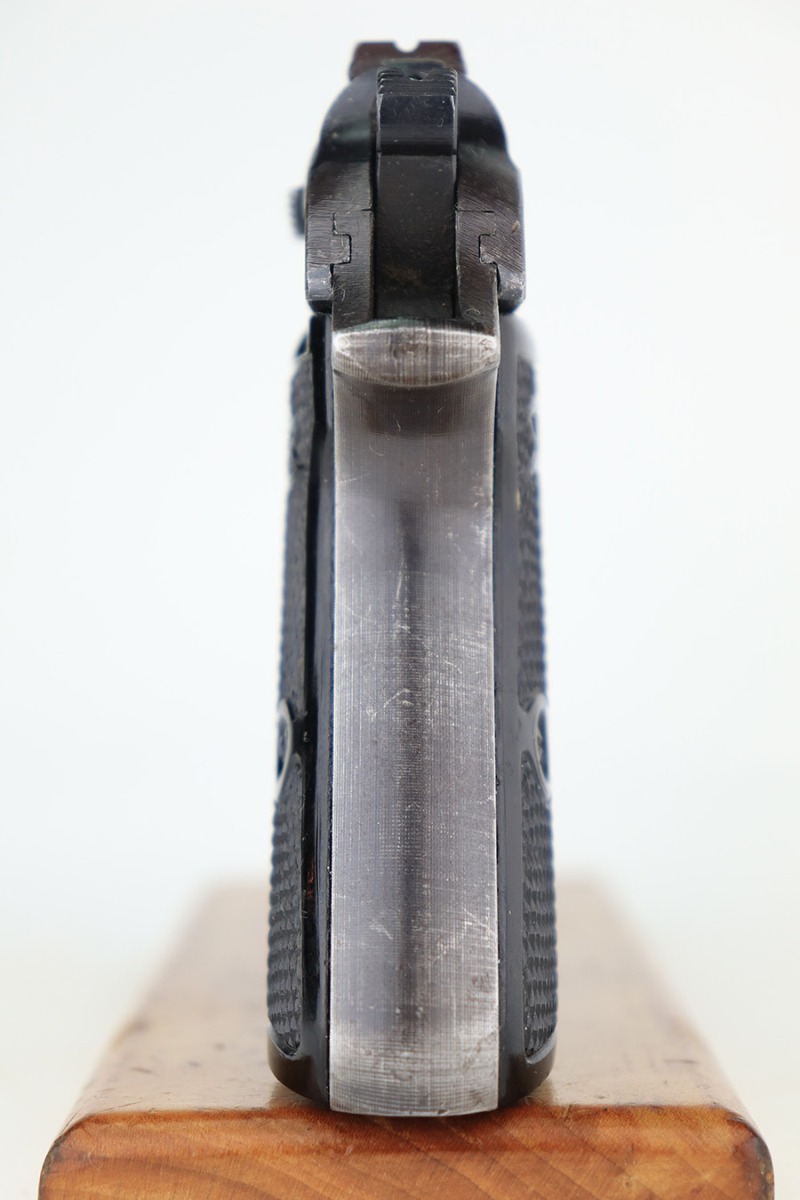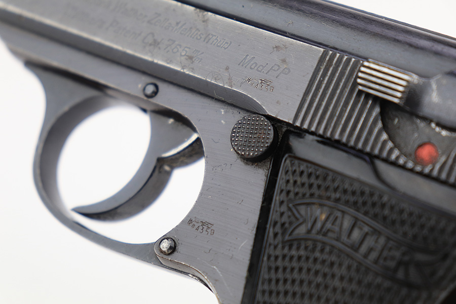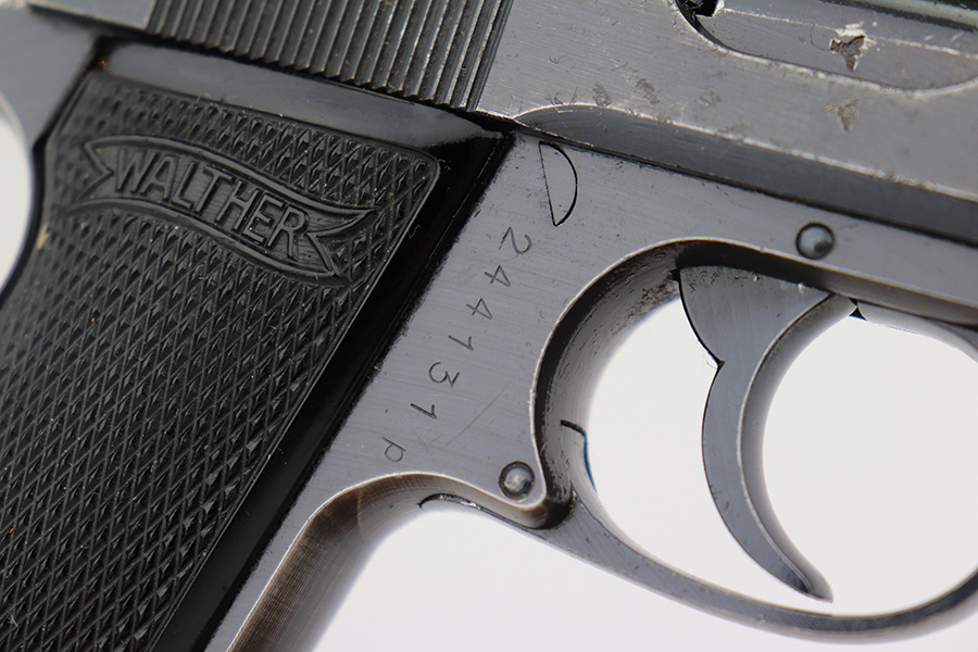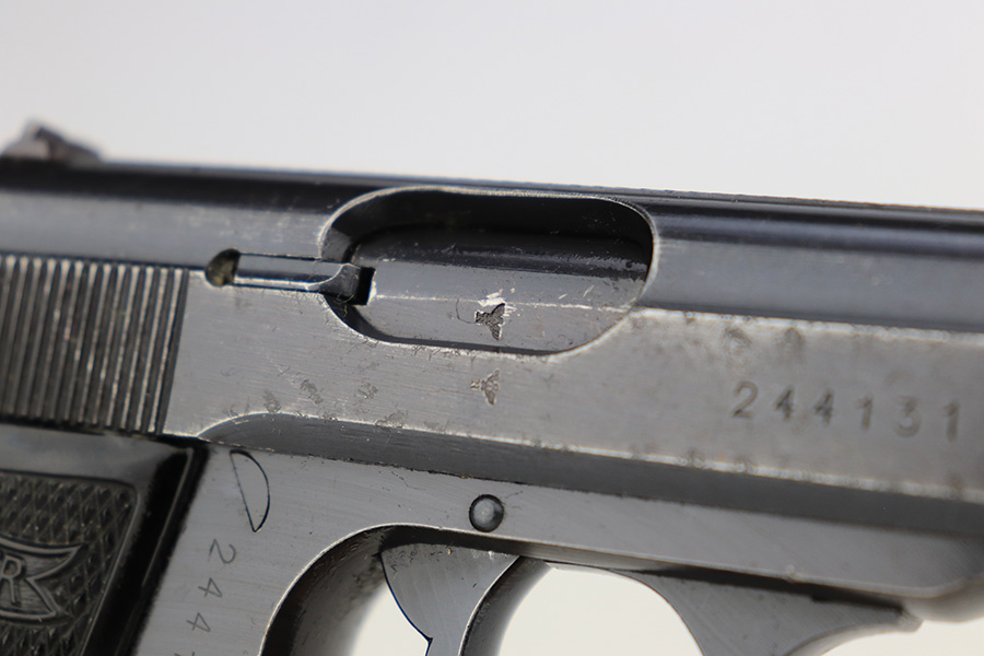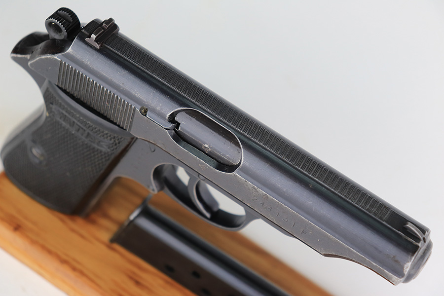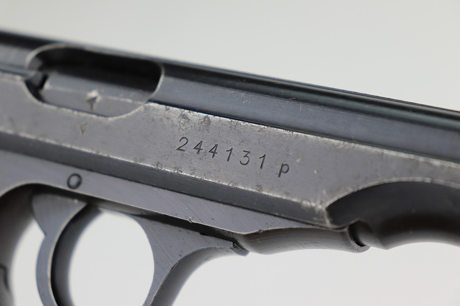 3/16/23 – This is a very nice example of a Walther PP issued to the Nazi military in 1941. All matching with the proper “Waffen 359” military acceptance proofs. It has retained about 93-94% of its original wartime finish. Minor wear around the muzzle, on the high edges of the slide, and minor thinning on the grip straps. Some tiny scratches and spots of pin-pricking here and there. Excellent period-correct black bakelite grips. Comes with a reproduction magazine. Mint bore. The hold-open does not work with this magazine.