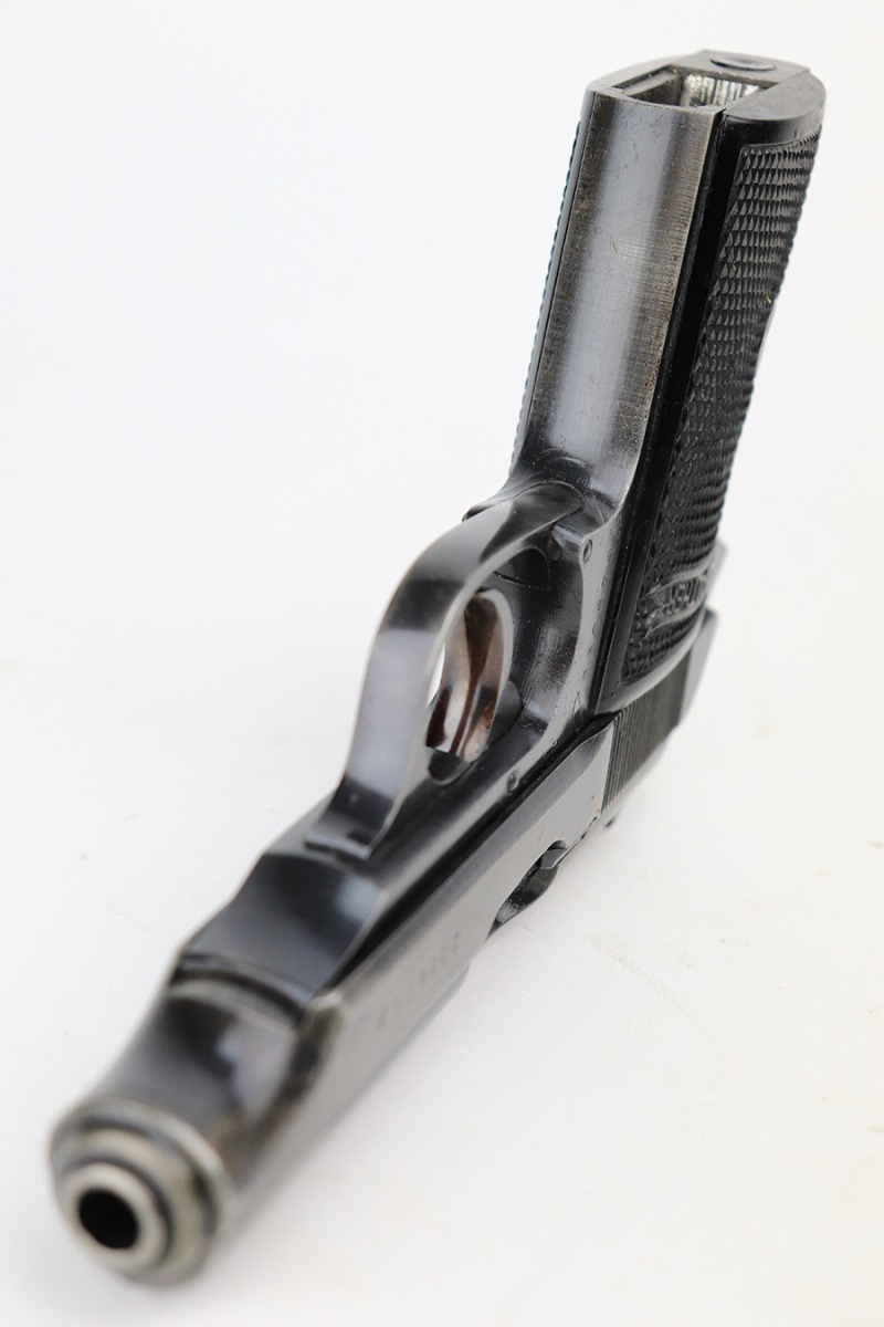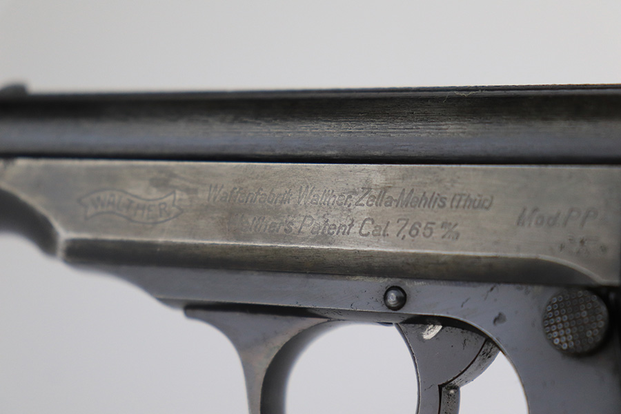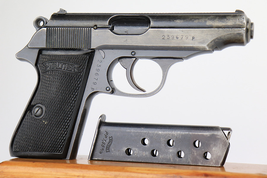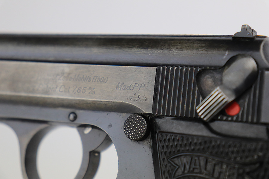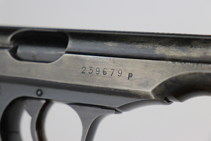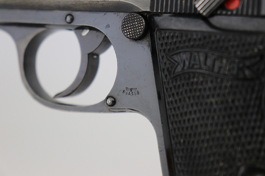 6/2/23 – This is a nice example of a Walther PP issued to the Nazi military in 1941. It is all matching and has the proper “Waffen 359” military acceptance proofs on the slide and frame. It has retained only roughly 30% of its original bluing with obvious finish loss throughout, most noticeable on the slide and on the grip straps. Minor pitting around the muzzle. Fitted with excellent period-correct black bakelite grips and comes with a proper wartime magazine. Mint bore.