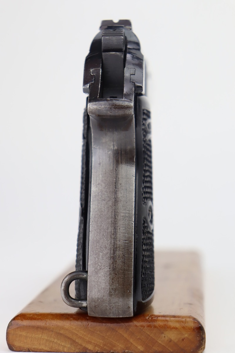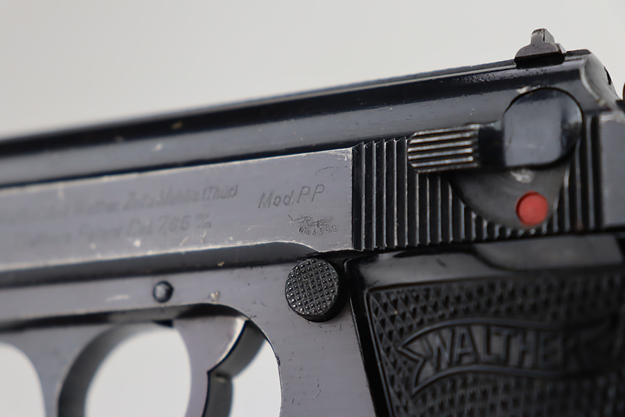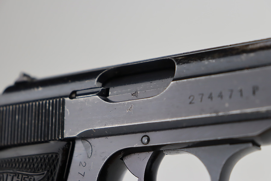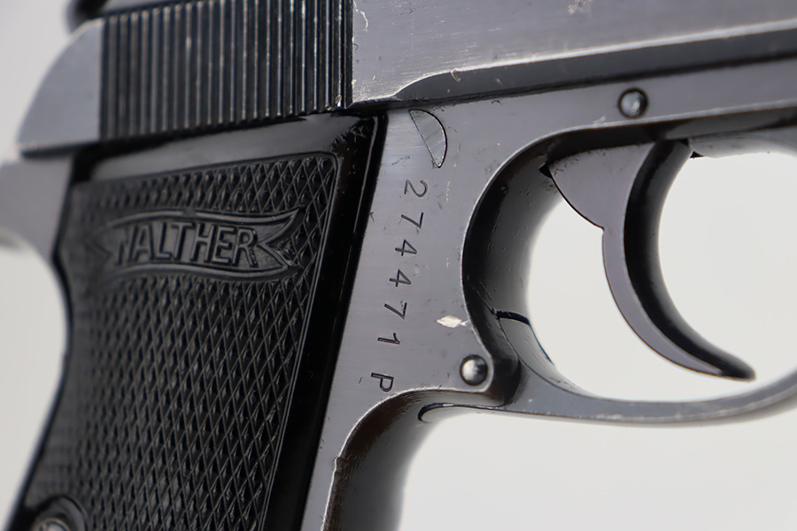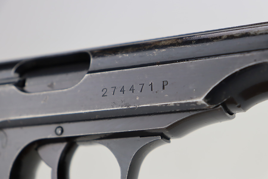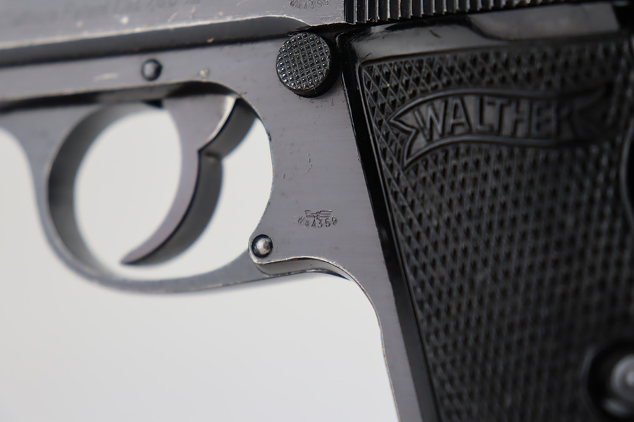 9/25/23 – This is a nice example of a Walther PP issued to the Nazi military in 1942. It is all matching and has the proper “Waffen 359” military acceptance proofs on the left side of the slide and frame. There is an added lanyard ring at the base of the left side of the frame, most likely done by the post-war French police. The gun has retained roughly 80% of its finish. The majority of the finish loss is on the back strap, but there is also minor muzzle wear and spotty wear along both sides of the slide. Fitted with excellent period-correct black bakelite grips. Excellent bore with strong rifling.