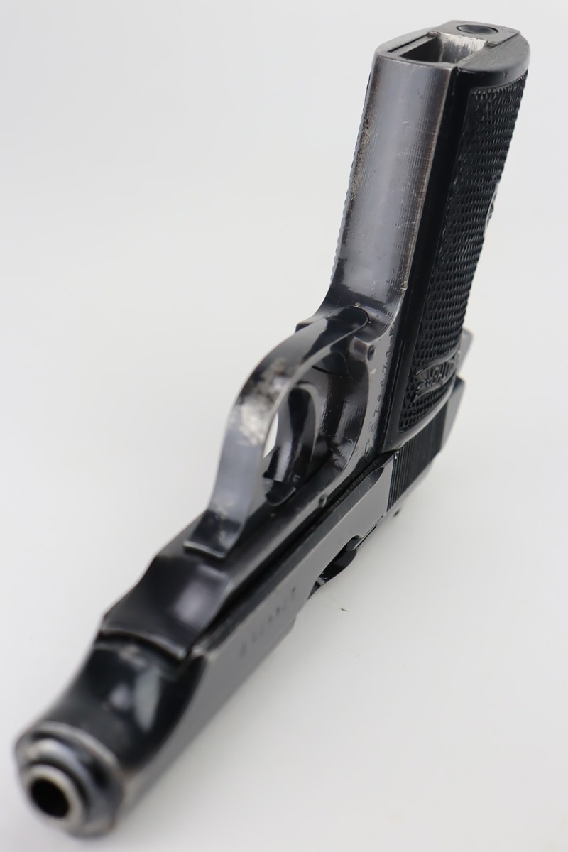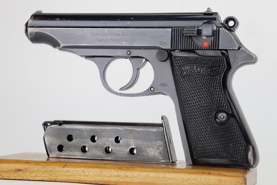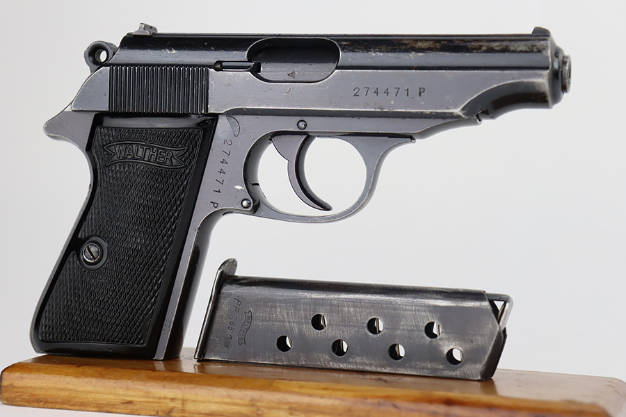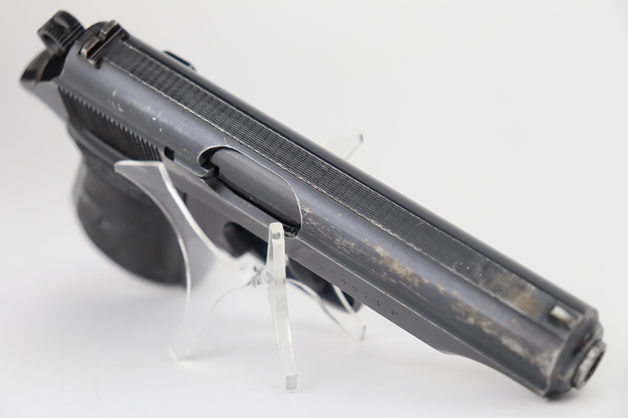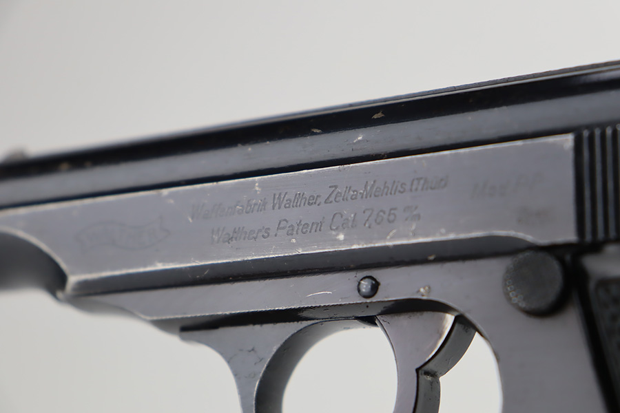9/25/23 – This is a nice example of a Walther PP issued to the Nazi military in 1942. It is all matching and has the proper “Waffen 359” military acceptance proofs on the left side of the slide and frame. There is an added lanyard ring at the base of the left side of the frame, most likely done by the post-war French police. The gun has retained roughly 80% of its finish. The majority of the finish loss is on the back strap, but there is also minor muzzle wear and spotty wear along both sides of the slide. Fitted with excellent period-correct black bakelite grips. Excellent bore with strong rifling.