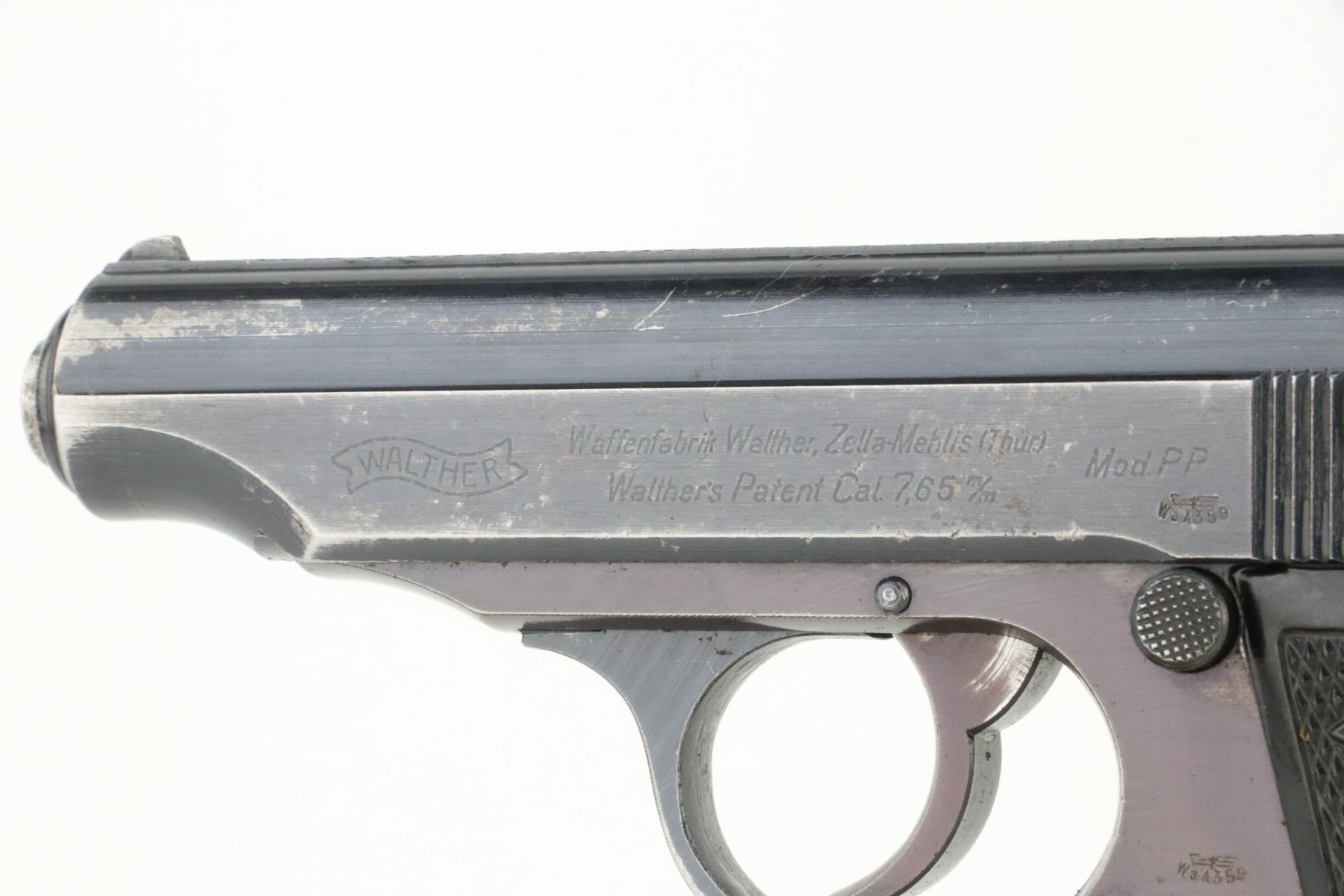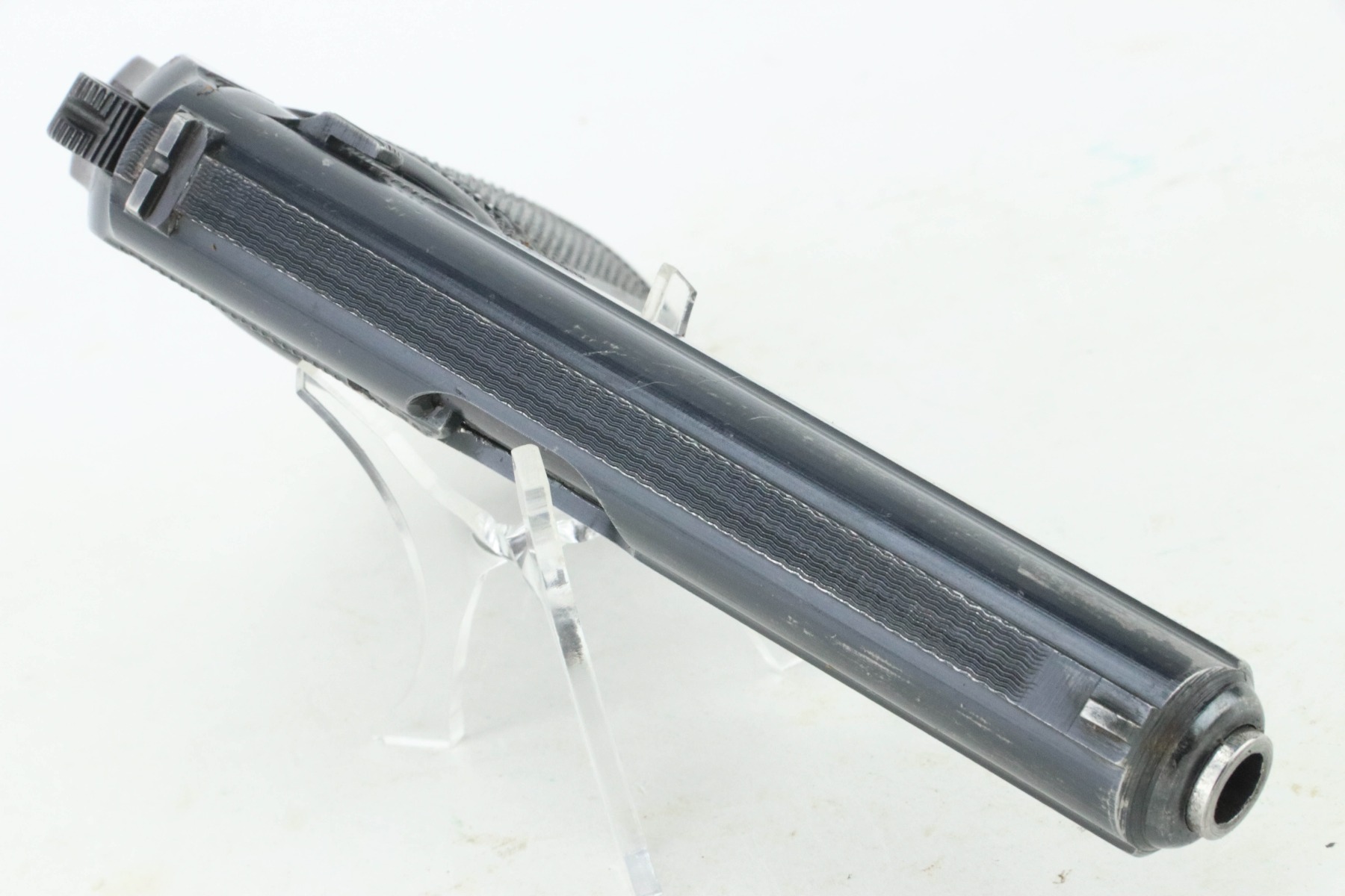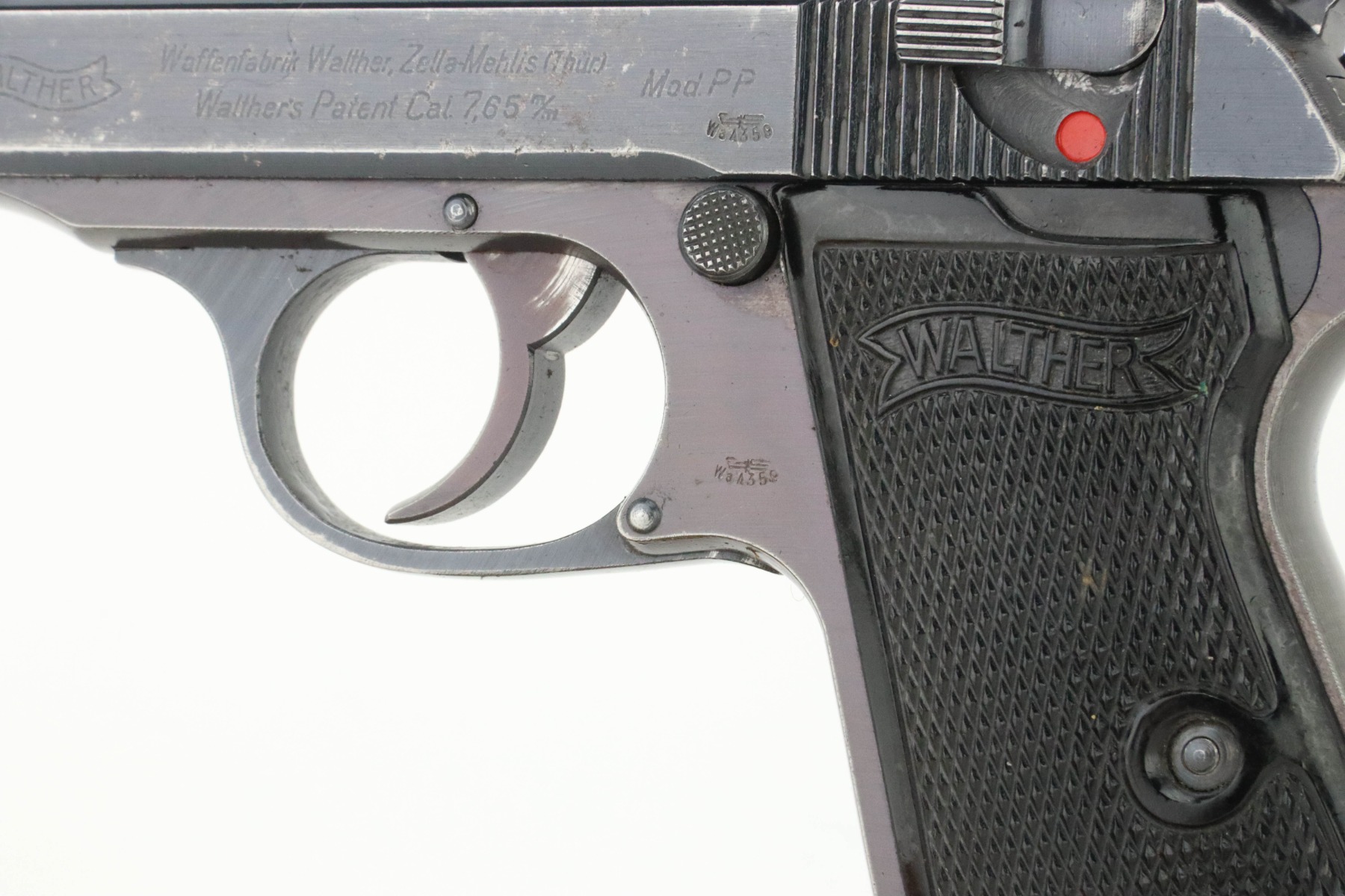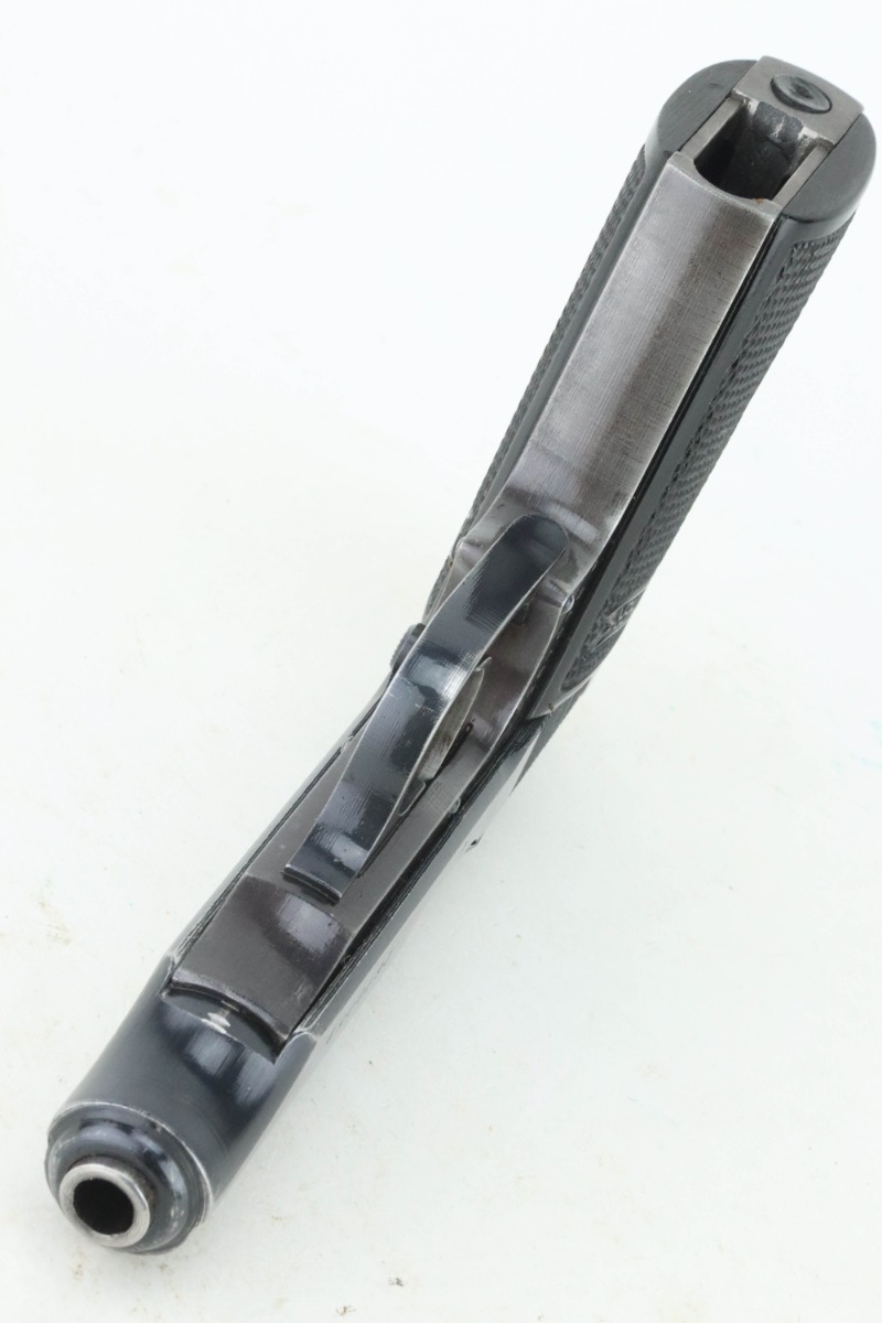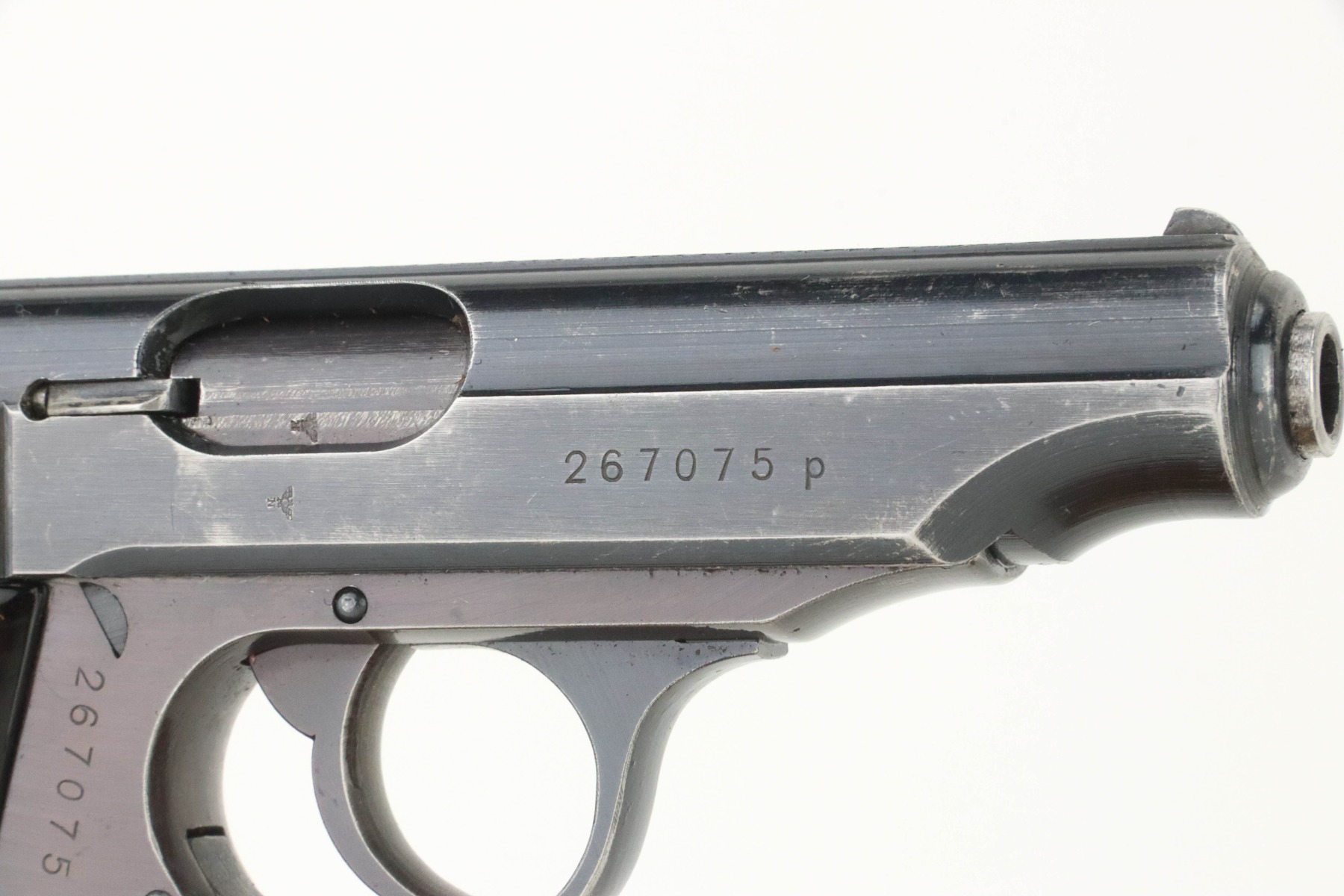 8/20/24 – This is a Walther PP issued to the Nazi military during WW2. All matching with the proper “Waffen 359” military acceptance proofs on the left side of the slide and frame. It has retained roughly 80-85% of its original finish. There is noticeable wear on the grip straps and somewhat spotty wear along both sides of the slide, concentrated mostly around the high edges. The finish on the frame has a slight plum color to it. Fitted with period-correct black bakelite grips – there is a small spot of wear on the left side that is in the shape of an “H”. Comes with a proper wartime magazine. Near-mint bore.
