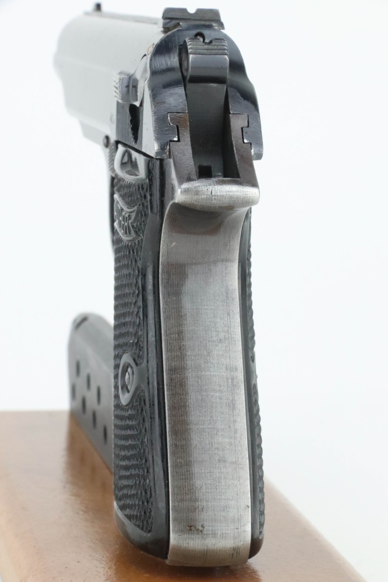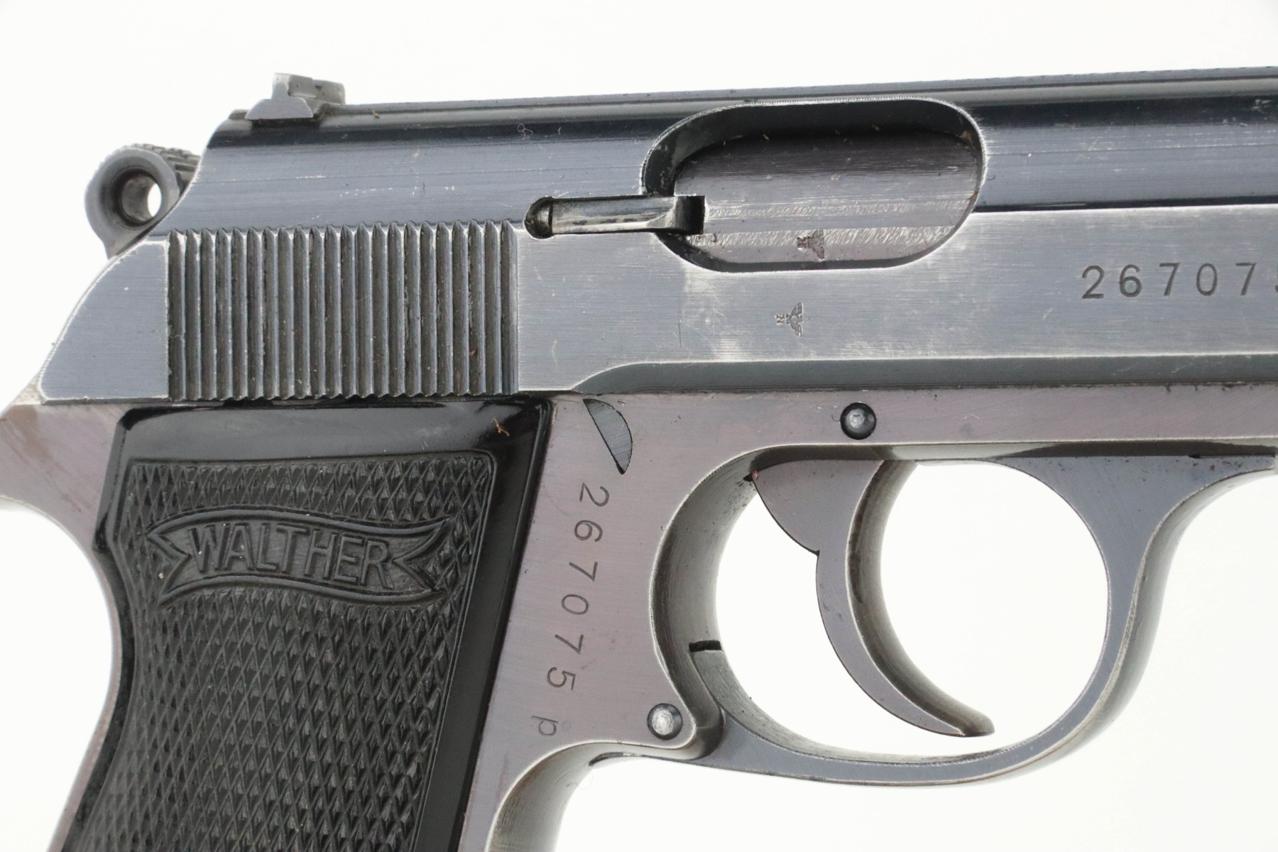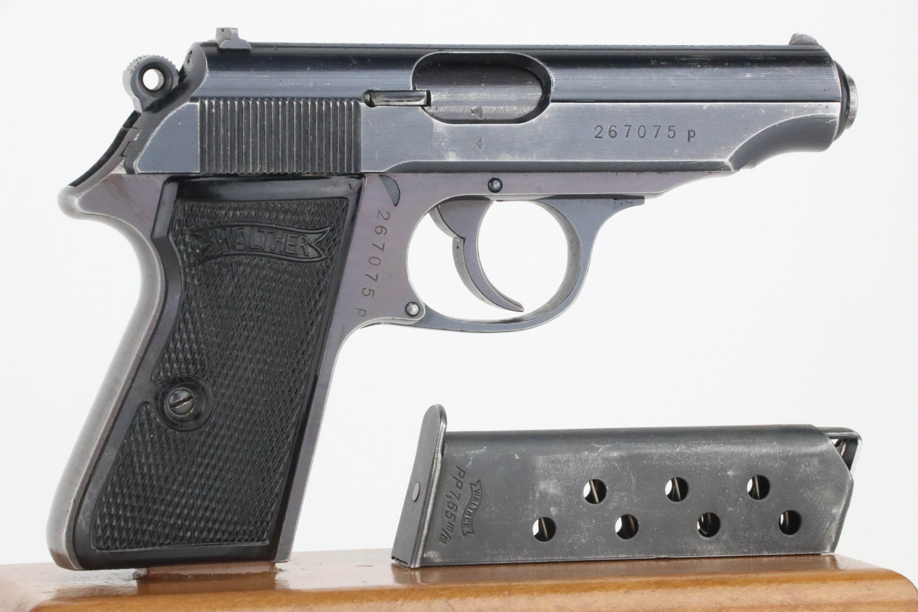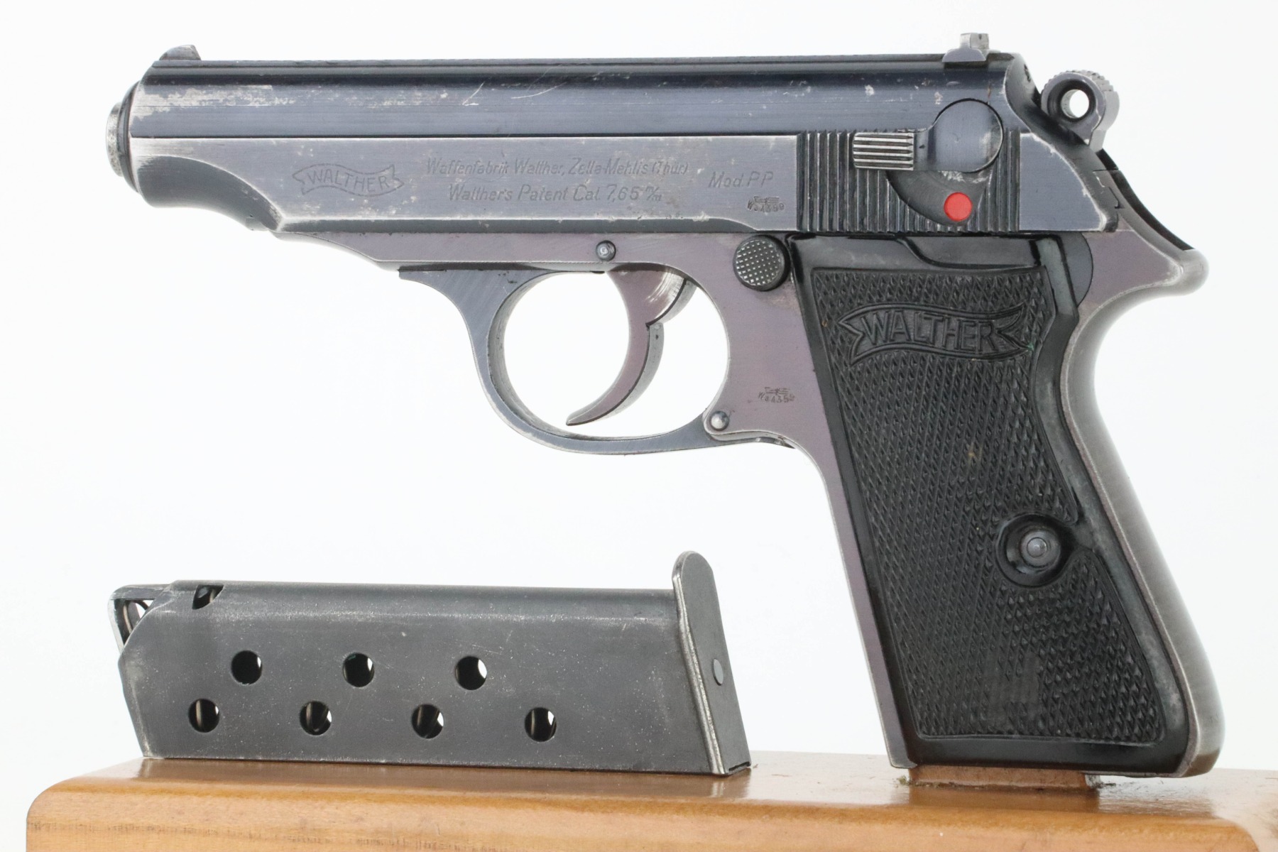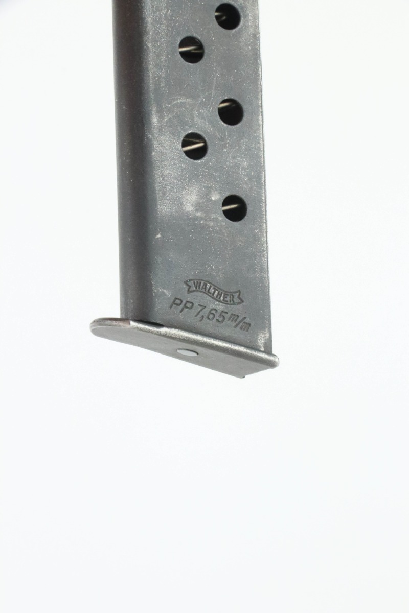 8/20/24 – This is a Walther PP issued to the Nazi military during WW2. All matching with the proper “Waffen 359” military acceptance proofs on the left side of the slide and frame. It has retained roughly 80-85% of its original finish. There is noticeable wear on the grip straps and somewhat spotty wear along both sides of the slide, concentrated mostly around the high edges. The finish on the frame has a slight plum color to it. Fitted with period-correct black bakelite grips – there is a small spot of wear on the left side that is in the shape of an “H”. Comes with a proper wartime magazine. Near-mint bore.