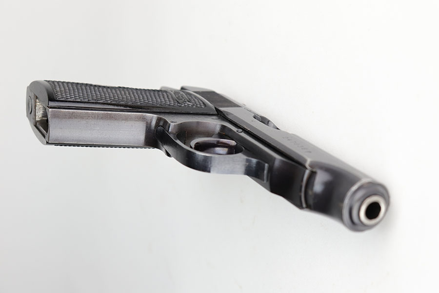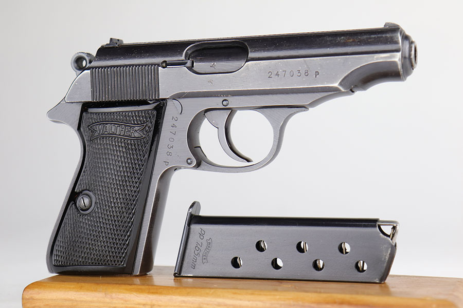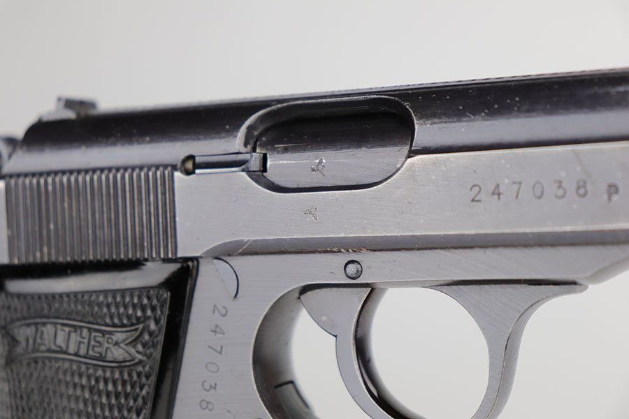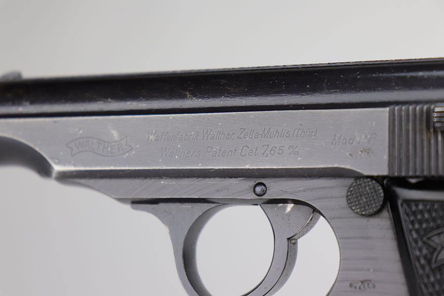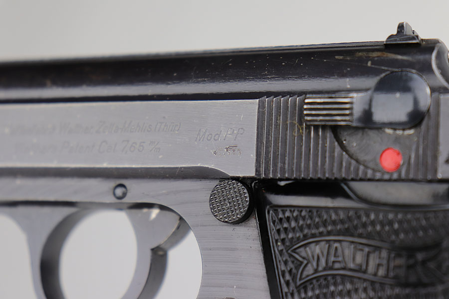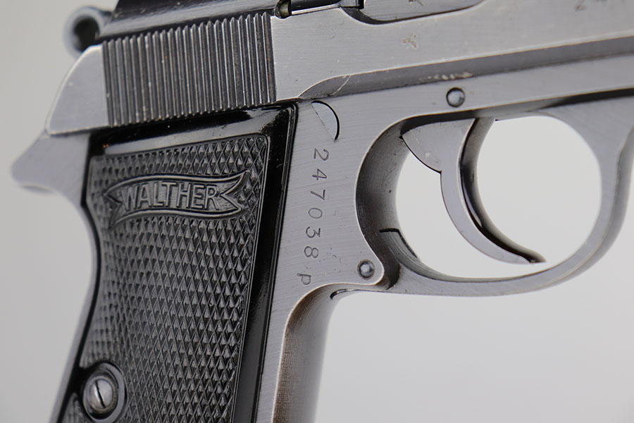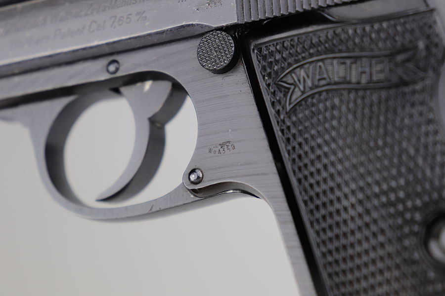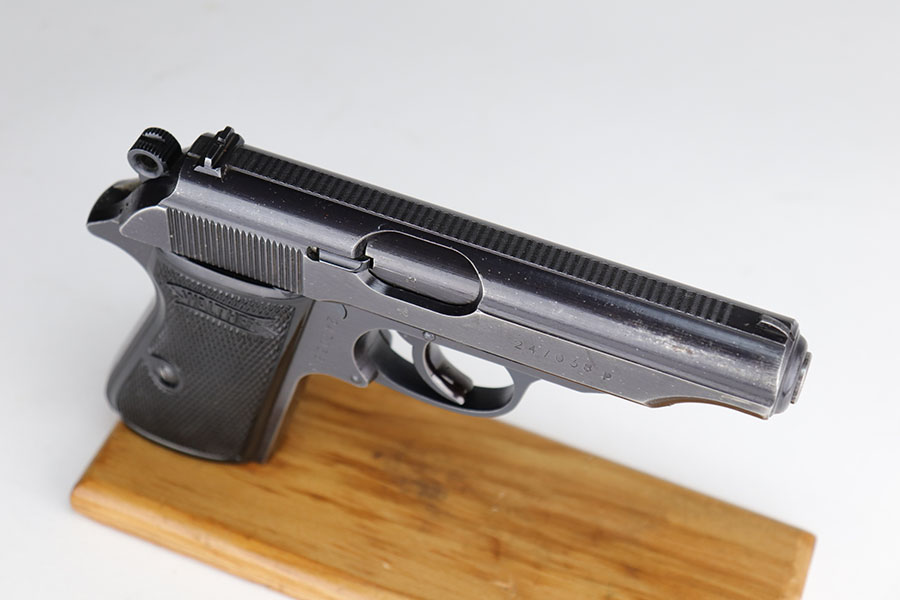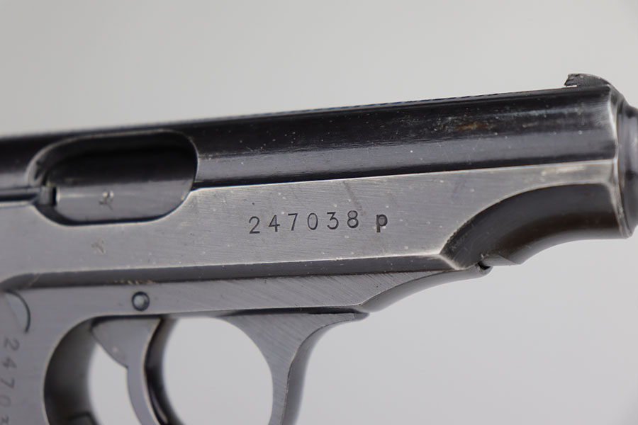 12/1/20 – This is a very nice example of a Walther PP that was issued to the Nazi military in 1942-43. It is all matching and has the proper “Waffen 359” Nazi military proofs. This one has retained somewhere between 85-90% of its original finish. There is spotty wear and freckling throughout, most noticeable on the slide. There is minor muzzle wear and minor wear on the high edges of the slide. Minor thinning on both straps. Comes with excellent Walther grips and a post-war PP magazine. The bore is excellent – shiny with strong rifling.