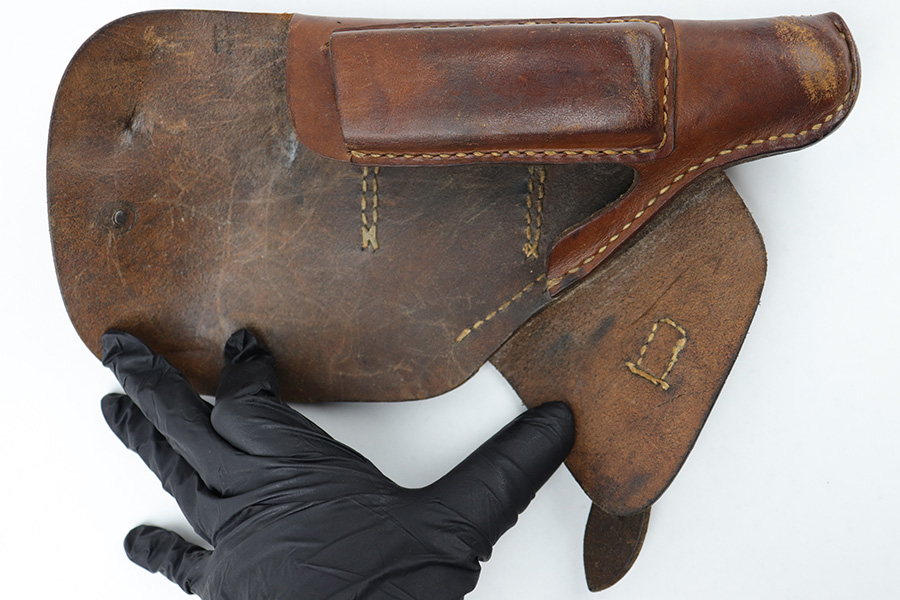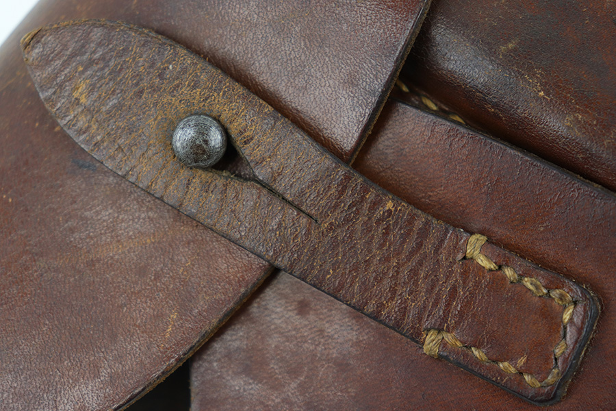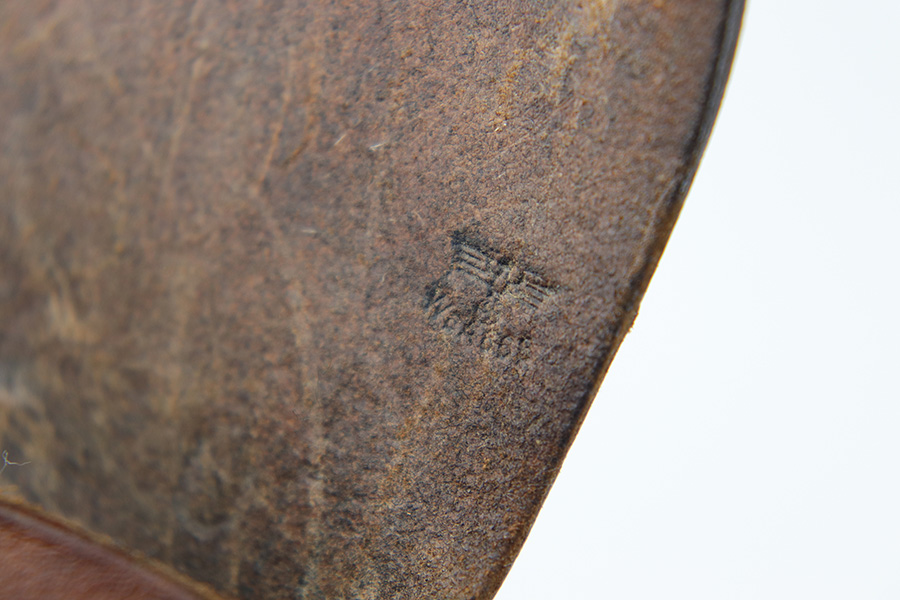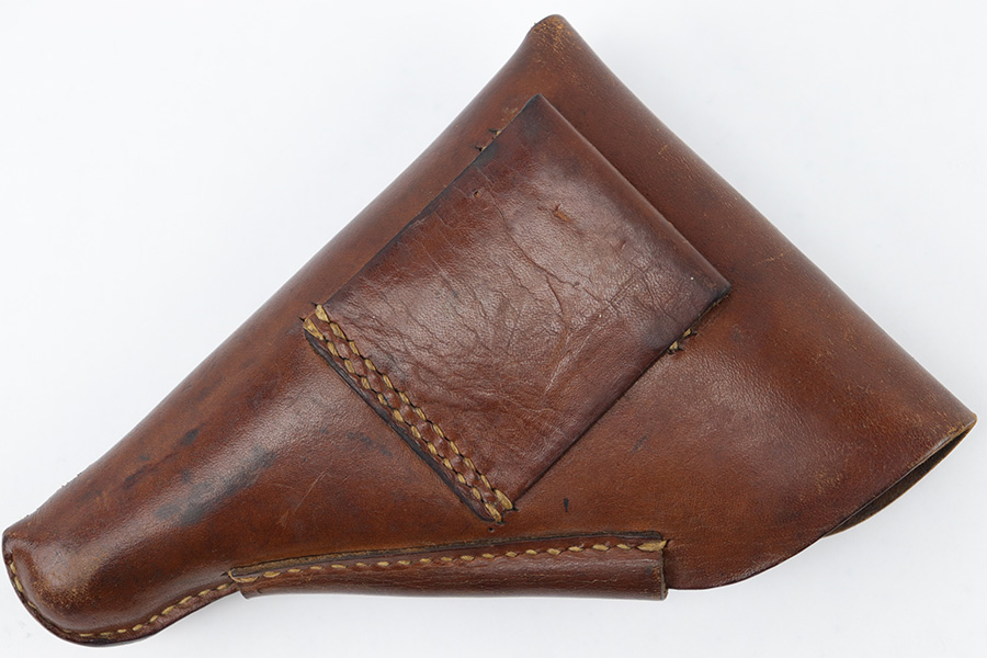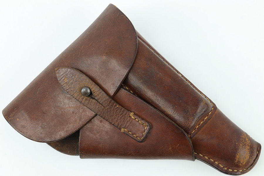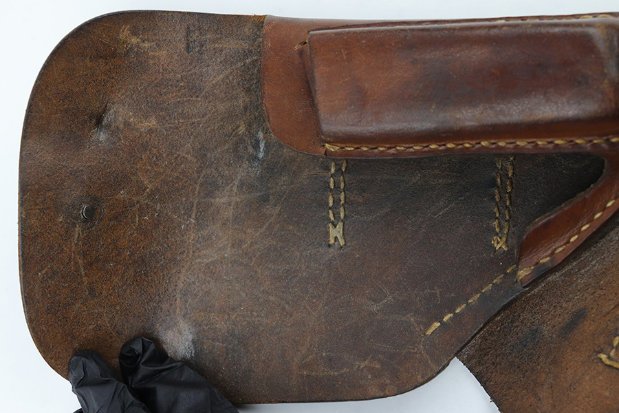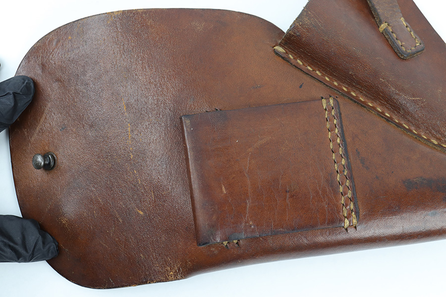 5/22/23 – This is an original WW2 production waffen proofed holster for a 7.65mm Axis pistol such as a Walther PP or similar sized pistol. The holster is in great condition with brown leather and all original stitching intact. The exterior leather has some mild surface wear and scuffing on the front toe and wrinkling along the top lid and closure strap. The interior leather has a waffen WaA668 military proof stamp, and there are no other markings. This waffen proof corresponds to “jhz” maker Jean Weipert around 1941-42. The stitching is all original and in great condition.