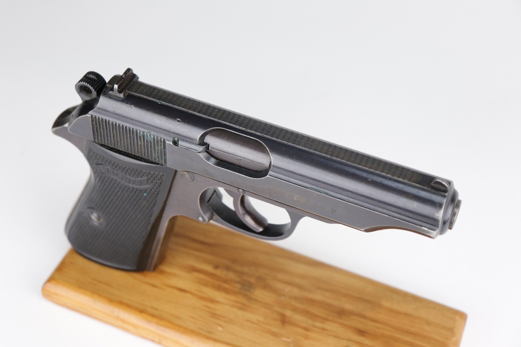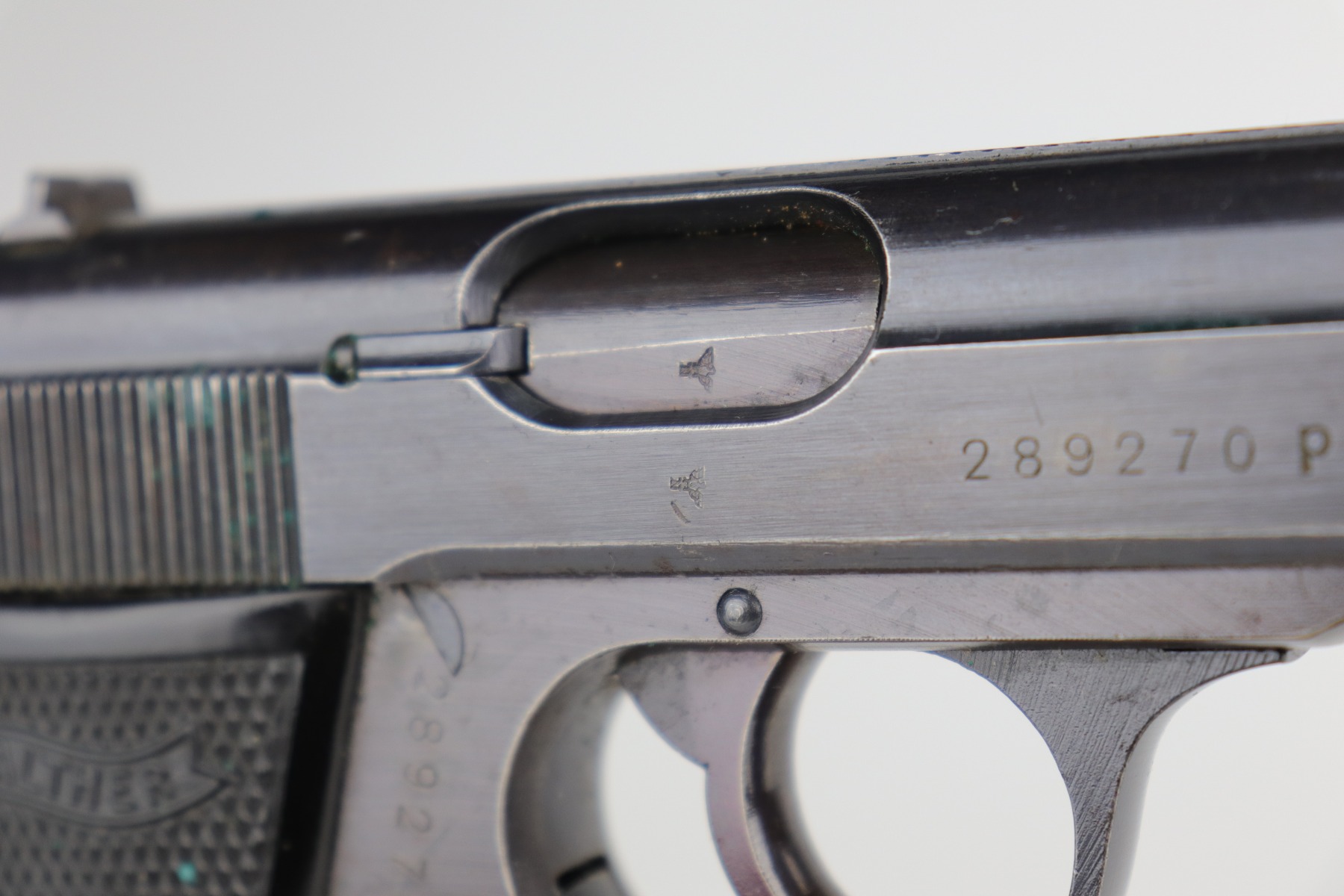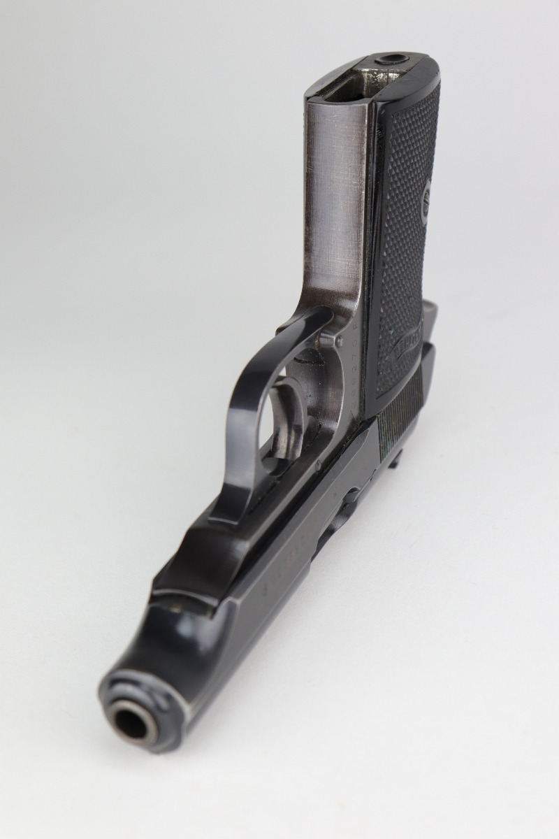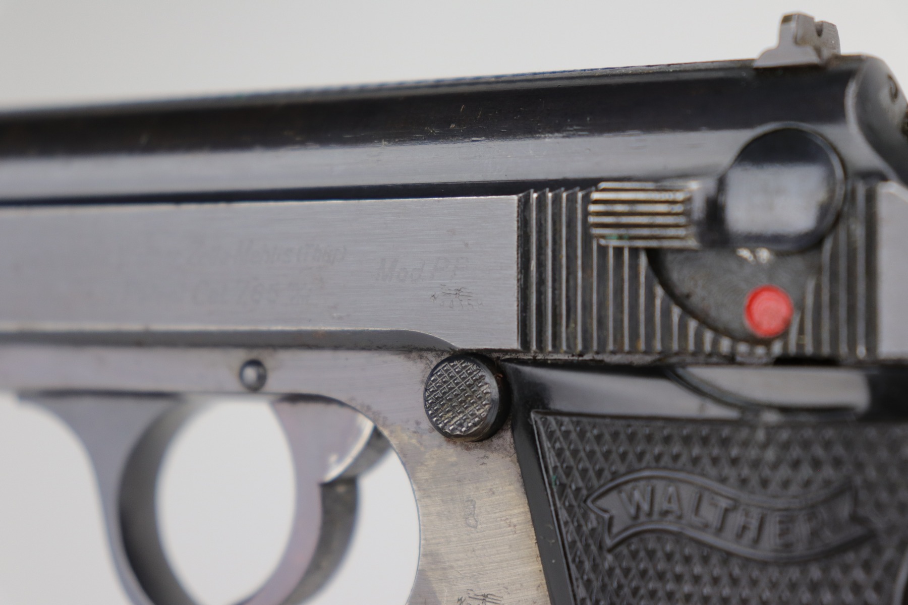 12/15/20 – This is a very nice example of a Walther PP issued to the Nazi military in about 1942. The gun is all matching and has the proper “Waffen 359” Nazi military acceptance proofs. It has retained roughly 85% of its bluing. There is significant wear on the straps and one noticeable area of discoloration on the left side of the frame. Minor muzzle wear and spotty oxidation throughout. It comes with excellent period-correct grips and one post-war finger extension magazine. The bore is mint.