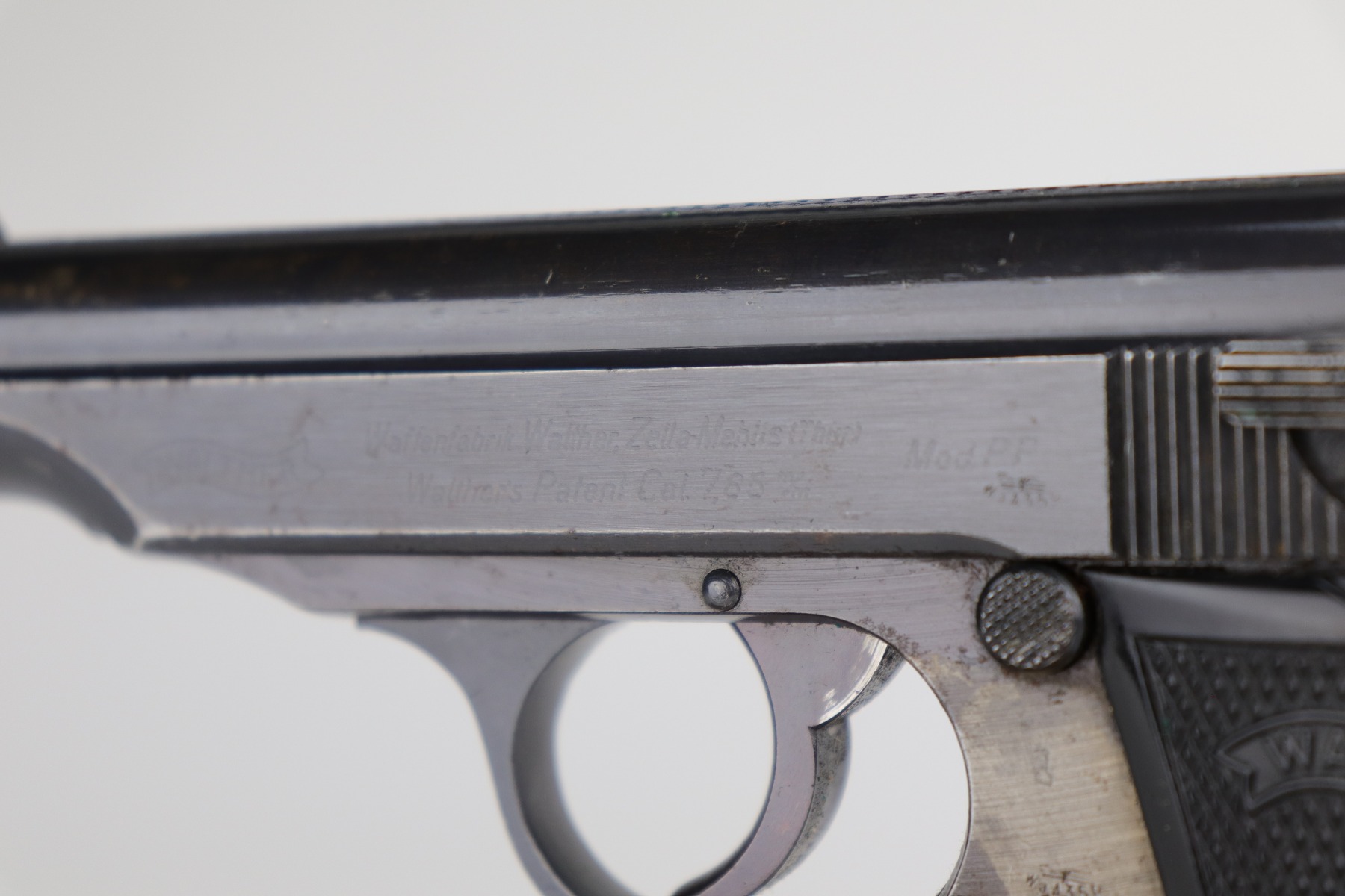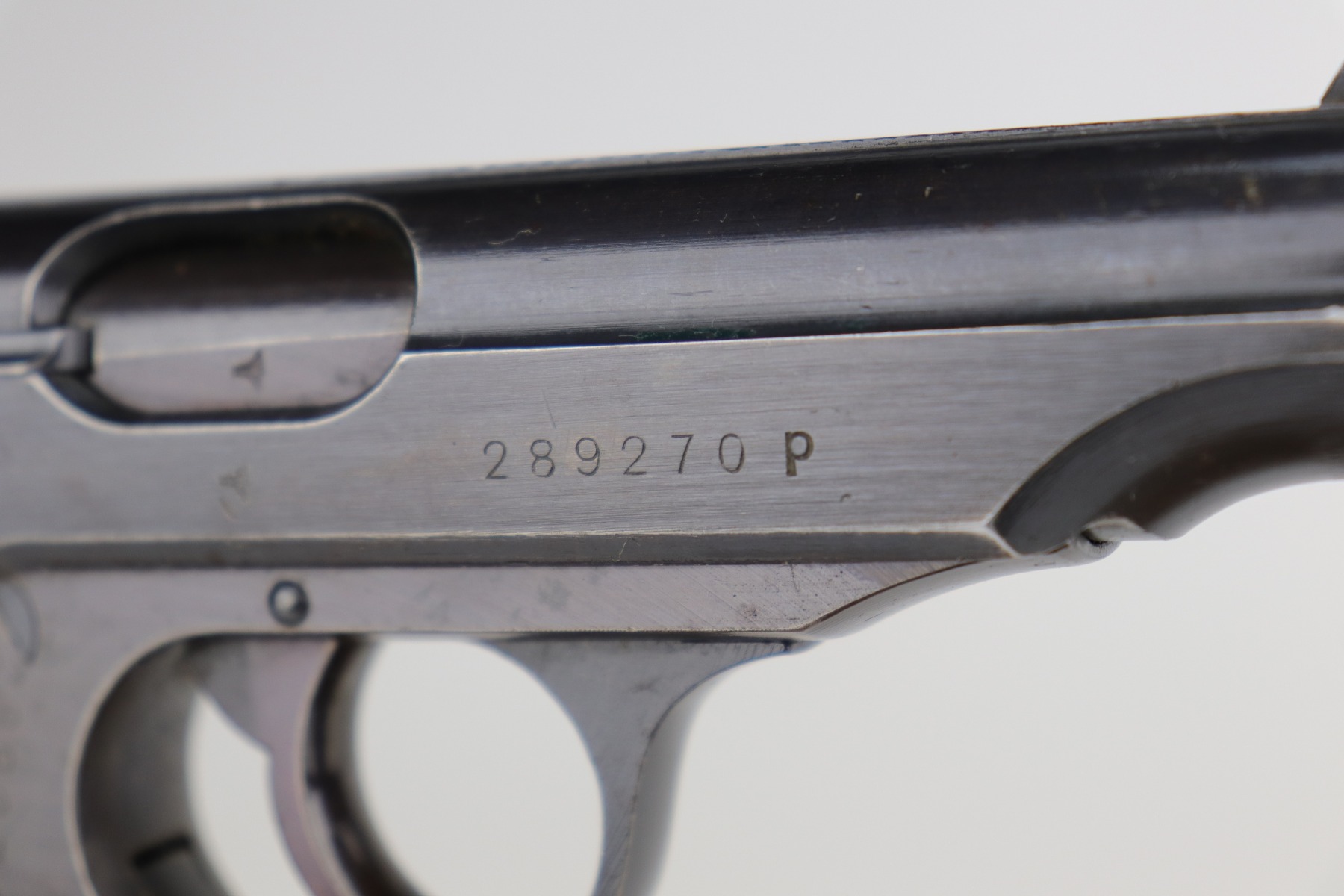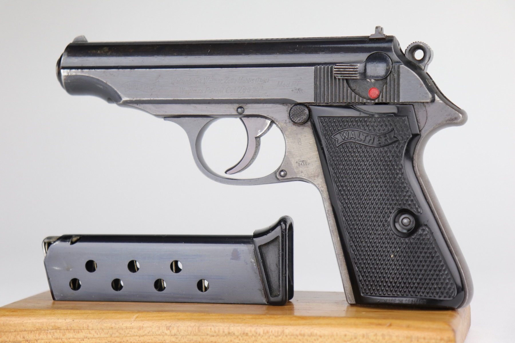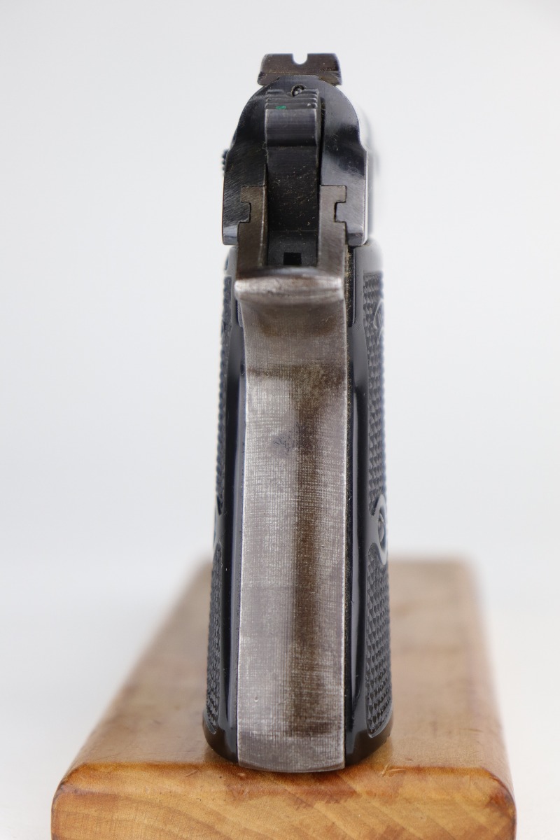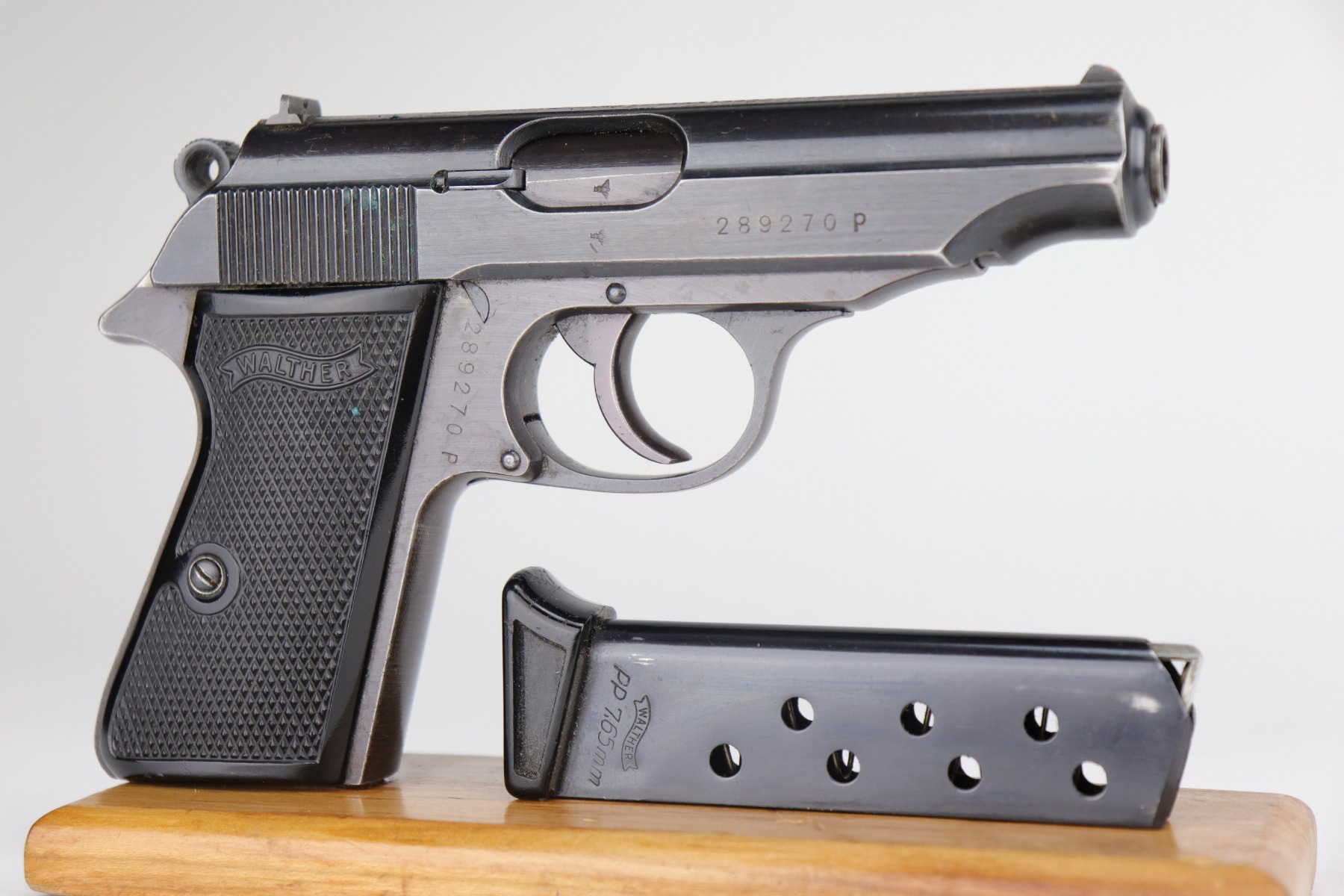 12/15/20 – This is a very nice example of a Walther PP issued to the Nazi military in about 1942. The gun is all matching and has the proper “Waffen 359” Nazi military acceptance proofs. It has retained roughly 85% of its bluing. There is significant wear on the straps and one noticeable area of discoloration on the left side of the frame. Minor muzzle wear and spotty oxidation throughout. It comes with excellent period-correct grips and one post-war finger extension magazine. The bore is mint.