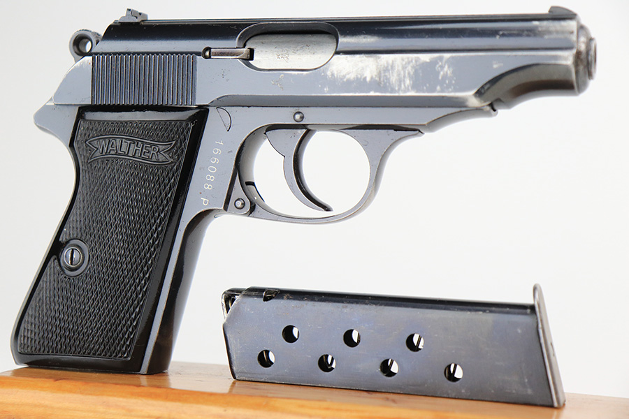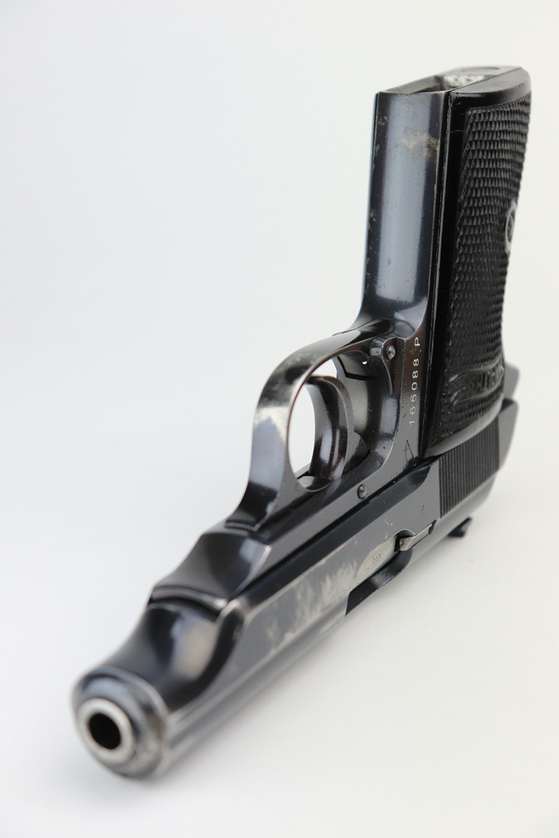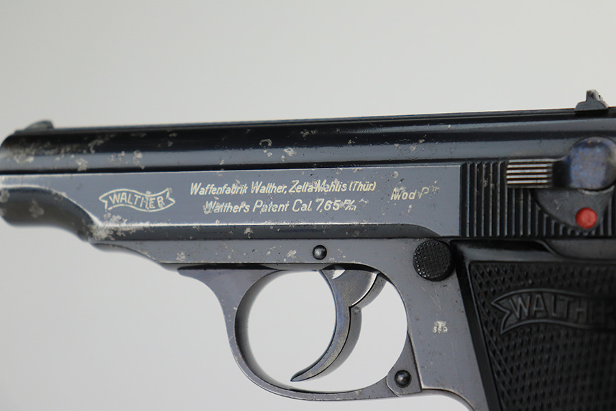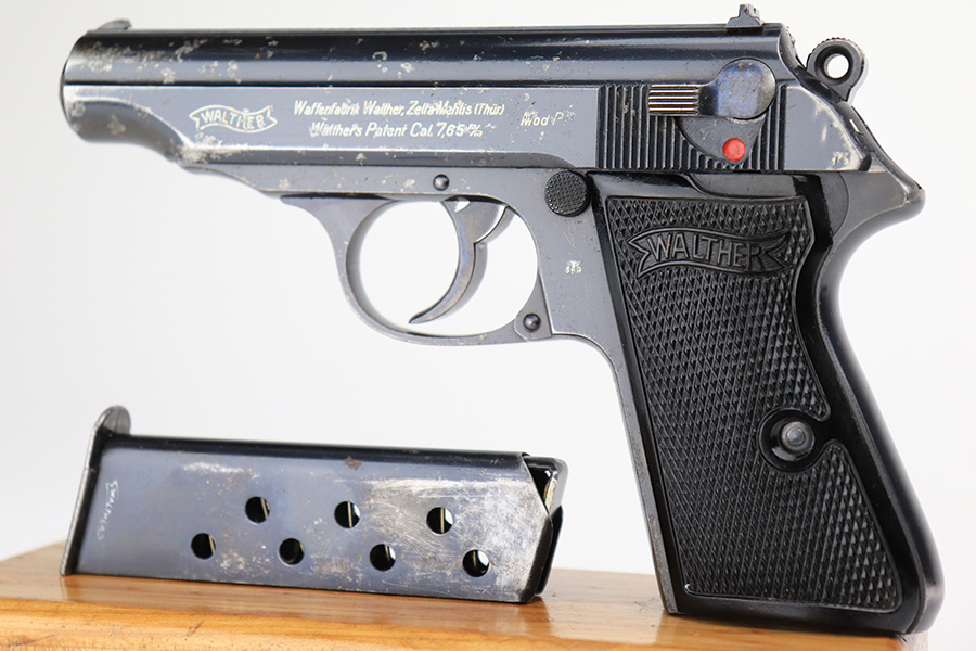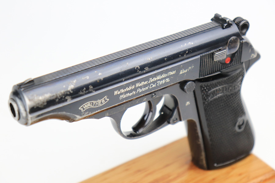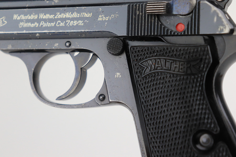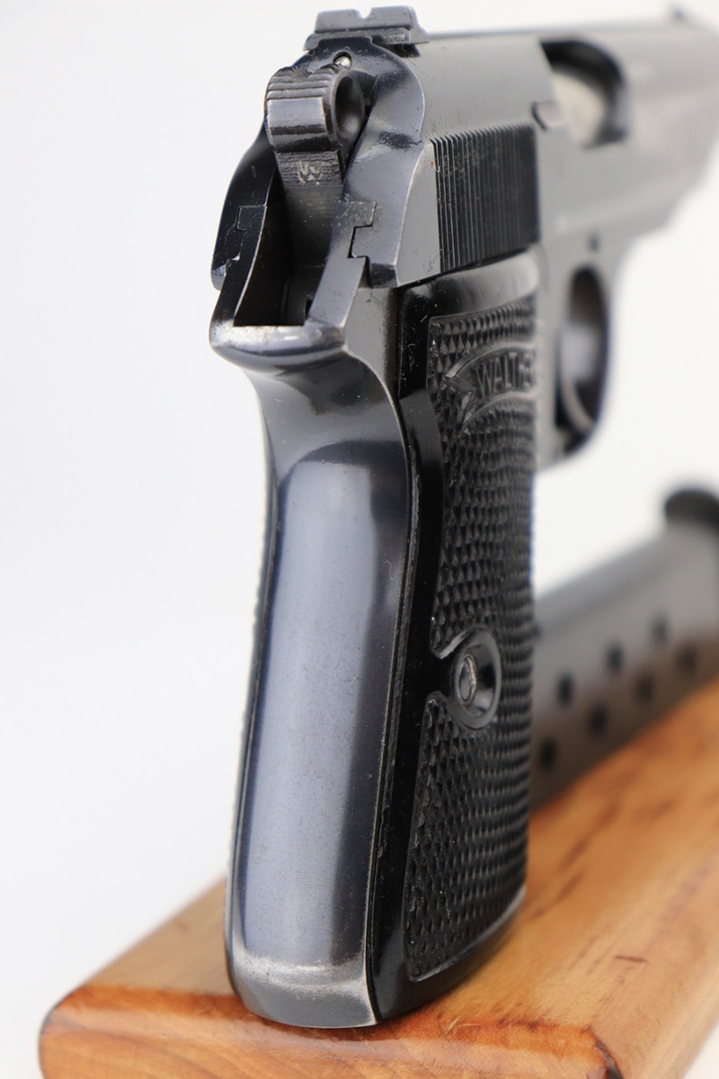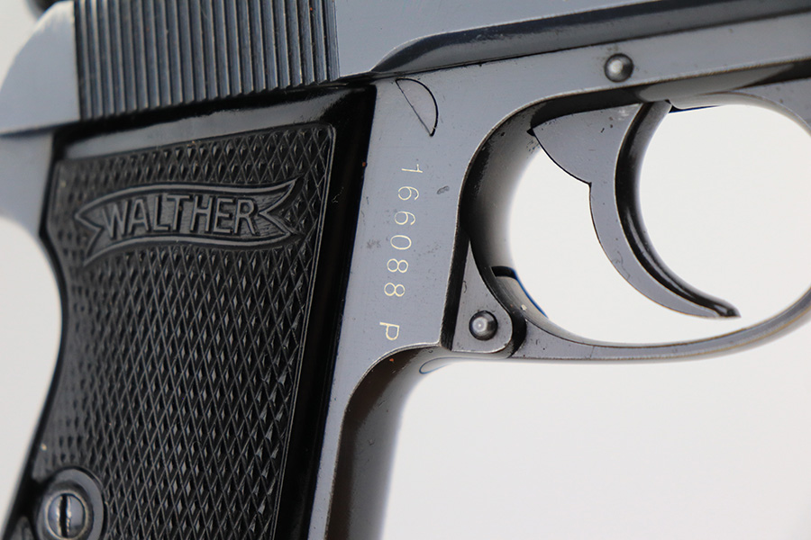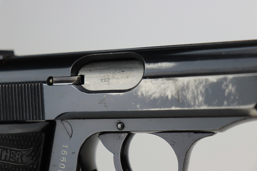 5/16/22 – This is a nice example of an early first-variation Walther PP issued to the Nazi military in 1940. The gun is all matching and has the proper “Eagle N” proofs. As a first-variation, this one also has the proper “Eagle 359” military acceptance proofs on the frame and on the left side of the slide near the tang. The gun has retained somewhere between 85-90% of its original high polish bluing. The most noticeable sign of wear is splotchy discoloration on both sides of the slide, on the left side of the frame, and a little on the front strap. There is also muzzle wear and an area of noticeable wear on the right side of the slide. Minor wear around the tang and the base of the back strap. Comes with excellent period-correct black bakelite grips and a proper Walther banner-only magazine. Minty bore.