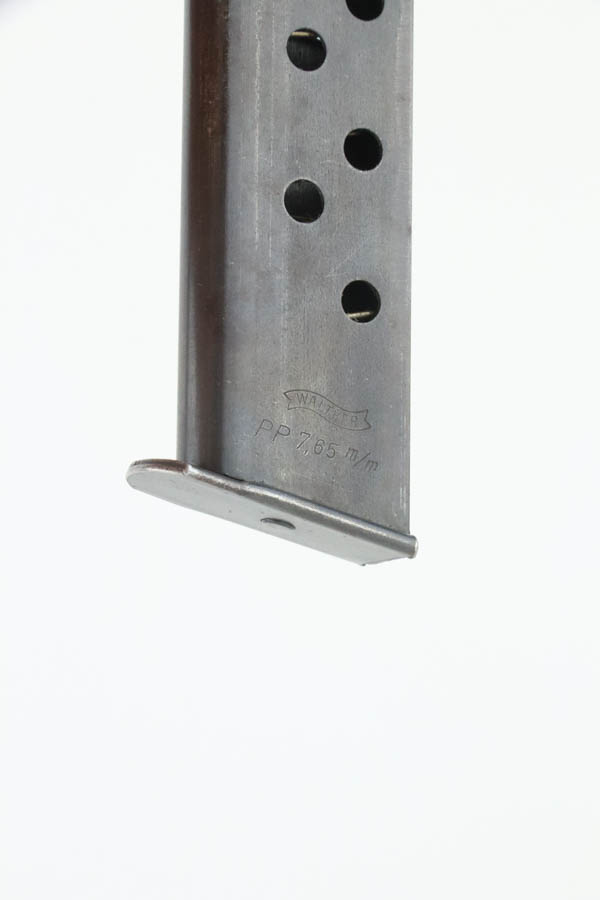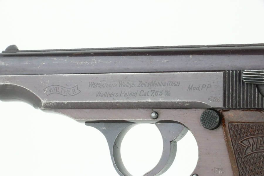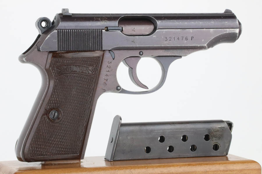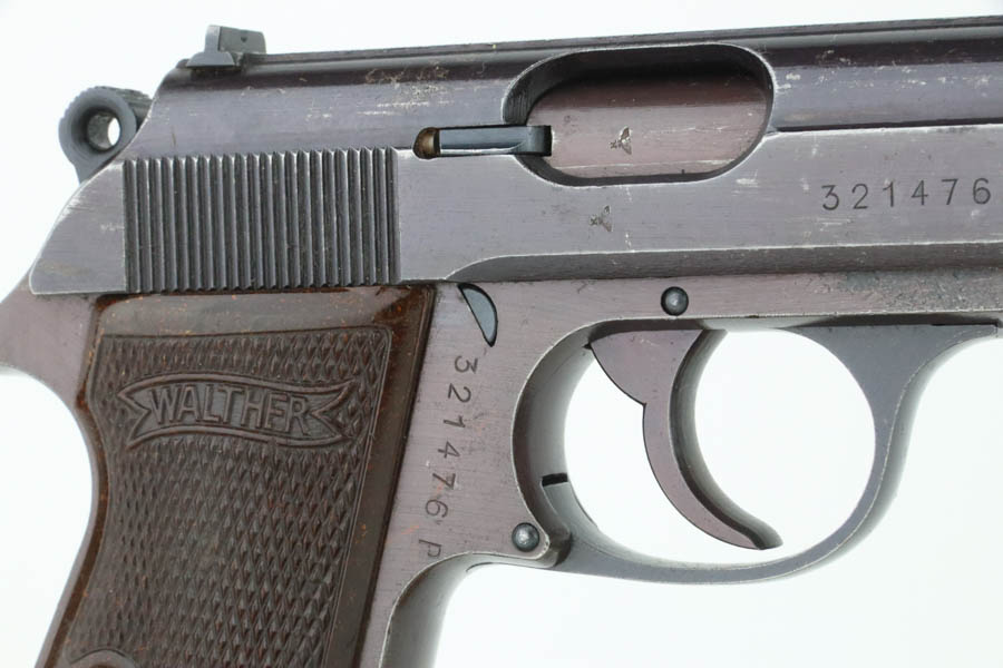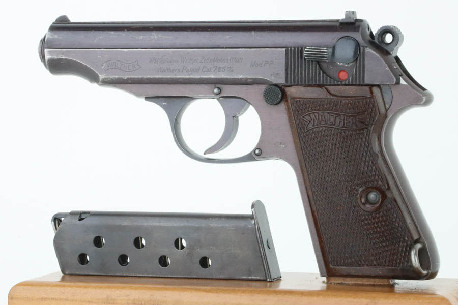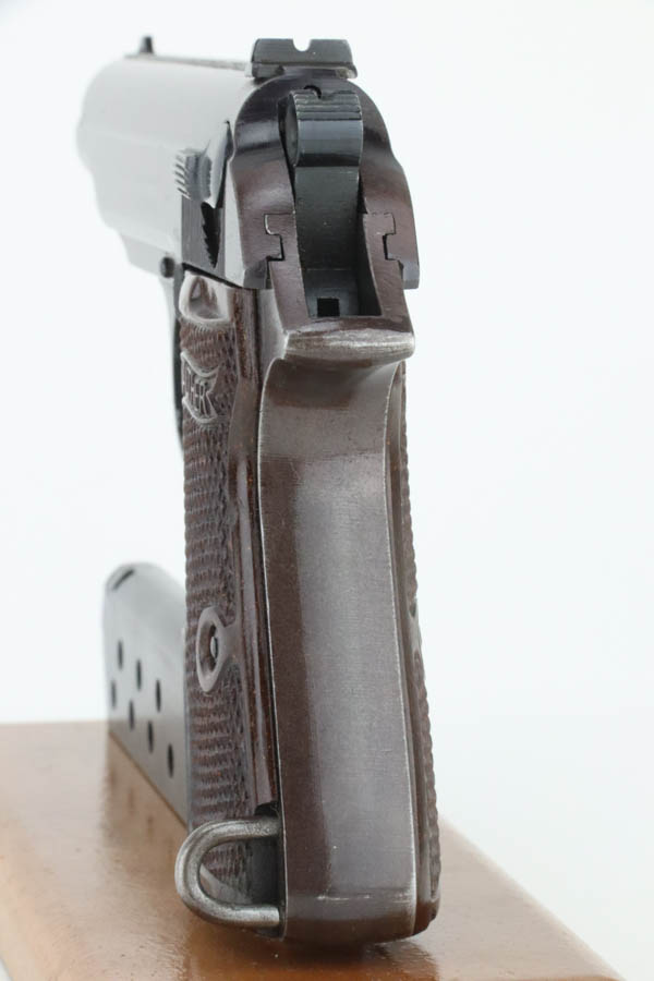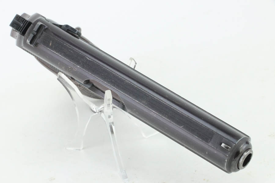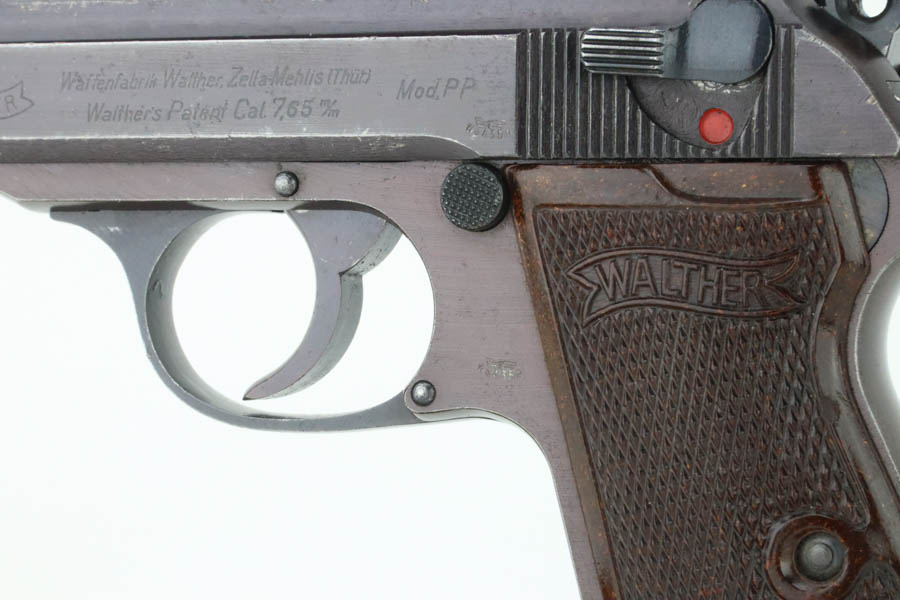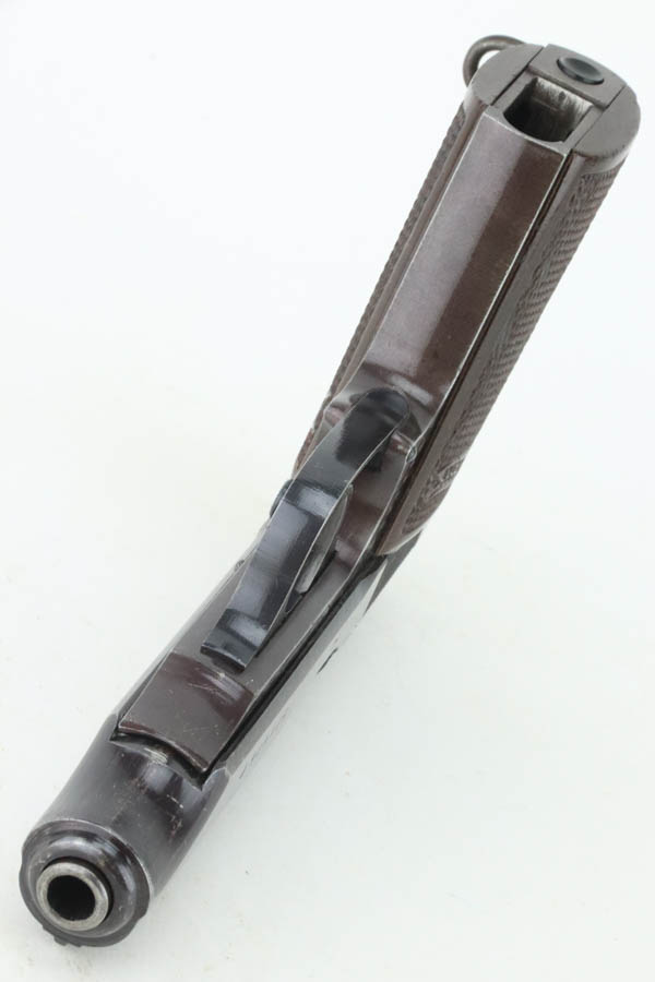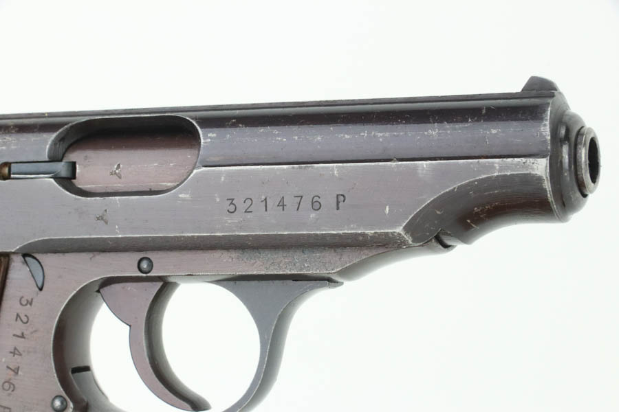 8/8/24 – This is a very nice example of a Walther PP issued to the Nazi military in 1943. All matching with the proper “Waffen 359” military acceptance proofs on the slide and frame. The entire gun has a really nice plum-colored finish that is complemented nicely with a set of scarce reddish bakelite grips. The bluing rates about 95% with minor muzzle wear and some tiny surface scratches and marks along the slide. Comes with a period-correct wartime magazine. Minty bore. There is a post-WW2 French police lanyard ring installed around the butt of the frame.