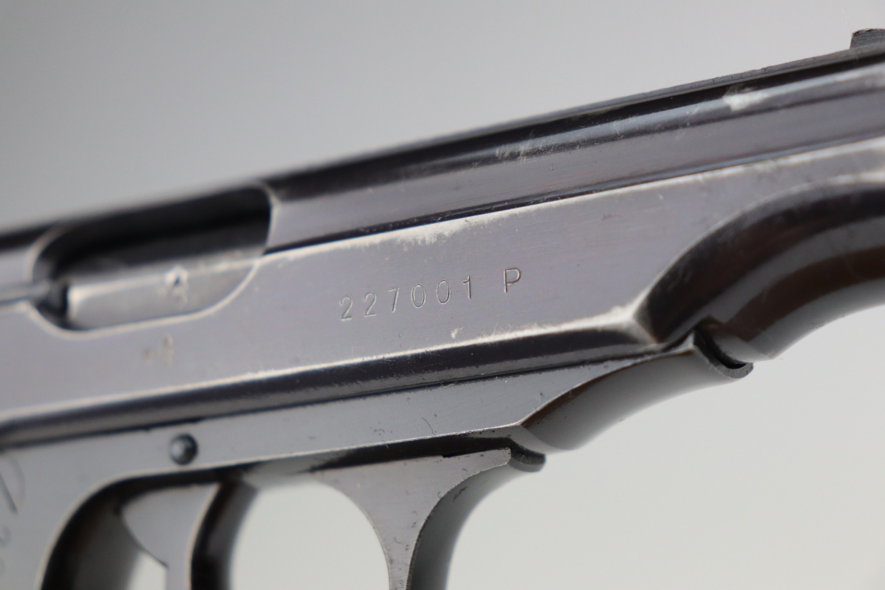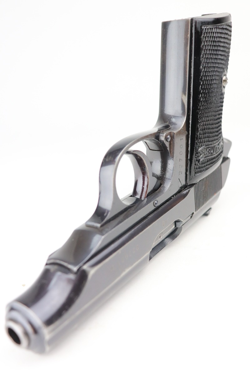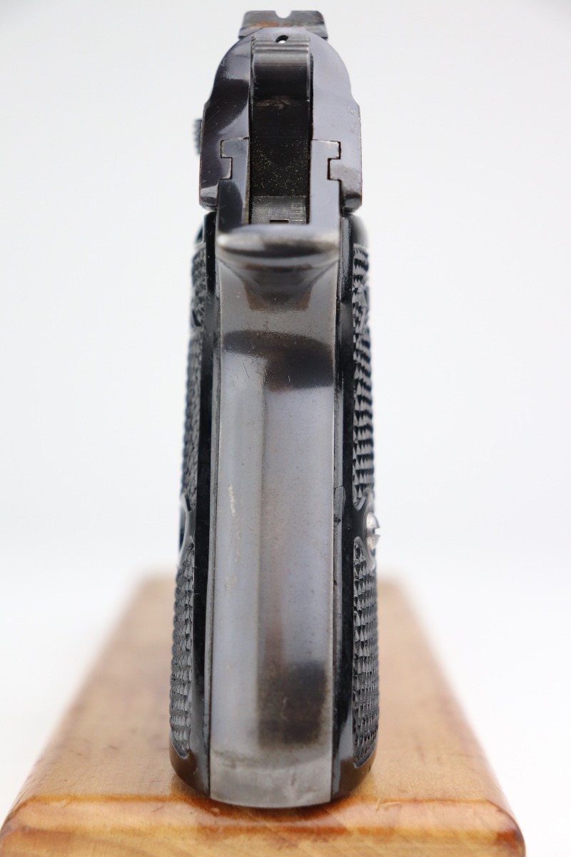 2/5/21 – This is a very nice example of a Walther PPK that was issued to the Nazi military in 1938. Given the “Waffen 359” proofs, the high polish finish, and the approximate serial range of this gun, it could be part of the Luftwaffe contract. Can’t say for sure. It is all matching and has retained about 90% of its original bluing. There is spotty wear on the slide near the muzzle, on the high edges, and a few spots on the straps. There is some light spotty oxidation most visible on the left side of the gun and back strap. Comes with excellent grips and a wartime magazine. The bore is mint.