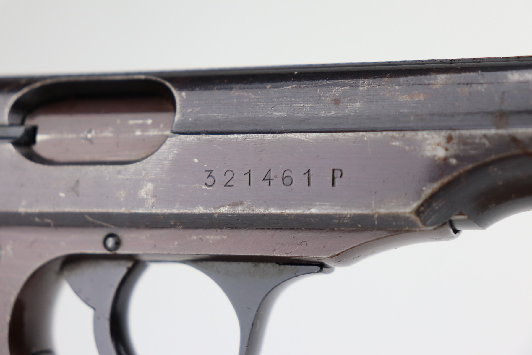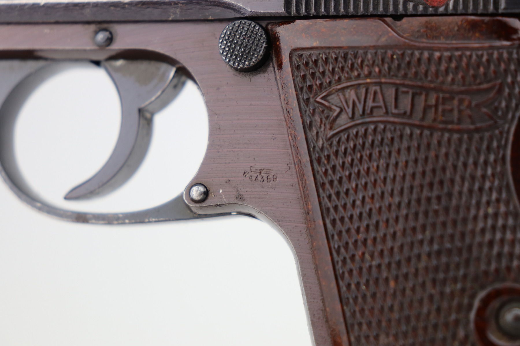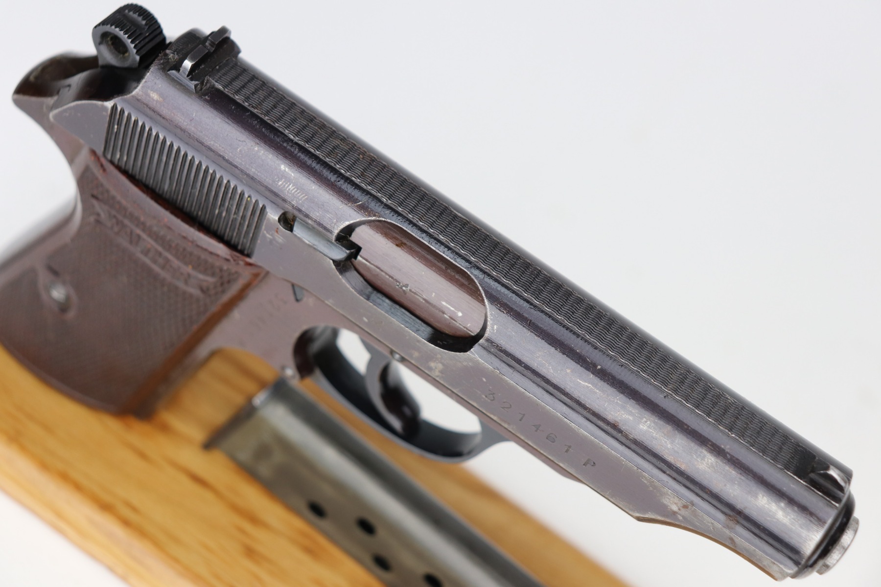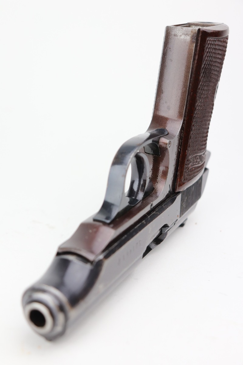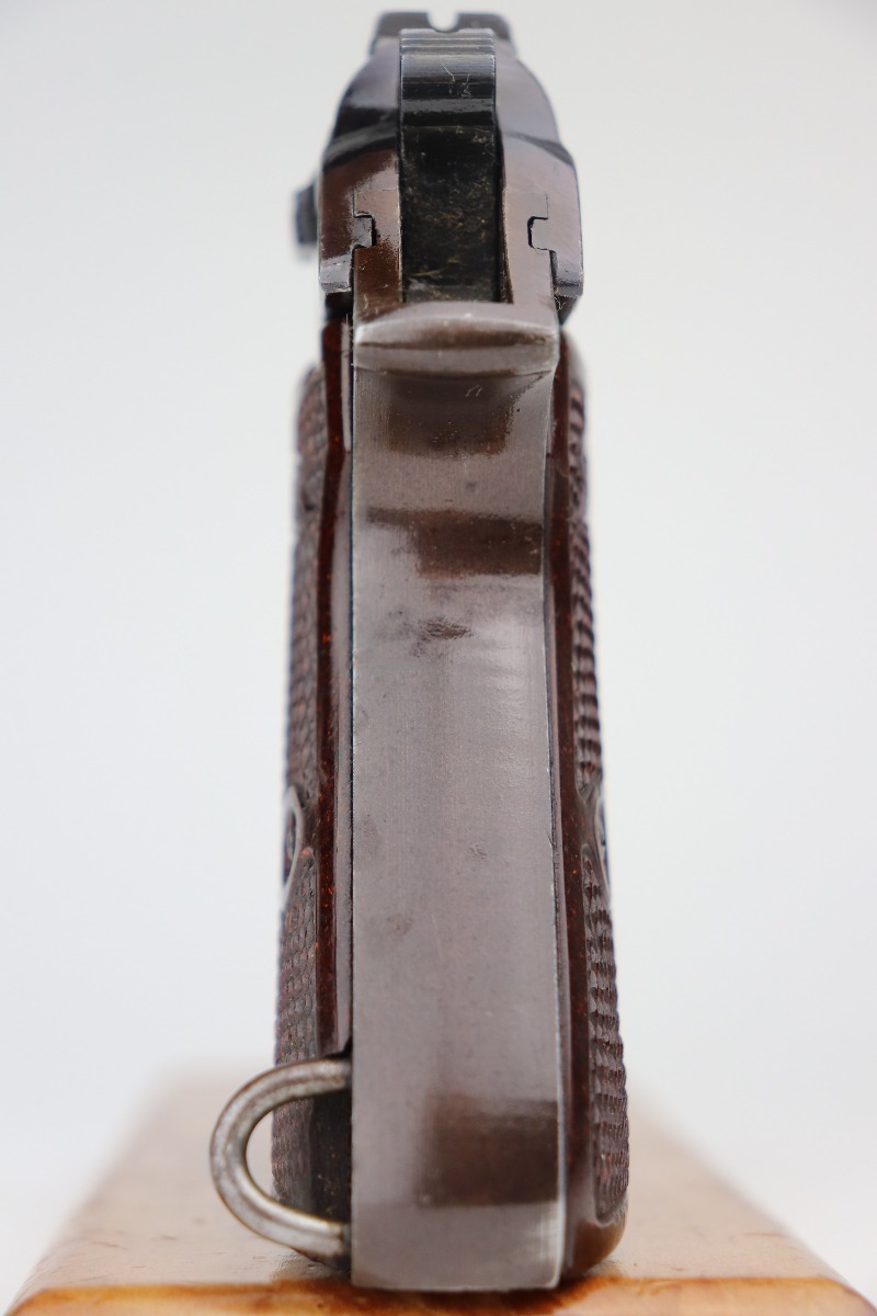 3/11/21 – This is a very nice example of a Walther PP issued to the Nazi military in 1944. It is all matching and has the proper “Waffen 359” military proofs. This one has a beautiful plumb color to its finish. There is a lanyard loop that was added by the French after the war. It was likely issued to the French police. It has retained about 92% of its original finish. There is high edge wear in general and spotty wear on both sides and top of the slide. One spot of wear at the base of the front strap. Spotty oxidation on the straps and near the muzzle. The gun comes with rare red Walther grips and a wartime magazine. The bore is excellent with strong rifling. There is a series of numbers scratched into the right side of the frame under the grip panel.