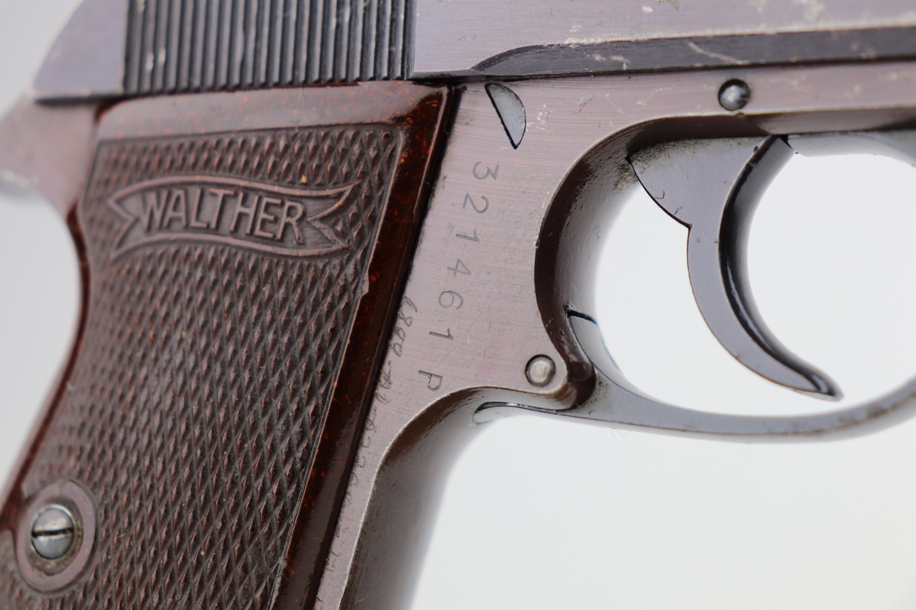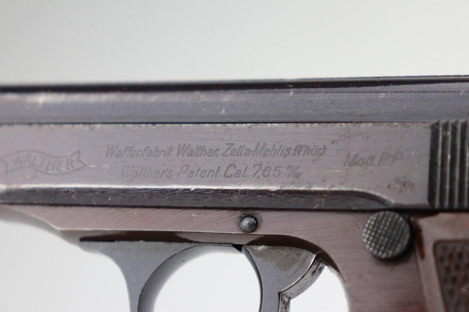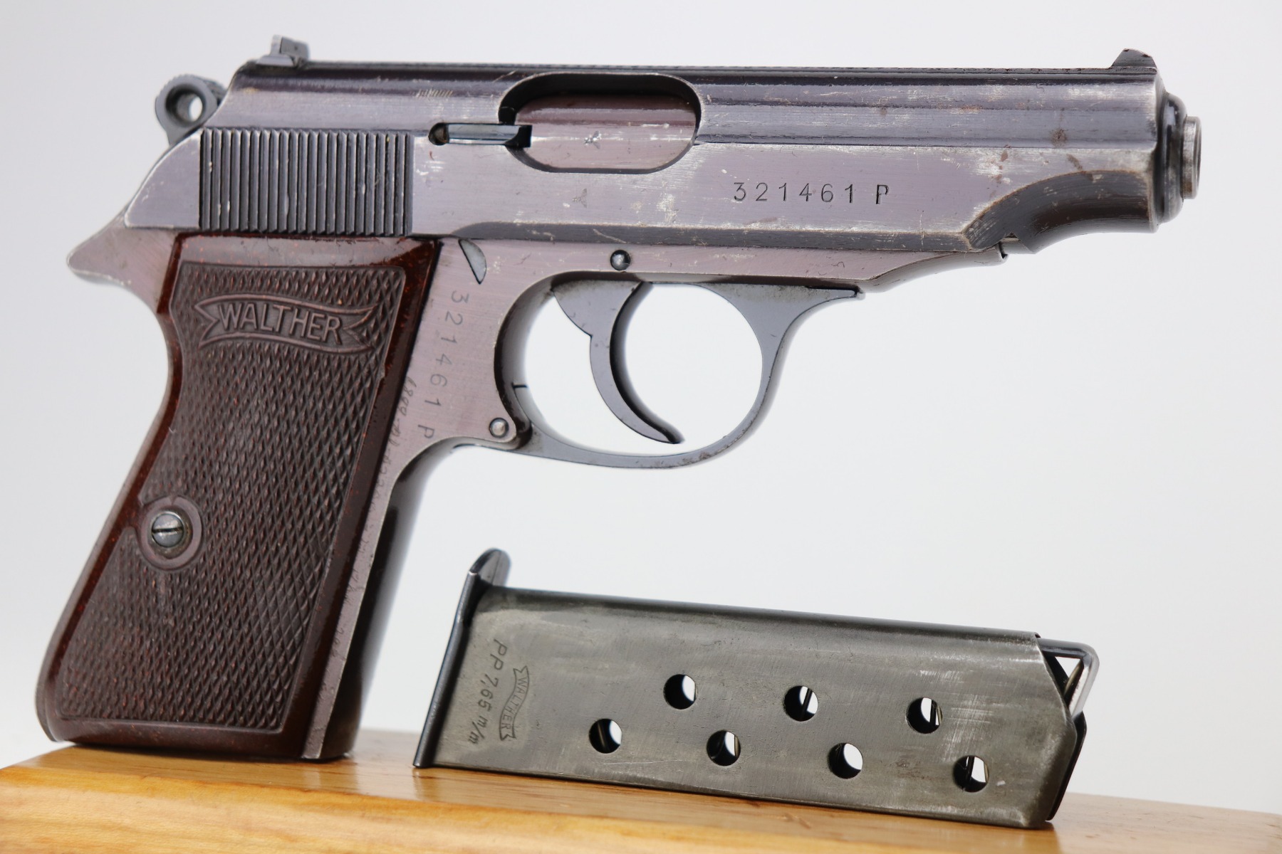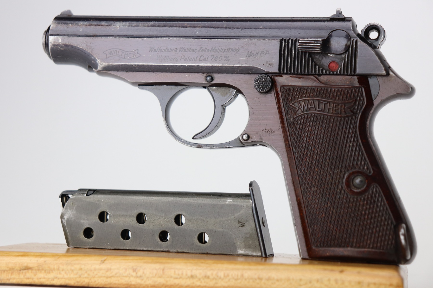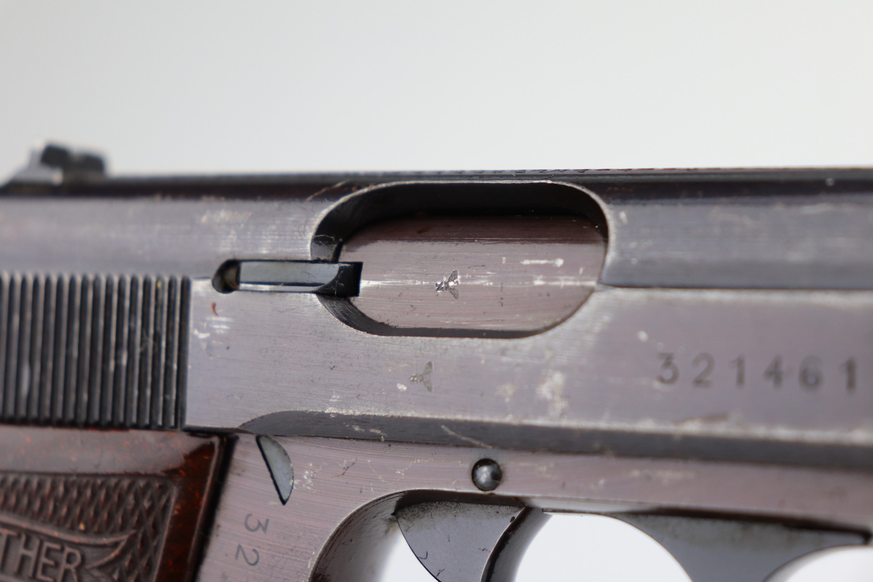 3/11/21 – This is a very nice example of a Walther PP issued to the Nazi military in 1944. It is all matching and has the proper “Waffen 359” military proofs. This one has a beautiful plumb color to its finish. There is a lanyard loop that was added by the French after the war. It was likely issued to the French police. It has retained about 92% of its original finish. There is high edge wear in general and spotty wear on both sides and top of the slide. One spot of wear at the base of the front strap. Spotty oxidation on the straps and near the muzzle. The gun comes with rare red Walther grips and a wartime magazine. The bore is excellent with strong rifling. There is a series of numbers scratched into the right side of the frame under the grip panel.