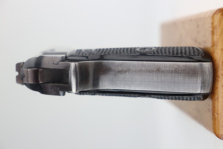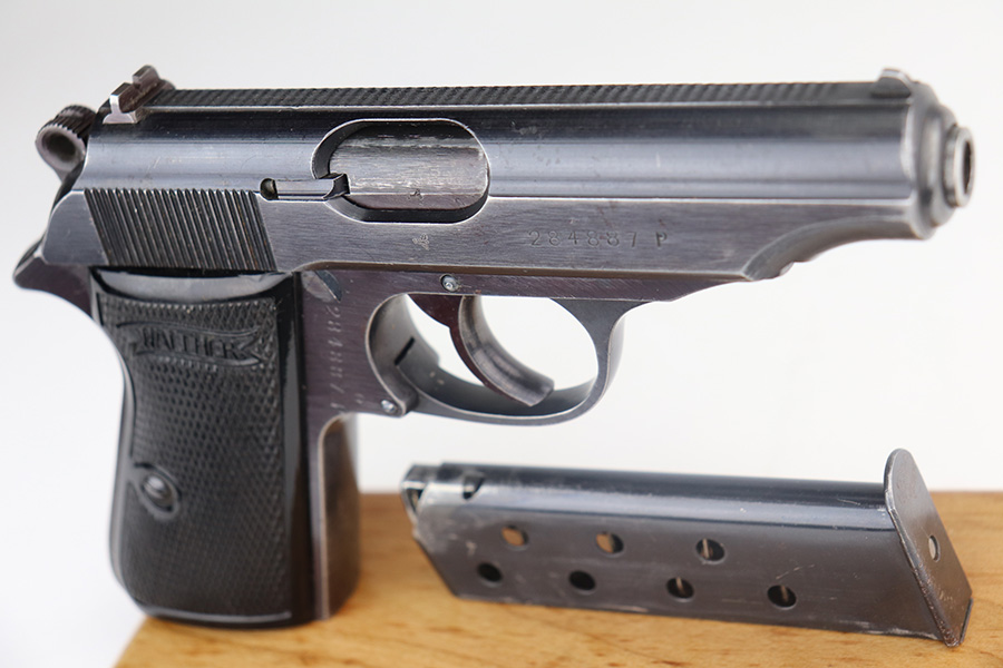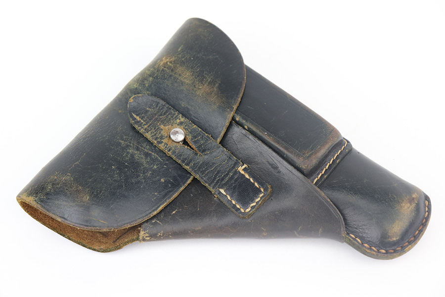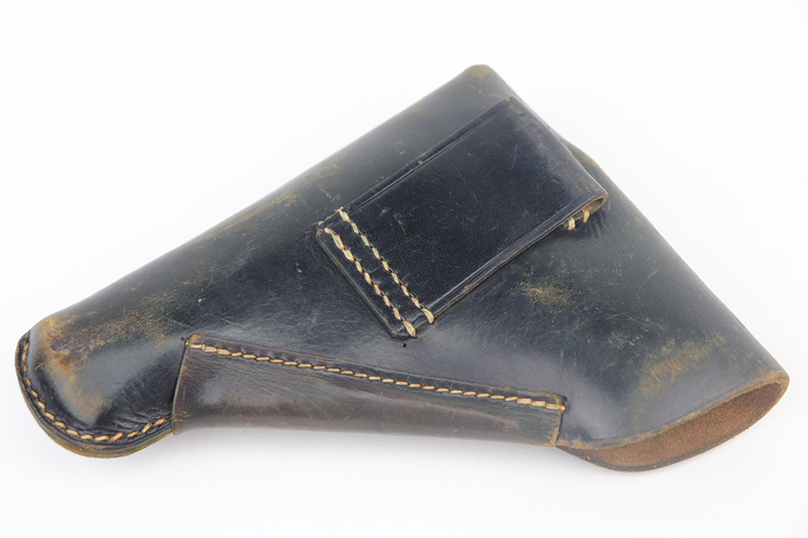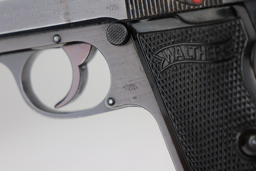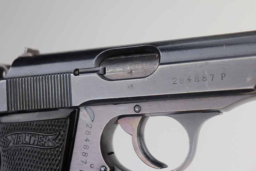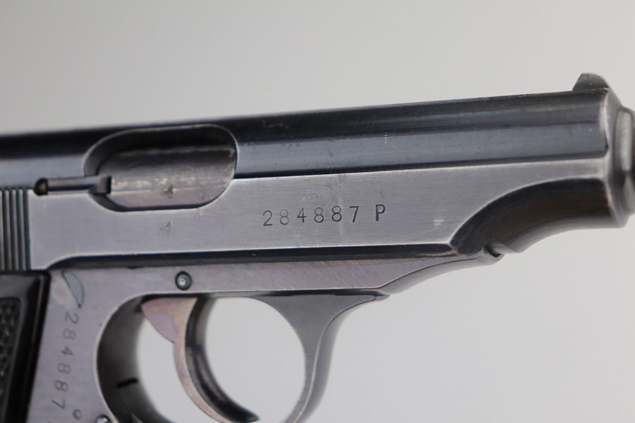 5/17/21 – This is a nice example of a Walther PP issued to the Nazi military in 1942. The gun is matching and has the proper “Waffen 359” military proofs. It comes with a nice 1944-dated waffen-proofed holster and a Walther banner-only magazine. The gun has retained about 80-85% of its original bluing. There is thinning and tiny dots of oxidation on the straps and minor muzzle wear from the holster. There is some spotty wear and a few dings on the left side of the slide. Comes with excellent grips. The bore is shiny with strong rifling with minor frosting in the grooves.