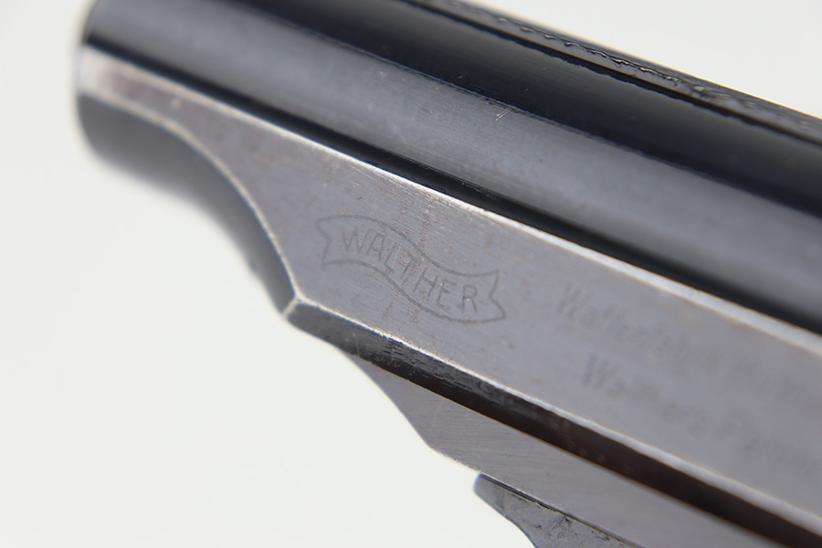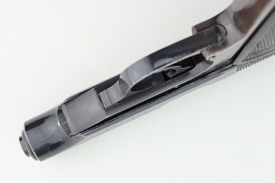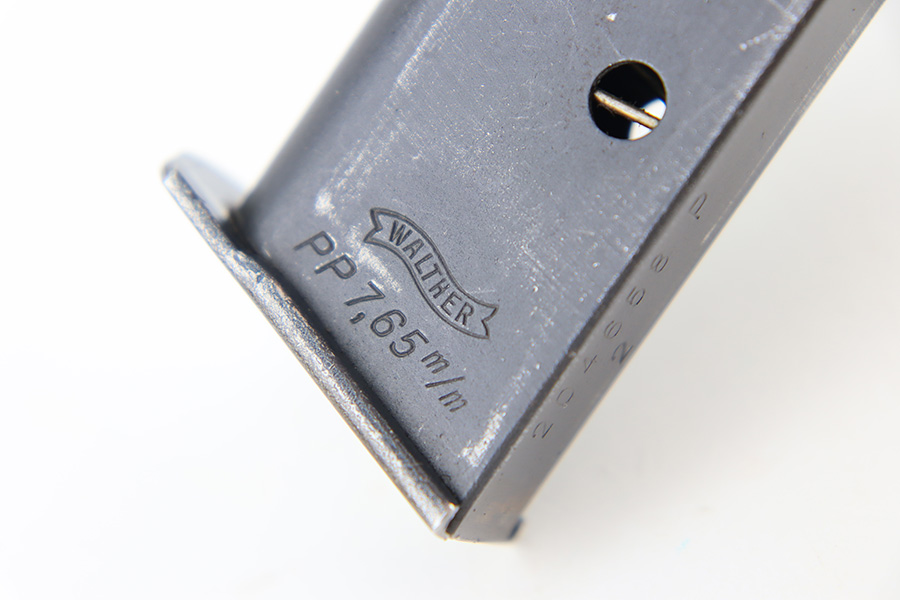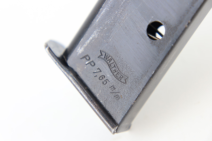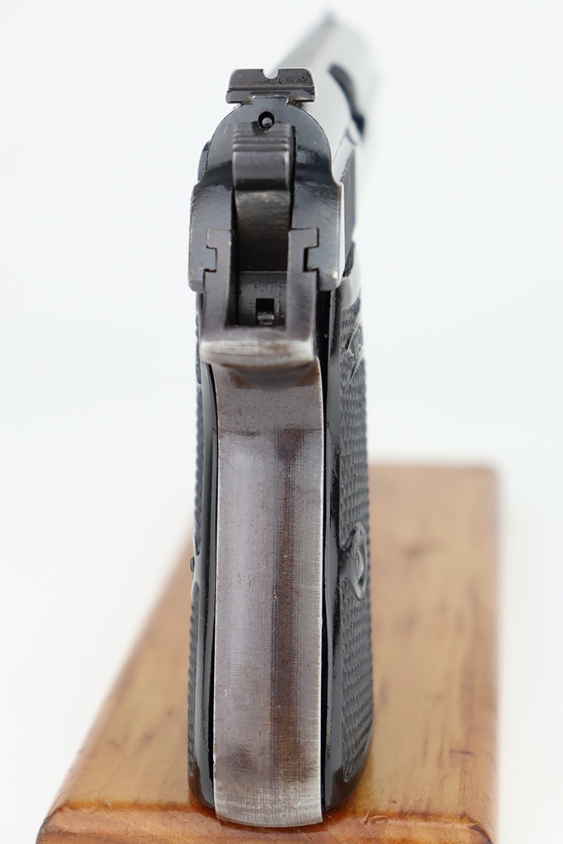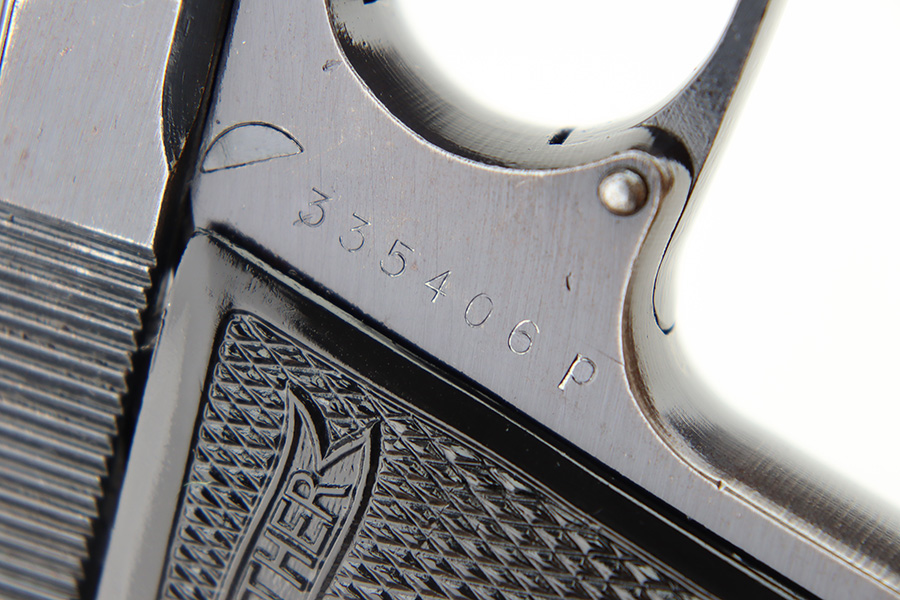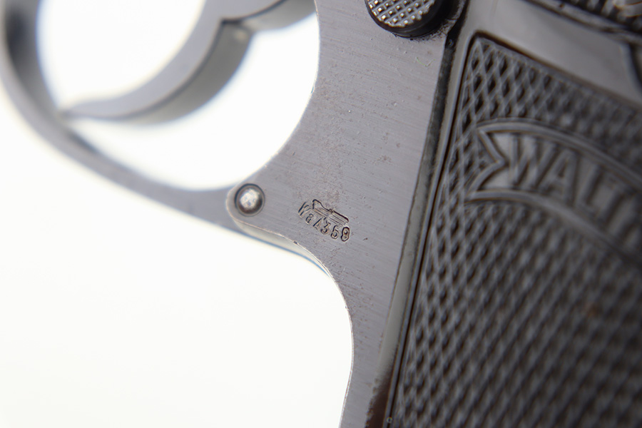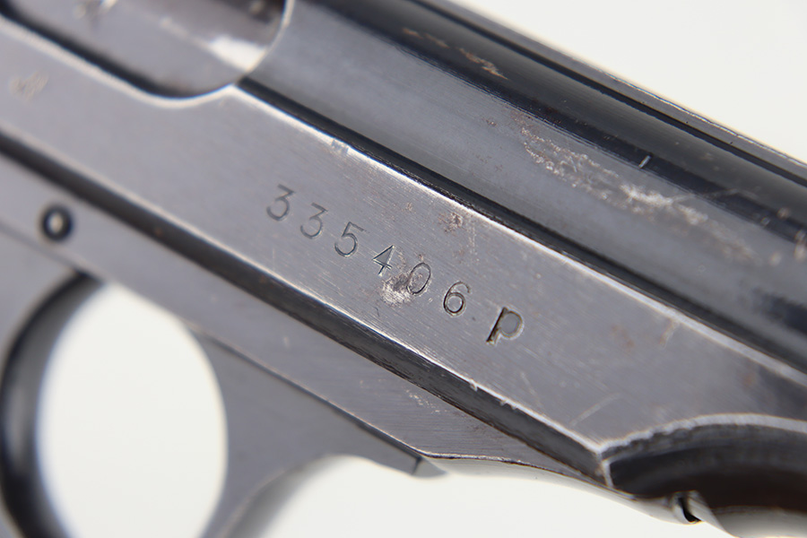 12/1/23 – This is a Walther PP issued to the German military in 1944. It is all matching with the proper “Waffen 359” military acceptance proofs. It comes as a rig with a fairly worn un-marked holster and two proper wartime magazines. The gun itself has retained about 94-95% of its original finish. There is some light brown patina on the grip straps and some light spotty wear on both sides of the slide. Fitted with period-correct black bakelite grips. Mint bore.