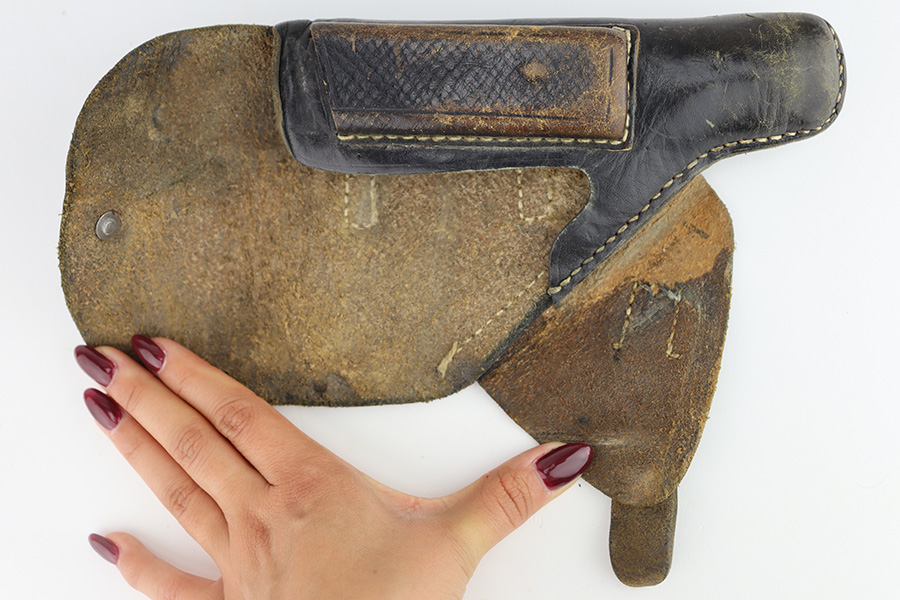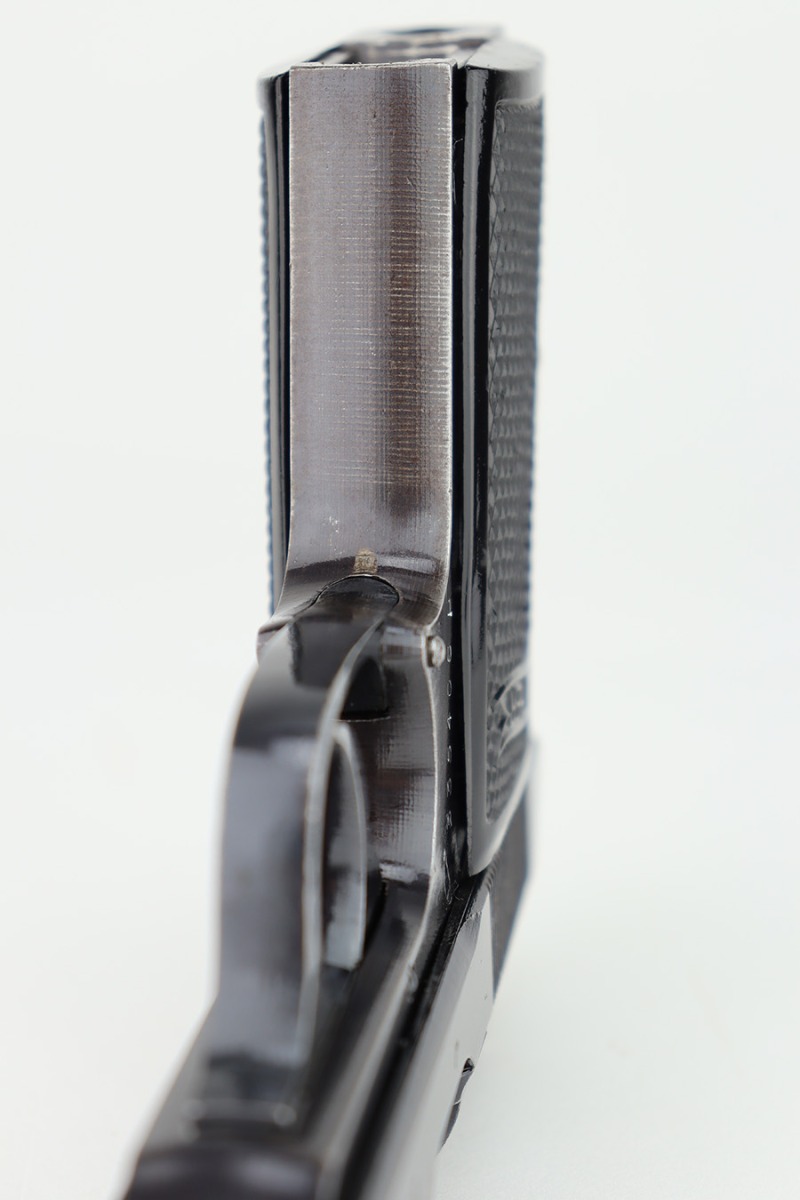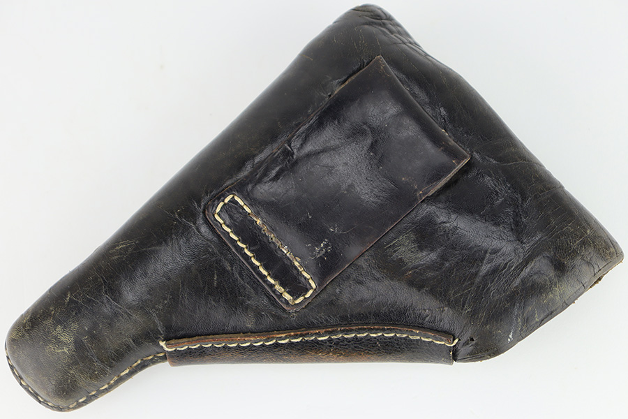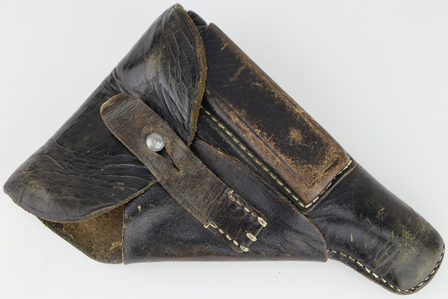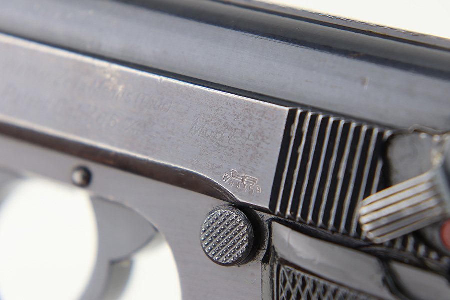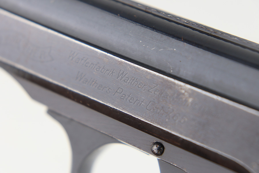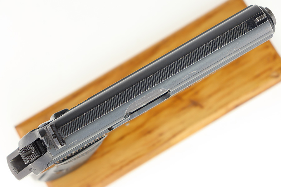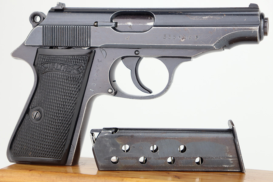 12/1/23 – This is a Walther PP issued to the German military in 1944. It is all matching with the proper “Waffen 359” military acceptance proofs. It comes as a rig with a fairly worn un-marked holster and two proper wartime magazines. The gun itself has retained about 94-95% of its original finish. There is some light brown patina on the grip straps and some light spotty wear on both sides of the slide. Fitted with period-correct black bakelite grips. Mint bore.