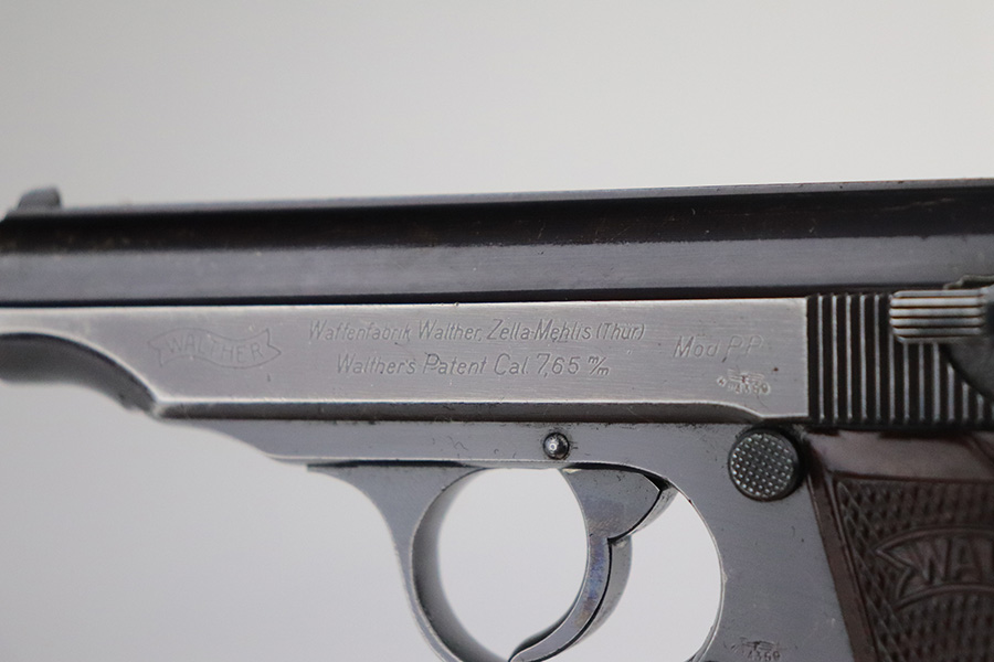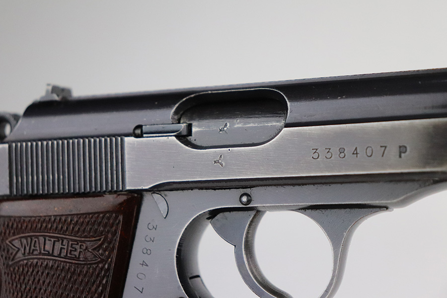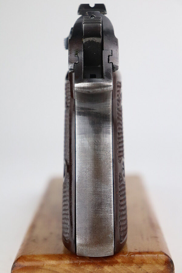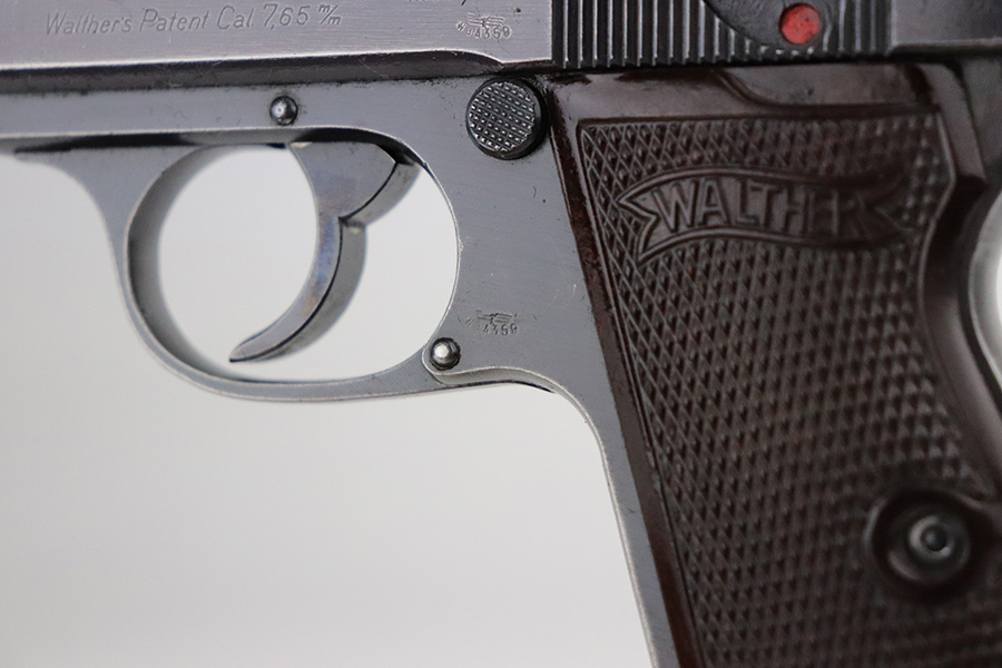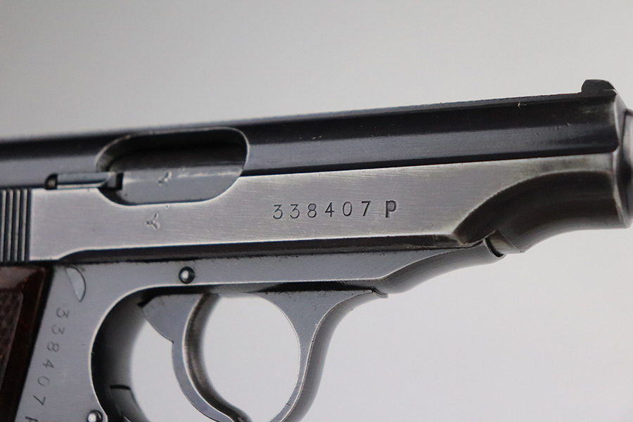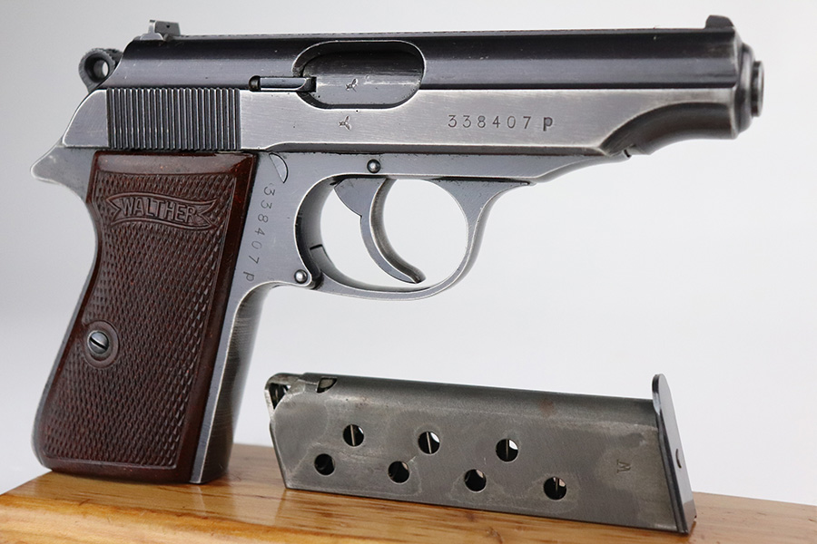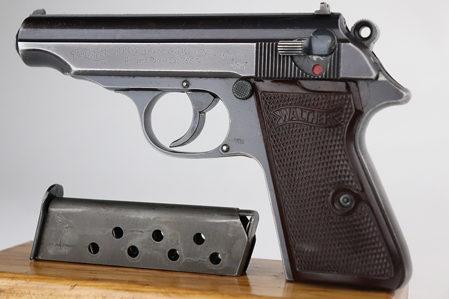 7/19/21 – This is a nice example of a Walther PP issued to the Nazi military in 1944. The gun is all matching and has the proper “Waffen 359” military proofs. It comes with an excellent black leather post-WW2 holster and a rare late-war “W” marked phosphate magazine. The gun has retained roughly 70% of its original finish. Most of the finish loss is on the straps, but there is also wear on the high edges of the slide and around the muzzle. Minor thinning on both sides of the slide. Comes with rare red Walther grips – small scuff on the left side. Mint bore.