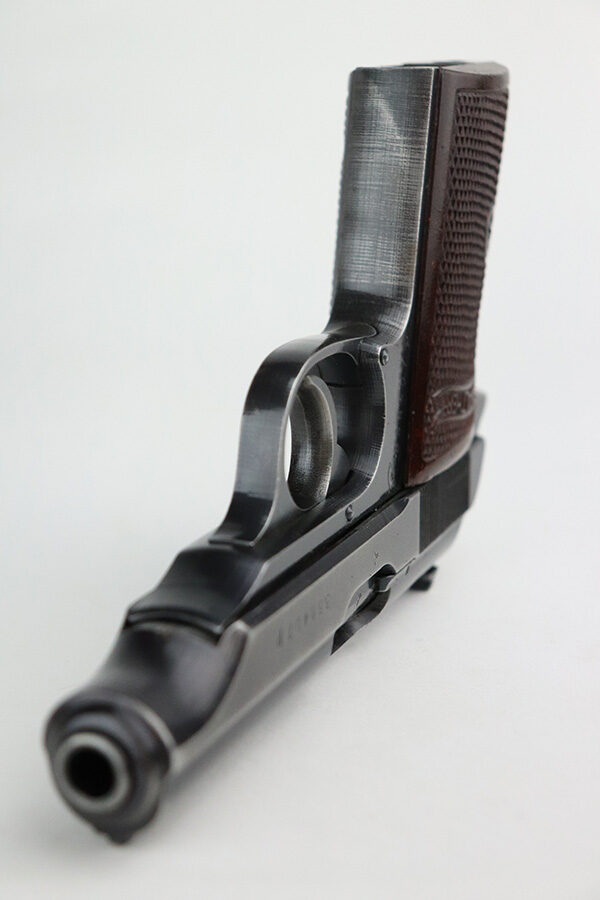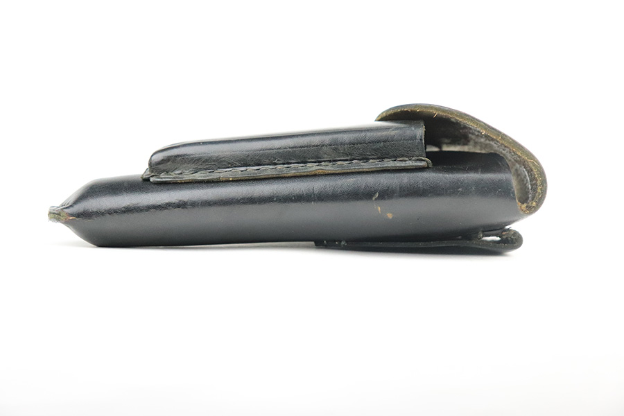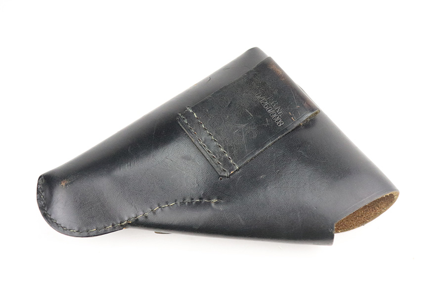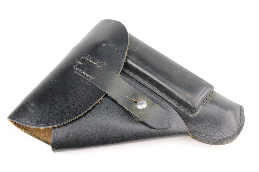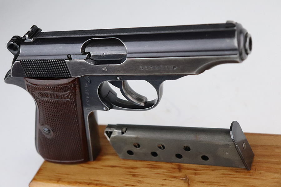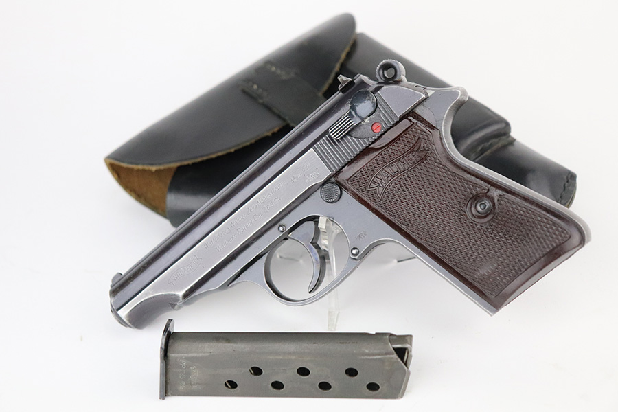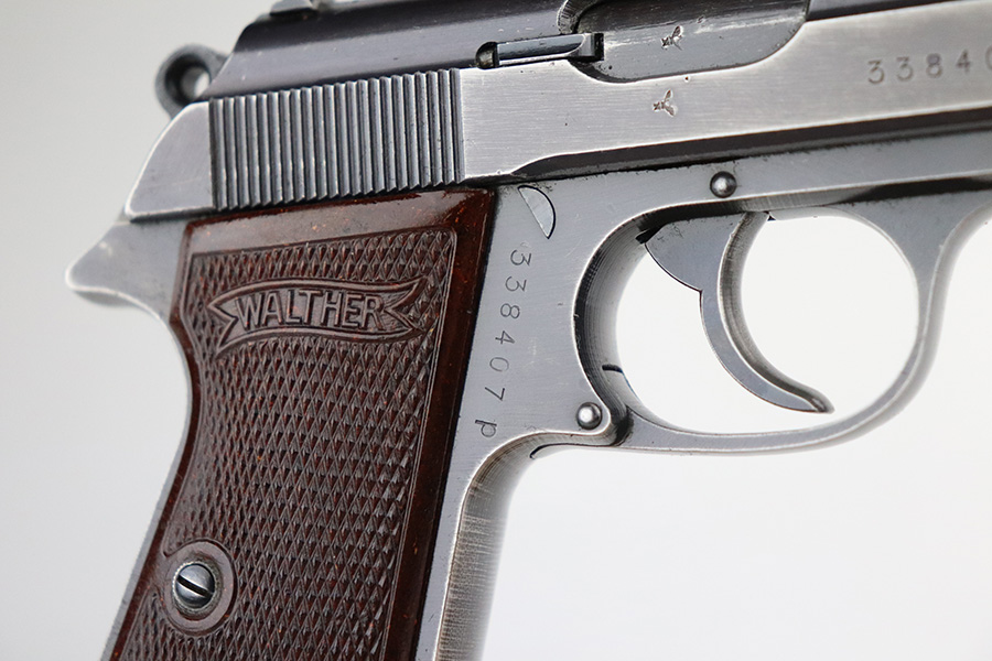 7/19/21 – This is a nice example of a Walther PP issued to the Nazi military in 1944. The gun is all matching and has the proper “Waffen 359” military proofs. It comes with an excellent black leather post-WW2 holster and a rare late-war “W” marked phosphate magazine. The gun has retained roughly 70% of its original finish. Most of the finish loss is on the straps, but there is also wear on the high edges of the slide and around the muzzle. Minor thinning on both sides of the slide. Comes with rare red Walther grips – small scuff on the left side. Mint bore.